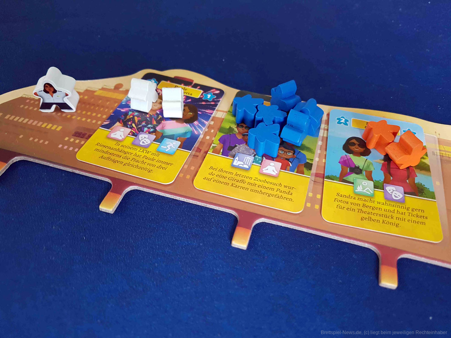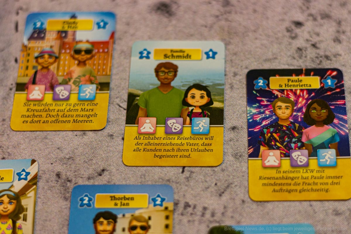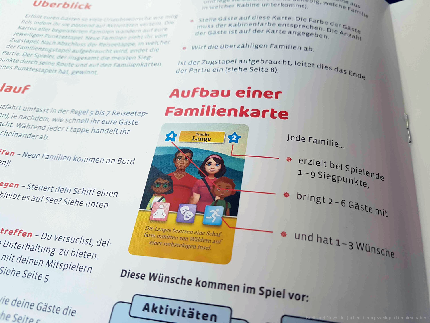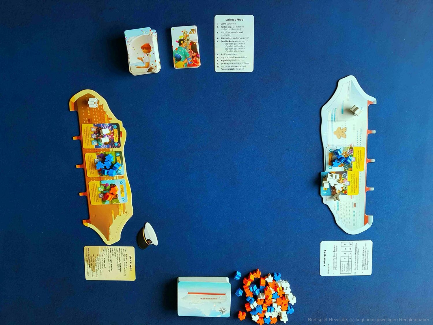 Dafür bekommen alle Spieler:innen ein Schiffstableau, auf welchem jeweils eine Gastfamilie platziert wird. Die Karte gibt nicht nur an, aus wie vielen Mitgliedern die Gastfamilie besteht und wie viele Holzfiguren demnach platziert werden müssen, sondern auch, welche Vorlieben die Reisenden haben.