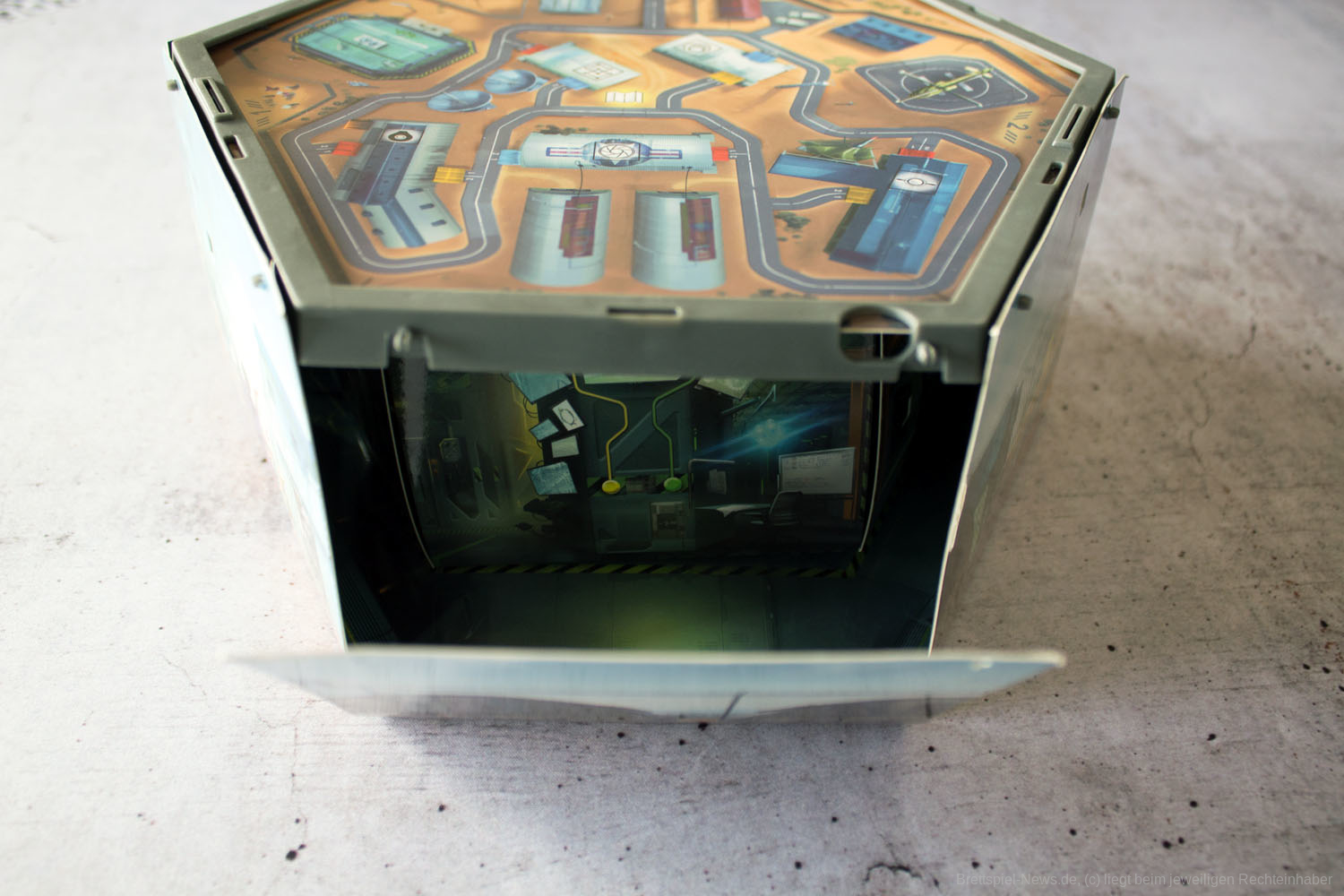 Auch beim Rätseln mit der Box hat sich nicht viel geändert. Zu zweit lässt sich das Herumdrehen und Herumreichen der Box noch einigermaßen gut handhaben. Sobald allerdings mehr Personen am Tisch zusammenkommen, die alle gleichermaßen rätseln möchten, wird es schnell schwierig. Verbessert hat sich dafür das Vordringen in den Kern der Box. Bei ALCATRAZ war es noch so, dass der Weg in den Kern der Schachtel am Ende einen Ausbruch aus dem Komplex bedeutete und somit kontra-immersiv war. Bei AREA 51 geht es konsequent immer weiter in das Innere des Gebäudes, was der Atmosphäre natürlich deutlich besser zugutekommt.