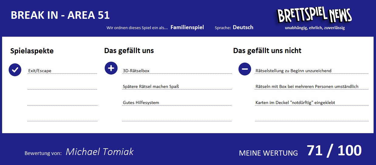 Die Frage, wem ich BREAK IN – AREA 51 empfehlen kann, ist leicht zu beantworten. Jedenfalls all denjenigen, die bereits Freude am Einbruch in ALCATRAZ hatten. Ihnen kann ich AREA 51 bedenkenlos ans Herz legen. Im Grunde bleibt hier alles beim Alten, nur im neuen Gewand. Wer allerdings bereits mit ALCATRAZ wenig Freude hatte, den wird auch hier kein Feuerwerk der guten Laune erwarten. Wer bislang noch keine Berührungspunkte mit BREAK IN hatte, sollte sich die von mir genannten Kritikpunkte durchlesen und überlegen, inwiefern diese Punkte für sie oder ihn entscheidend sind. Ich habe für mich erkannt, dass das BREAK IN-Spielsystem nichts für mich ist und ich mir meinen Rätselspaß in Zukunft woanders suchen werde.