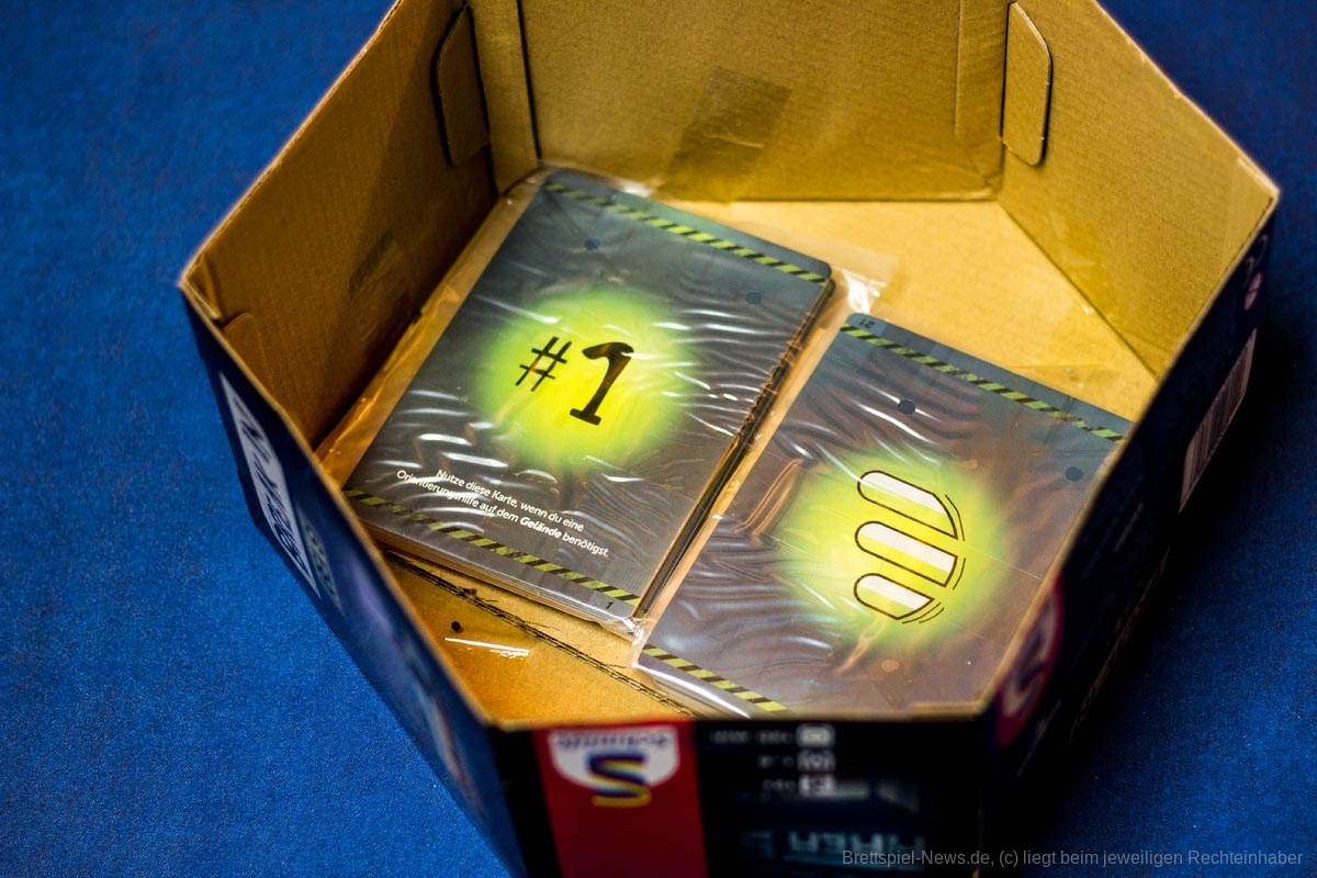 Bei der Verpackung hat sich zunächst nichts verändert. Die Karten kleben weiterhin im Deckel der Schachtel und der gesamte Aufbau mit den angeklickten Wänden wirkte ebenso instabil wie es bei dem vorhergehenden Spiel der Reihe der Fall war. Die Anleitung wurde, zumindest nicht erkennbar, überarbeitet, weswegen alle, die das erste BREAK IN noch nicht gespielt haben, ihre Probleme haben dürften, sich zu Beginn zurechtzufinden. Wir haben uns trotz Vorkenntnissen etwas schwergetan, uns in das Spiel einzufinden. Dies lag aber eher an den Rätseln, die uns kaum Anhaltspunkte dafür gaben, was nun eigentlich von uns erwartet wurde. Es hat ein bisschen gedauert, bis wir die Rätsel verstanden haben, und ohne die Hilfe der Richtungskarte „1“ wären wir wohl an dieser Stelle auch nicht so schnell weitergekommen. Erst nach dem Öffnen der Basis begann sich ein Spielfluss zu entwickeln.