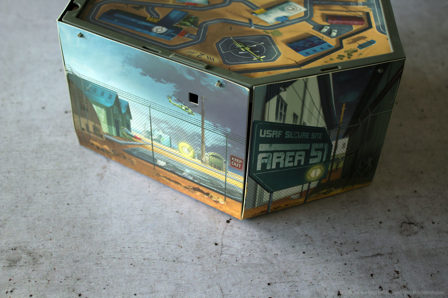 Auch beim Rätseln mit der Box hat sich nicht viel geändert. Zu zweit lässt sich das Herumdrehen und Herumreichen der Box noch einigermaßen gut handhaben. Sobald allerdings mehr Personen am Tisch zusammenkommen, die alle gleichermaßen rätseln möchten, wird es schnell schwierig. Verbessert hat sich dafür das Vordringen in den Kern der Box. Bei ALCATRAZ war es noch so, dass der Weg in den Kern der Schachtel am Ende einen Ausbruch aus dem Komplex bedeutete und somit kontra-immersiv war. Bei AREA 51 geht es konsequent immer weiter in das Innere des Gebäudes, was der Atmosphäre natürlich deutlich besser zugutekommt.