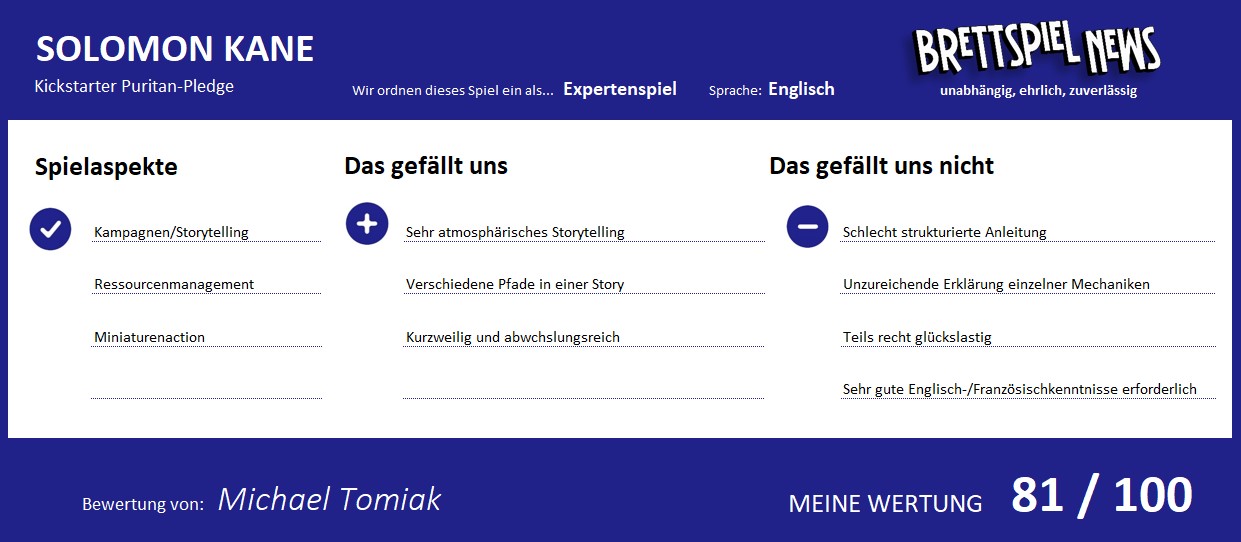 Doch auch wenn Spiel Defizite bei der Anleitung hat, macht es mir dennoch immer wieder großen Spaß, in seine düstere Welt einzutauchen und SOLOMON KANE bei der Auslöschung des Bösen voranzutreiben. SOLOMON KANE ist ein Kickstarter, bei dem ich nicht nur froh bin, dass ich ihn unterstützt habe, sondern bei dem ich mich richtig ärgere, dass ich mir die Erweiterungen nicht auch noch bestellt habe. Bleibt nur zu hoffen, dass noch genügend Erweiterungen aus der Überproduktion in den Mythic-Games-Shop kommen, damit ich die Story-Sammlung vervollständigen kann. Wer Lust auf Ameritrash mit düsterer Atmosphäre und erzählerischer Tiefe bekommen hat, sollte den Mythic-Games-Shop auf jeden Fall im Auge behalten, da auch das Grundspiel nach der kompletten Auslieferung dort angeboten werden soll, soweit noch Exemplare aus der Produktion vorhanden sind.