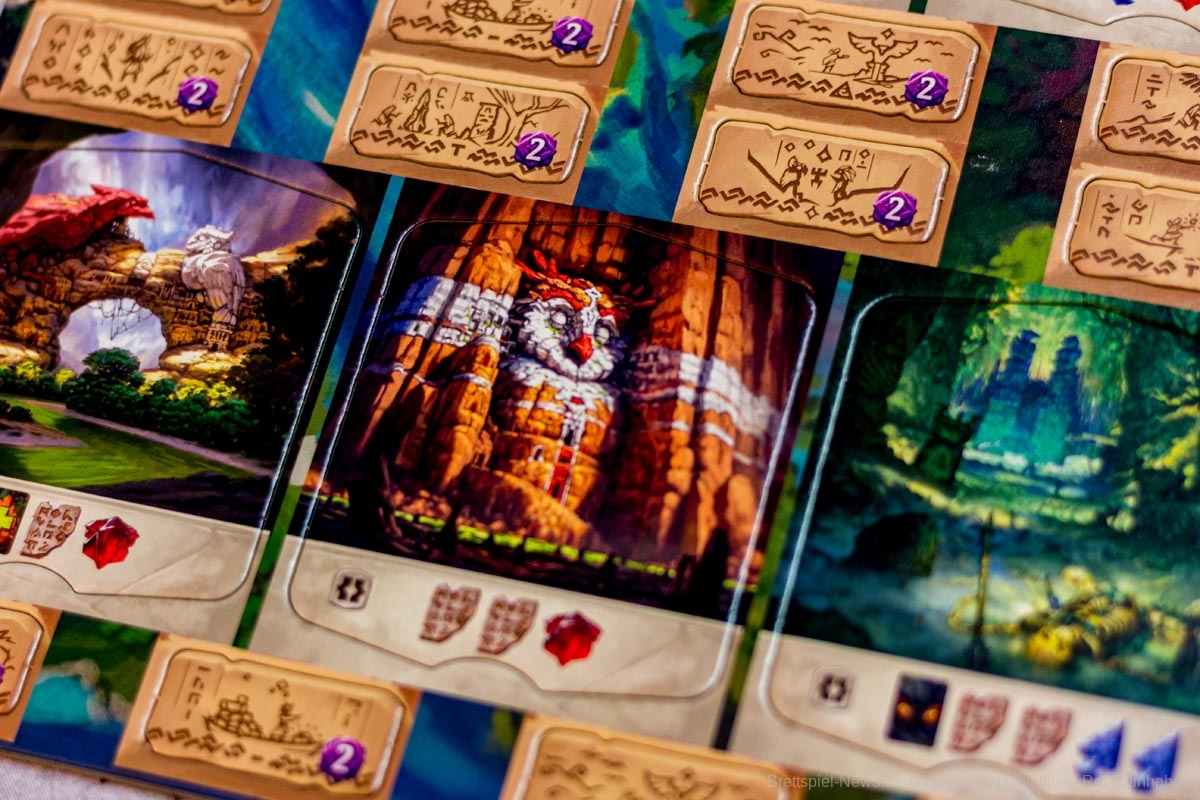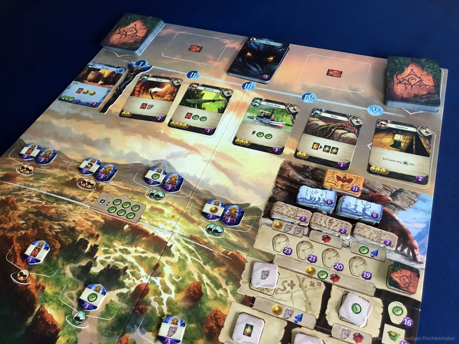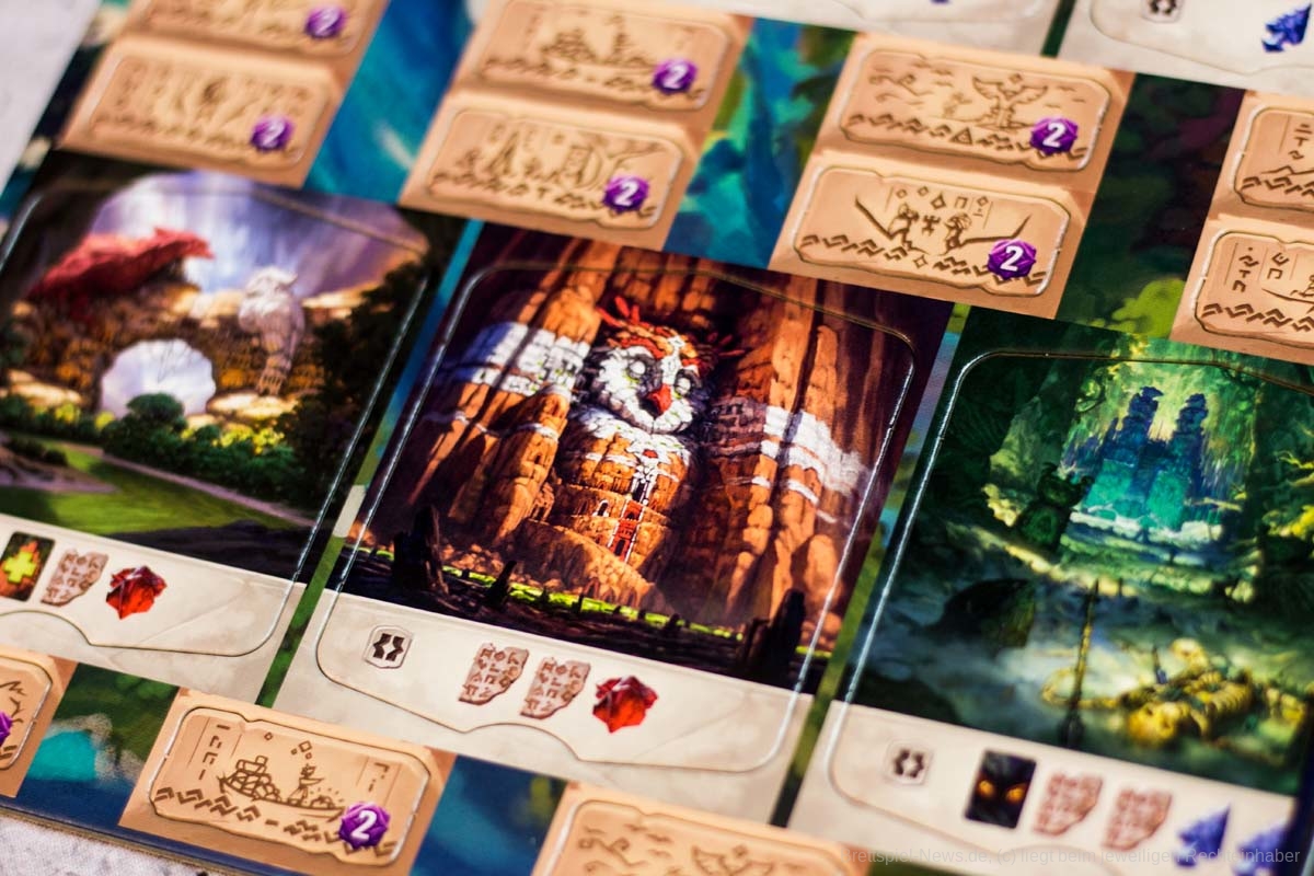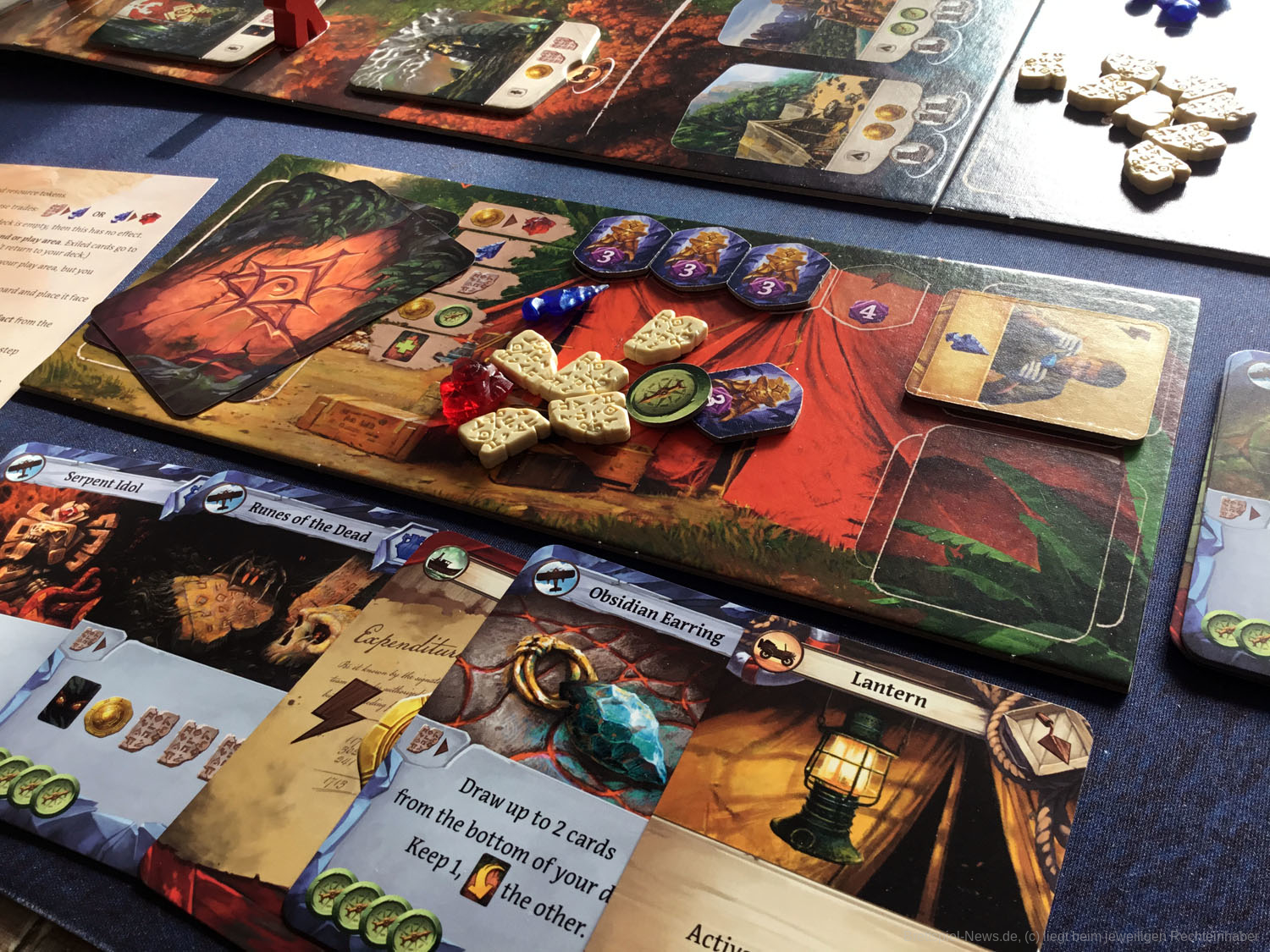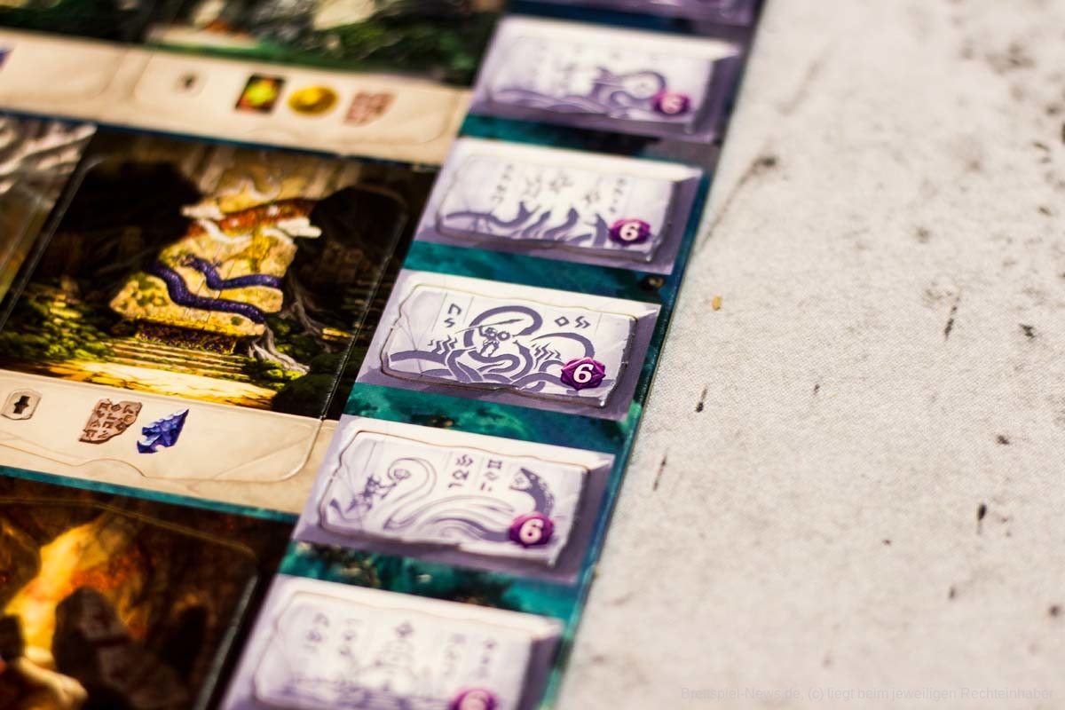 Auch der Deckbau funktioniert im Spiel nur bedingt, denn so häufig rotiert das eigene Kartendeck nicht. Ausrüstungskarten, die am Anfang gekauft werden, kommen vielleicht nur ein- oder zweimal zum Einsatz. Artefakte bringen oft mehr Punkte am Ende und können einmalig sofort genutzt werden. In späteren Runden müssen Artefakteffekte durch Steinplatten bezahlt werden und auch das mag mechanisch in Ordnung sein, Sinn ergibt es für mich nicht. Und leider ist natürlich auch die Kartenauslage völlig dem Glück unterworfen.