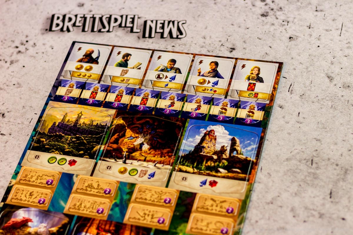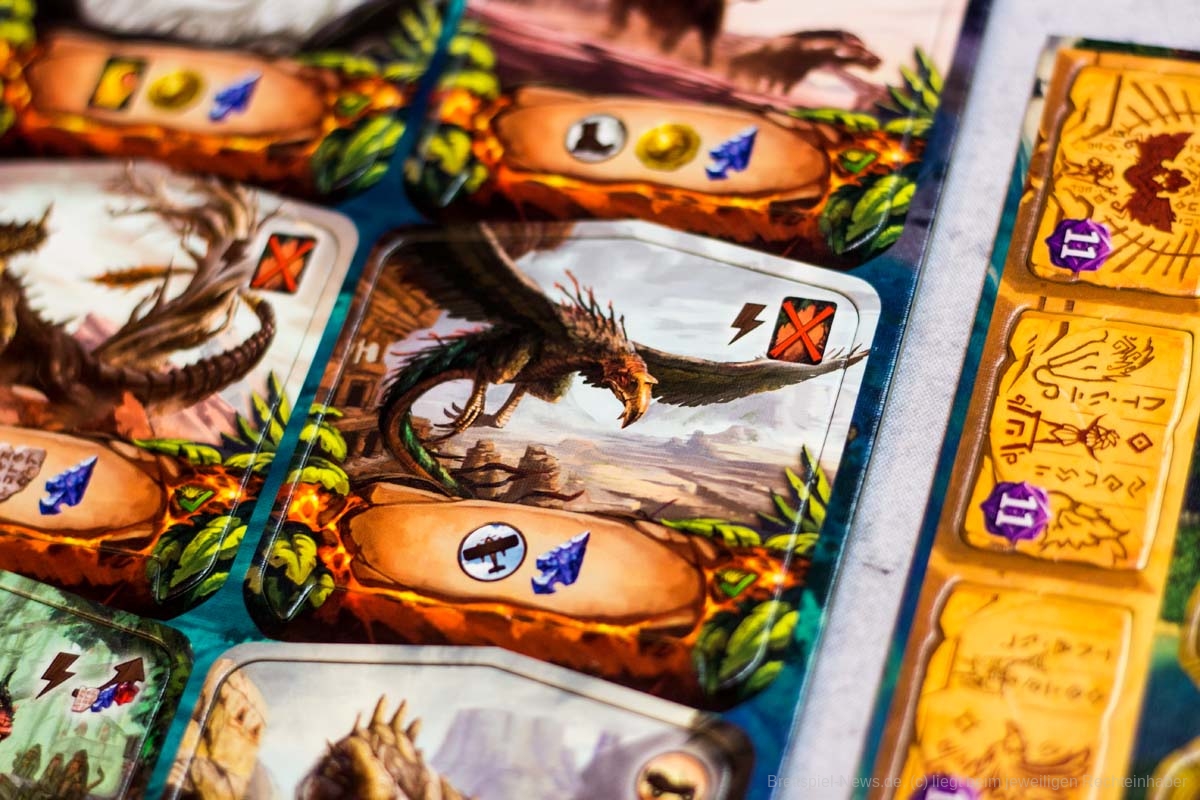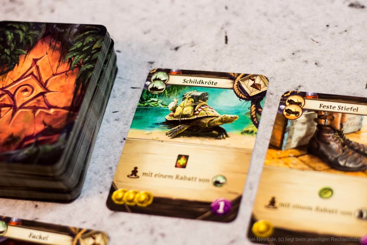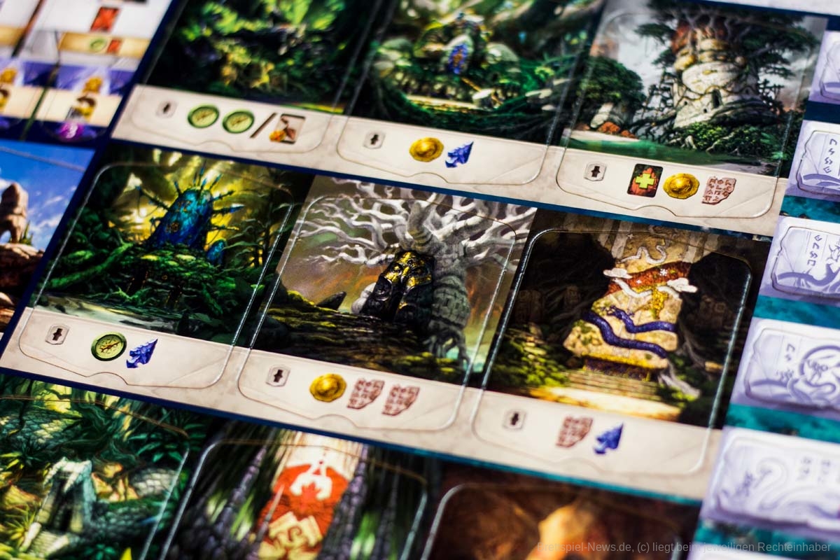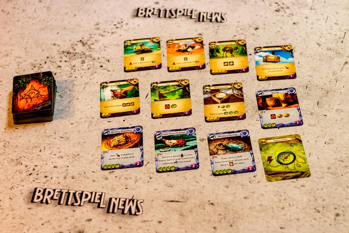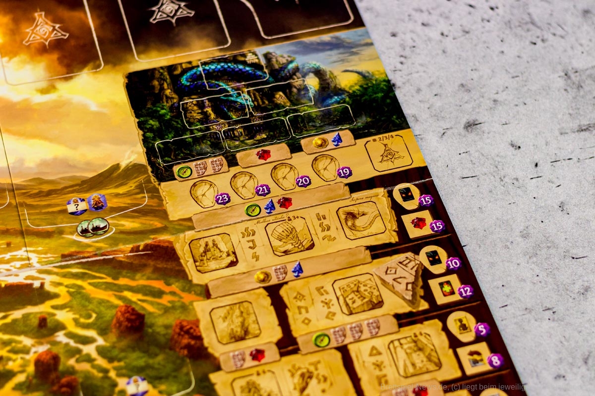 Auch der Deckbau funktioniert im Spiel nur bedingt, denn so häufig rotiert das eigene Kartendeck nicht. Ausrüstungskarten, die am Anfang gekauft werden, kommen vielleicht nur ein- oder zweimal zum Einsatz. Artefakte bringen oft mehr Punkte am Ende und können einmalig sofort genutzt werden. In späteren Runden müssen Artefakteffekte durch Steinplatten bezahlt werden und auch das mag mechanisch in Ordnung sein, Sinn ergibt es für mich nicht. Und leider ist natürlich auch die Kartenauslage völlig dem Glück unterworfen.