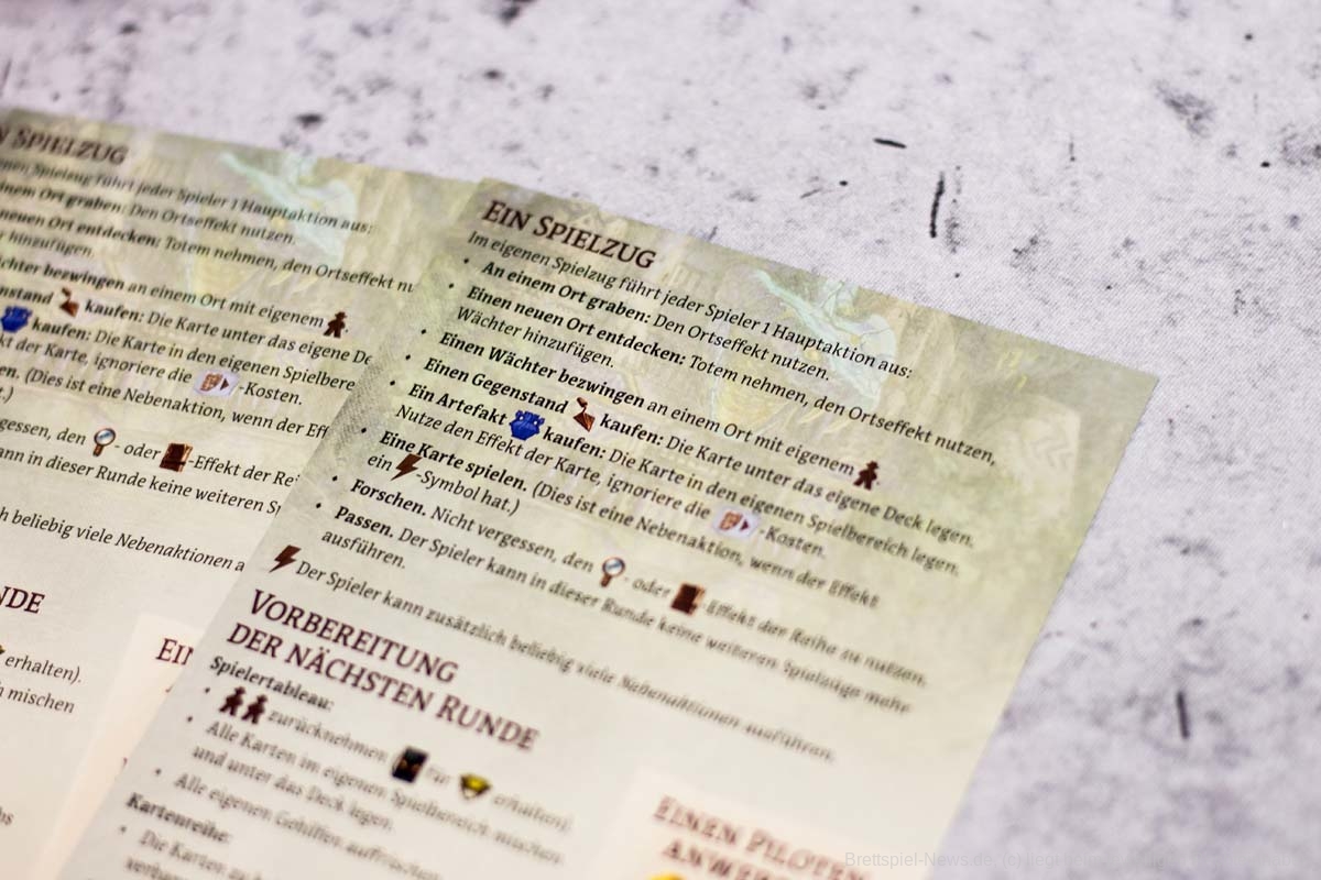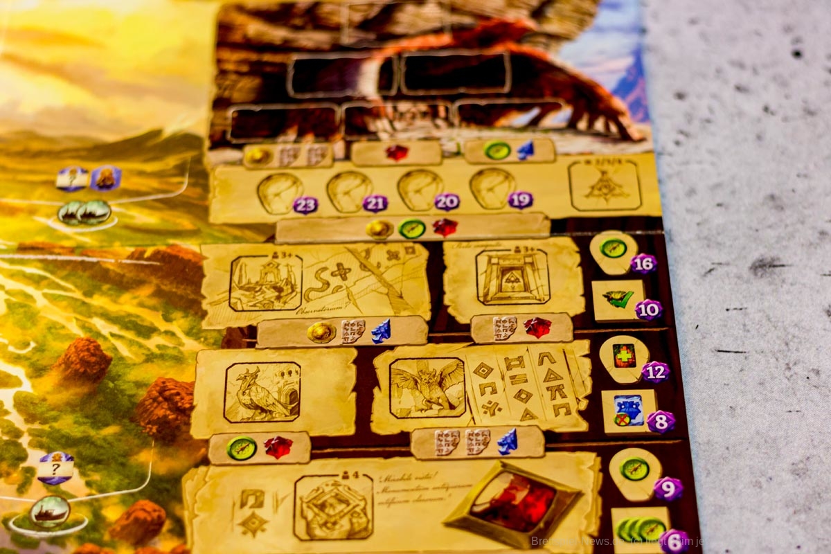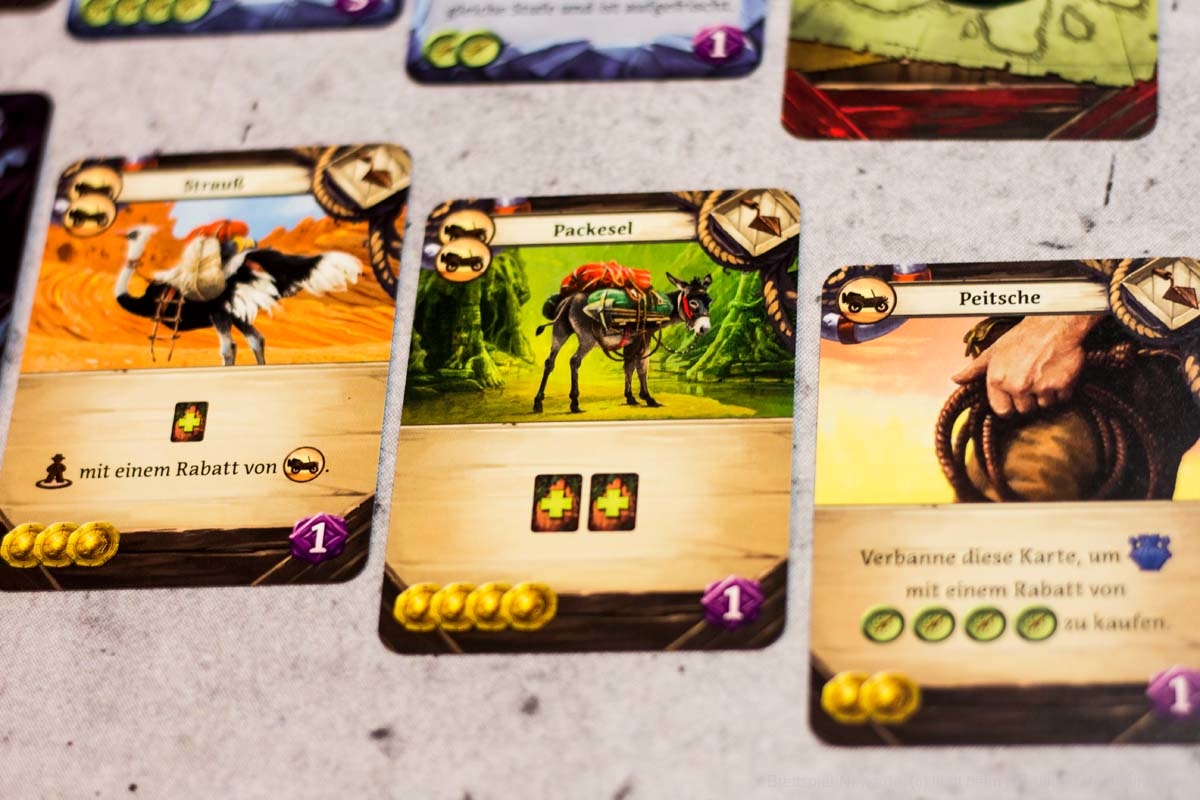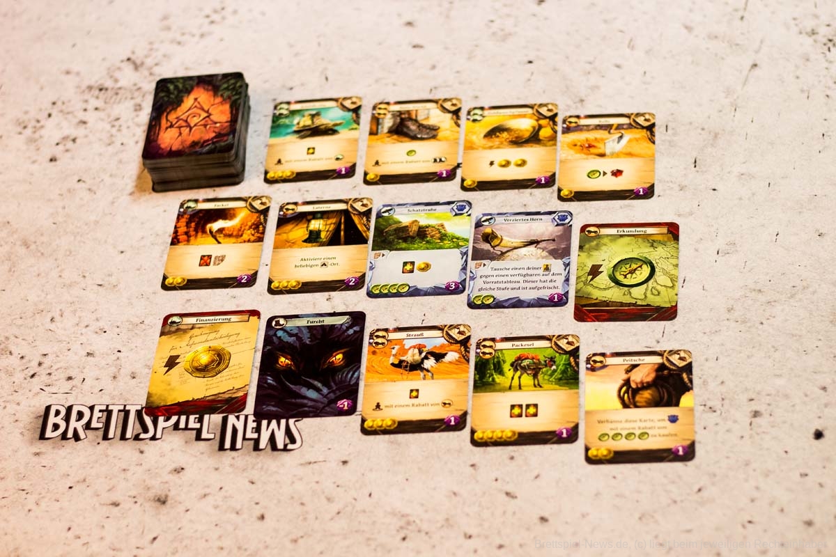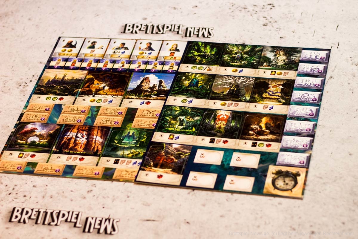 Auch der Deckbau funktioniert im Spiel nur bedingt, denn so häufig rotiert das eigene Kartendeck nicht. Ausrüstungskarten, die am Anfang gekauft werden, kommen vielleicht nur ein- oder zweimal zum Einsatz. Artefakte bringen oft mehr Punkte am Ende und können einmalig sofort genutzt werden. In späteren Runden müssen Artefakteffekte durch Steinplatten bezahlt werden und auch das mag mechanisch in Ordnung sein, Sinn ergibt es für mich nicht. Und leider ist natürlich auch die Kartenauslage völlig dem Glück unterworfen.