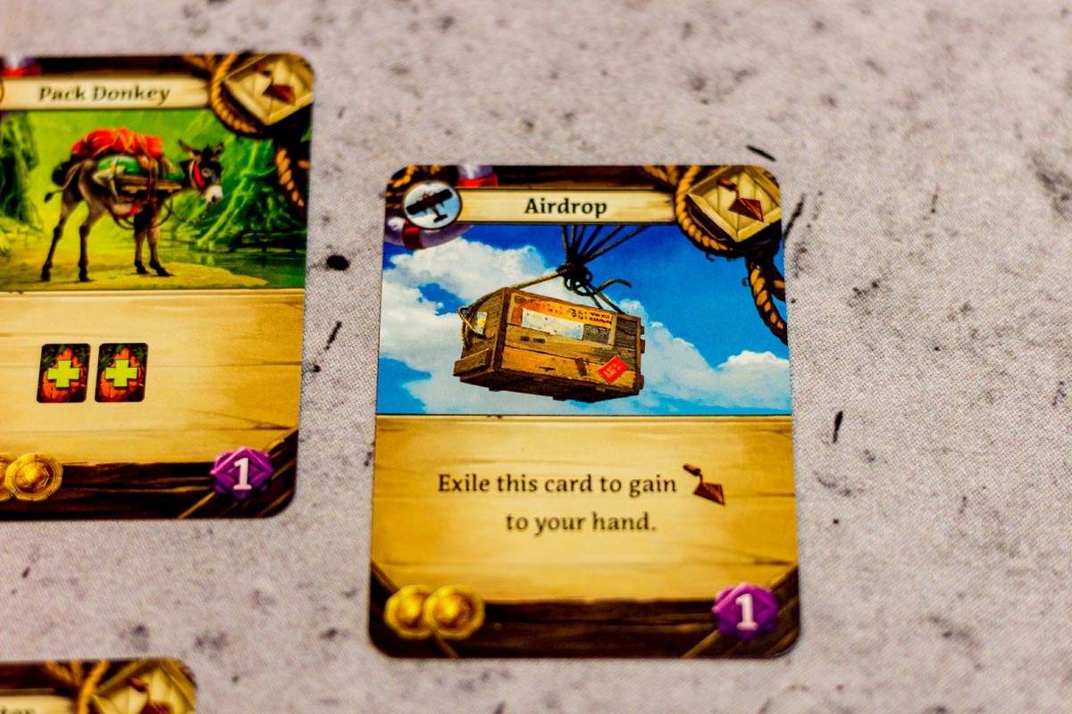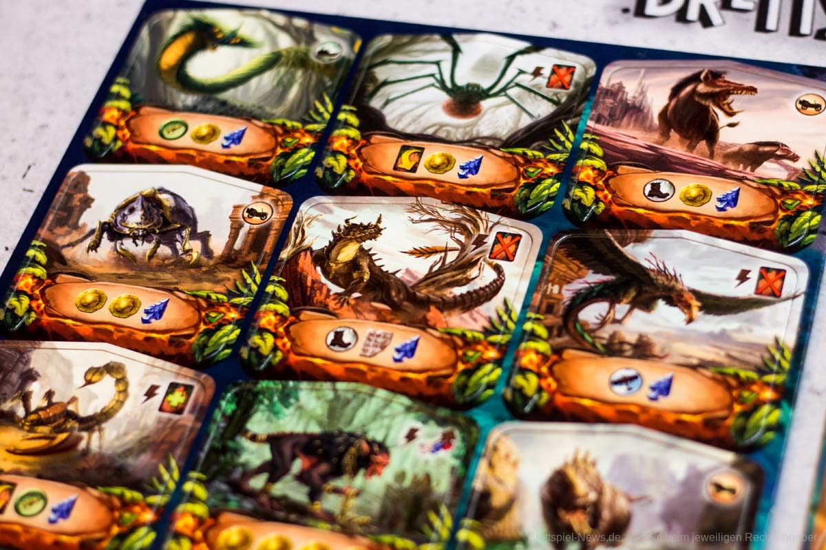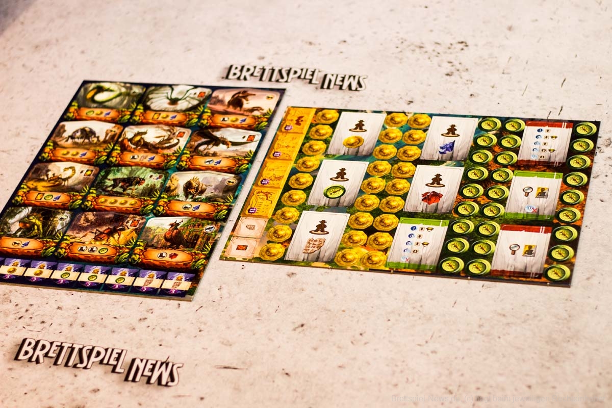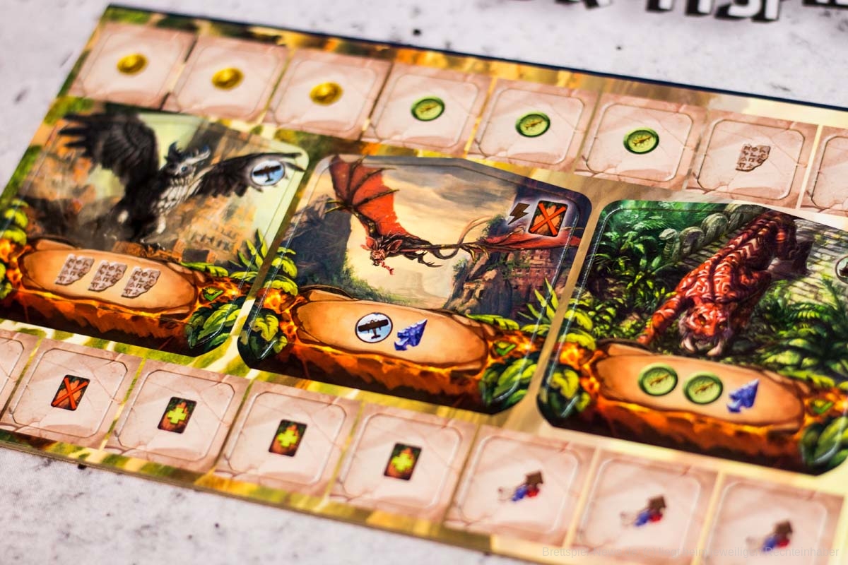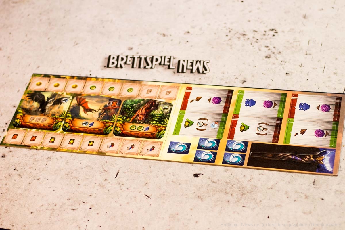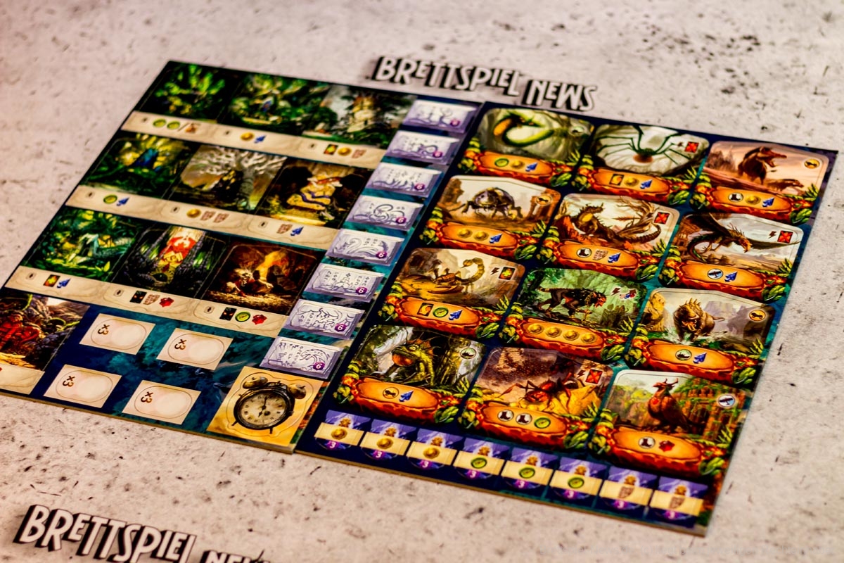 Auch der Deckbau funktioniert im Spiel nur bedingt, denn so häufig rotiert das eigene Kartendeck nicht. Ausrüstungskarten, die am Anfang gekauft werden, kommen vielleicht nur ein- oder zweimal zum Einsatz. Artefakte bringen oft mehr Punkte am Ende und können einmalig sofort genutzt werden. In späteren Runden müssen Artefakteffekte durch Steinplatten bezahlt werden und auch das mag mechanisch in Ordnung sein, Sinn ergibt es für mich nicht. Und leider ist natürlich auch die Kartenauslage völlig dem Glück unterworfen.