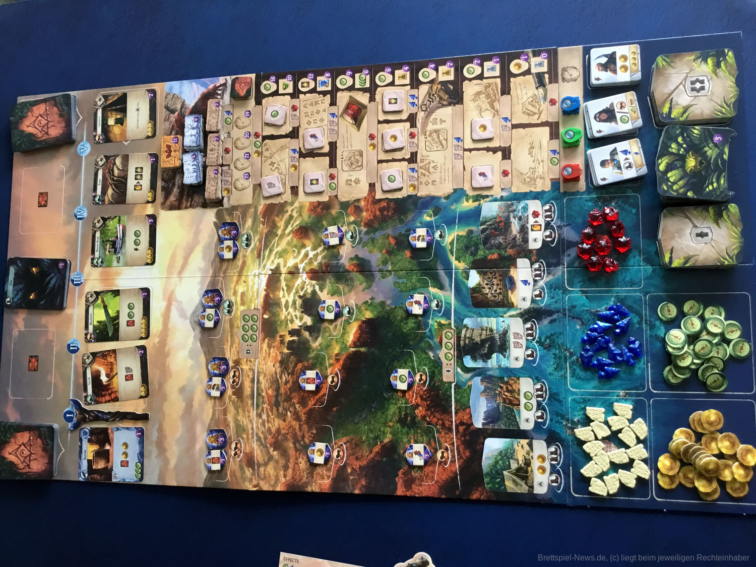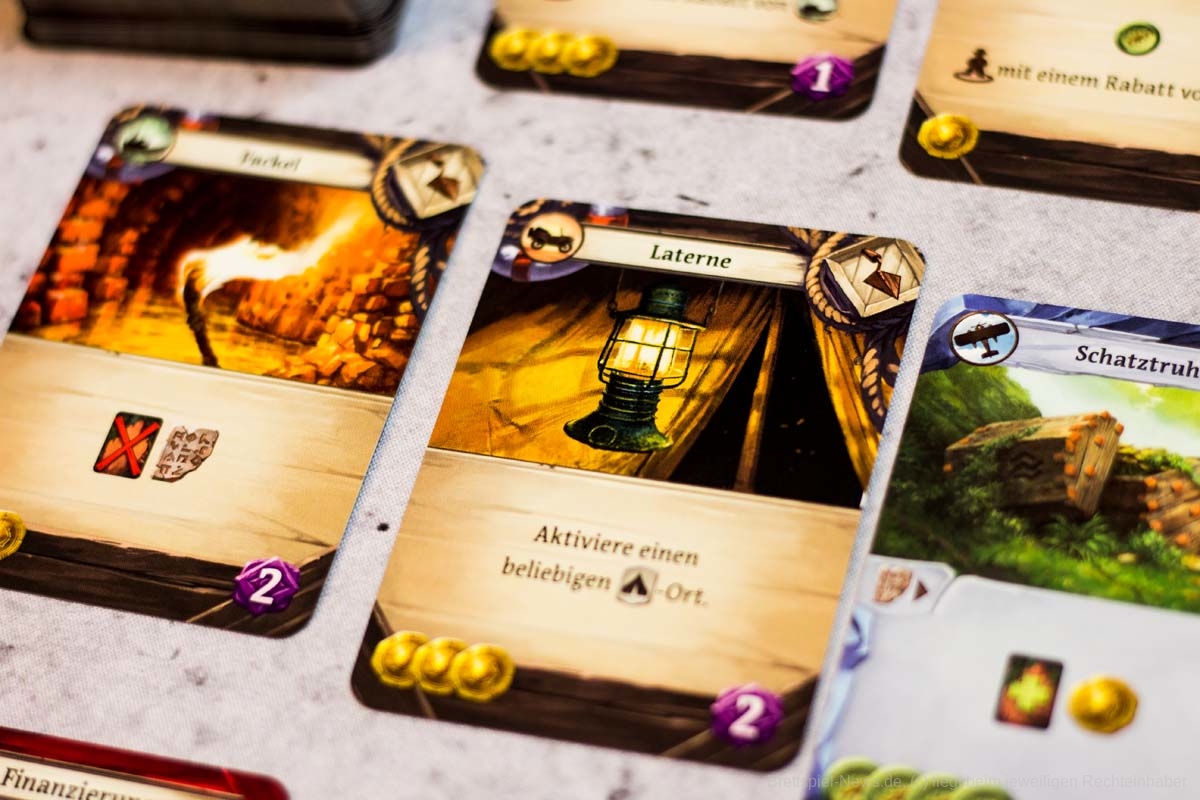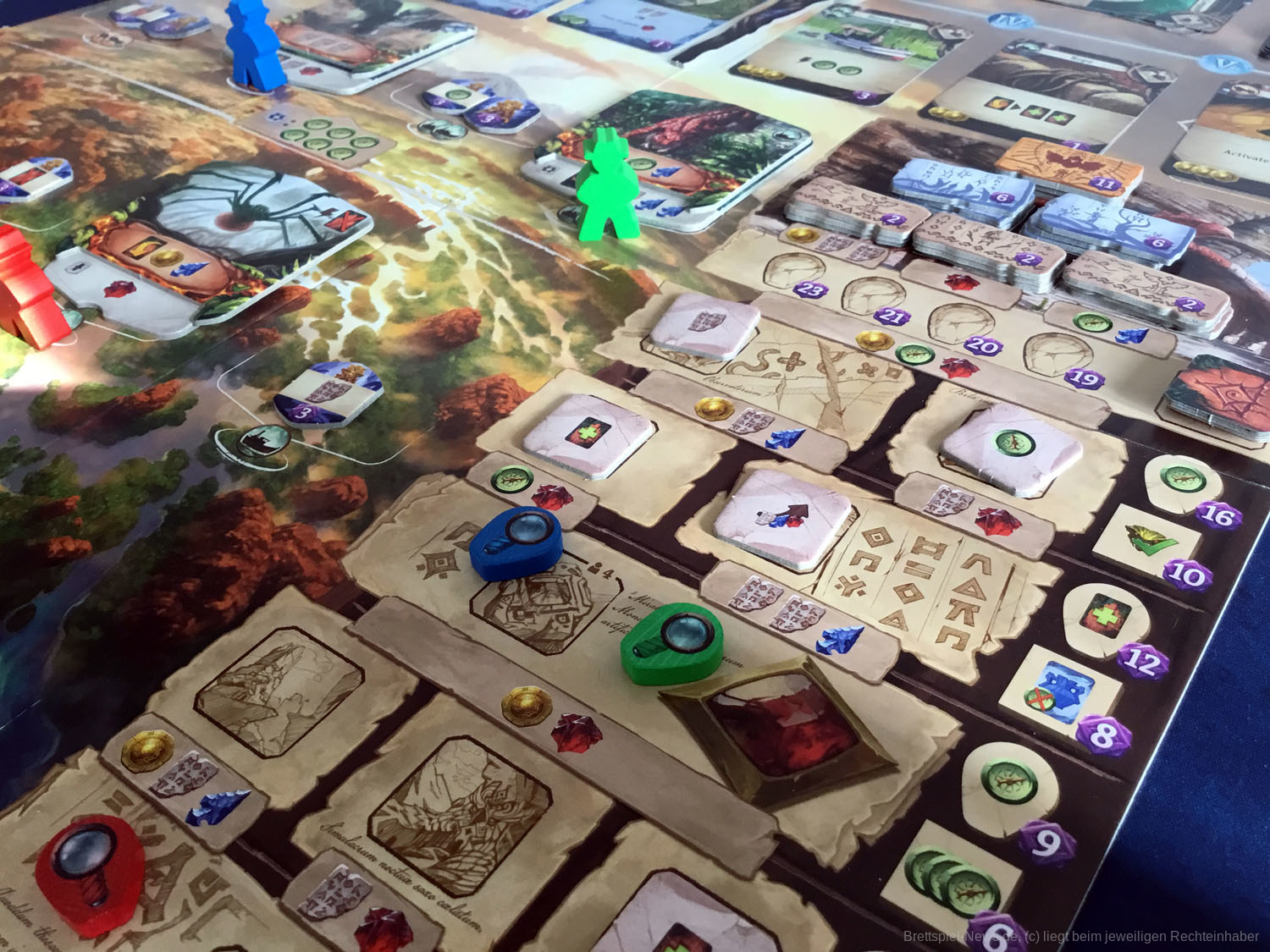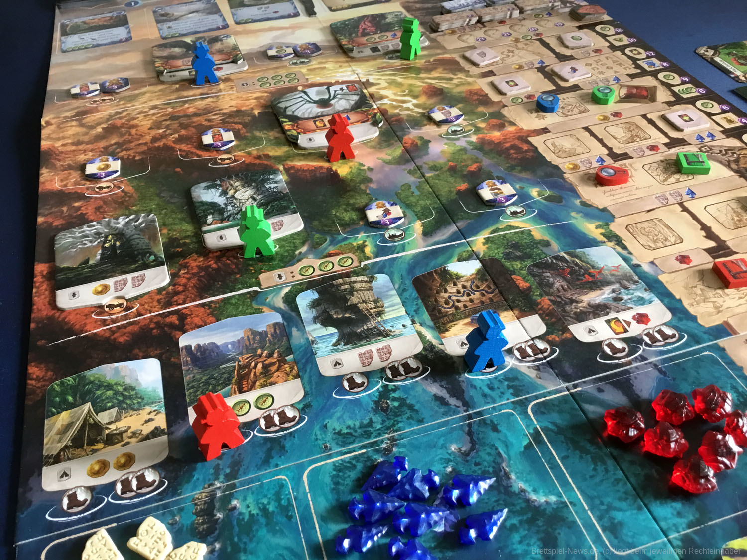 Im Kern ist das Spiel ein typisches Eurogame. Es werden Arbeiter eingesetzt, Ressourcen müssen gesammelt und Kosten bezahlt werden. Die Orte können immer nur von einem Spieler aufgesucht werden und so erstreckt sich die gesamte Interaktion mit anderen Spielern auf das Wegschnappen von Orten, Karten oder Plättchen. Das ist nicht schlimm, fühlt sich manchmal aber etwas einsam an. Ein echtes Abenteuer braucht eigentlich auch einen Gegenspieler und unerwartete Wendungen.