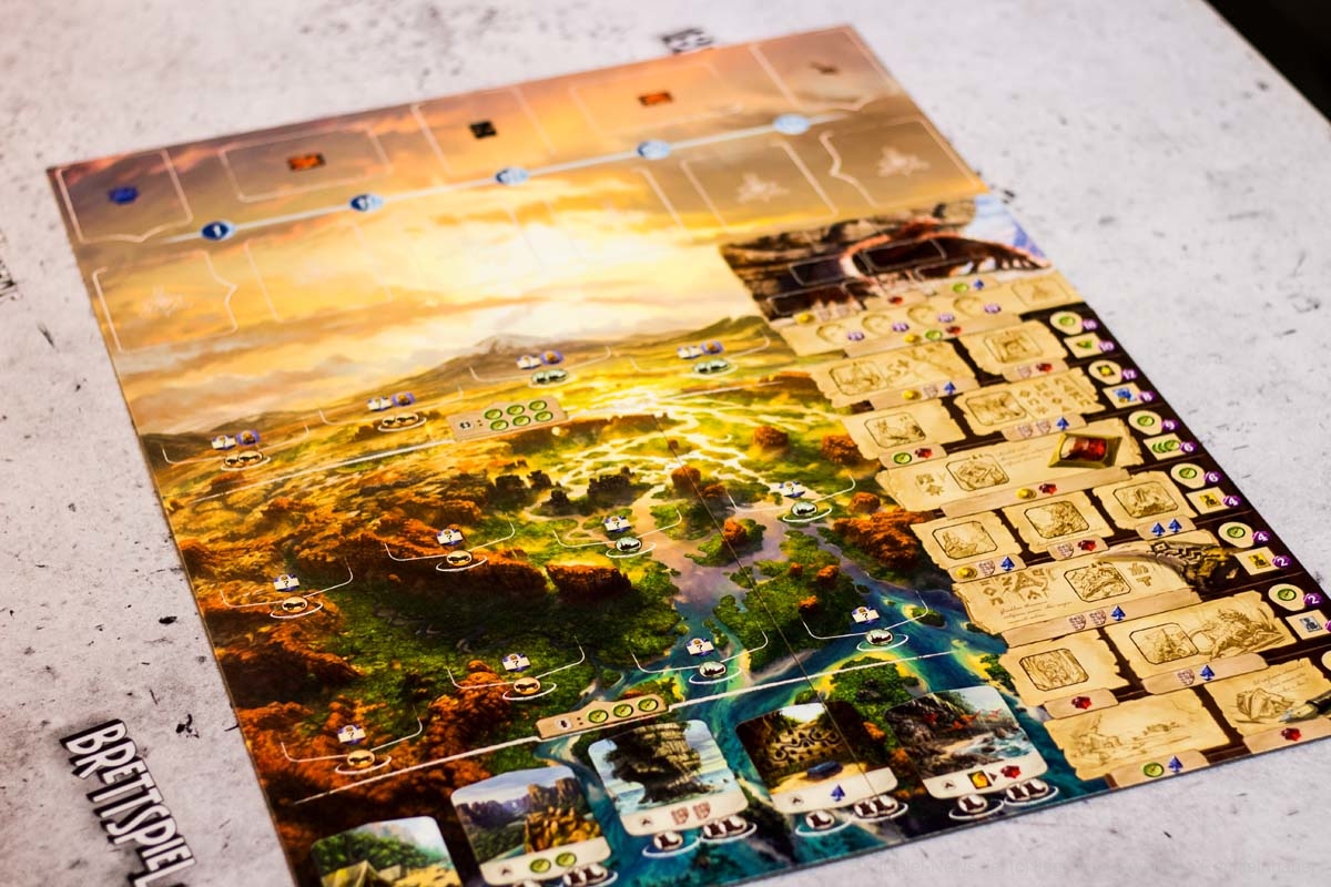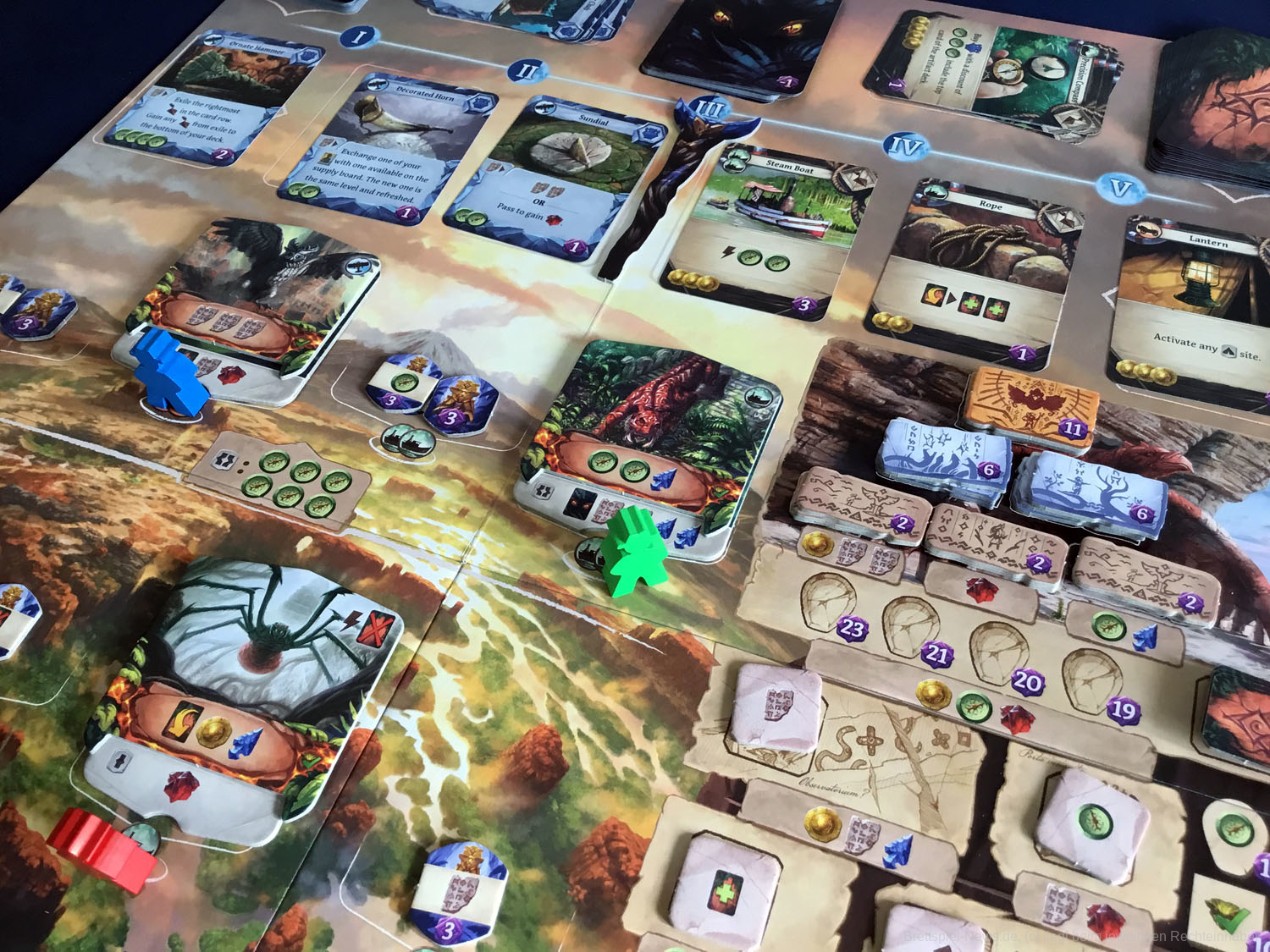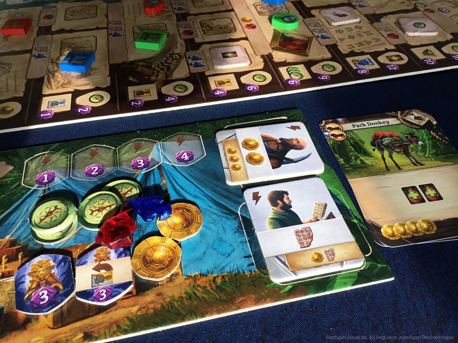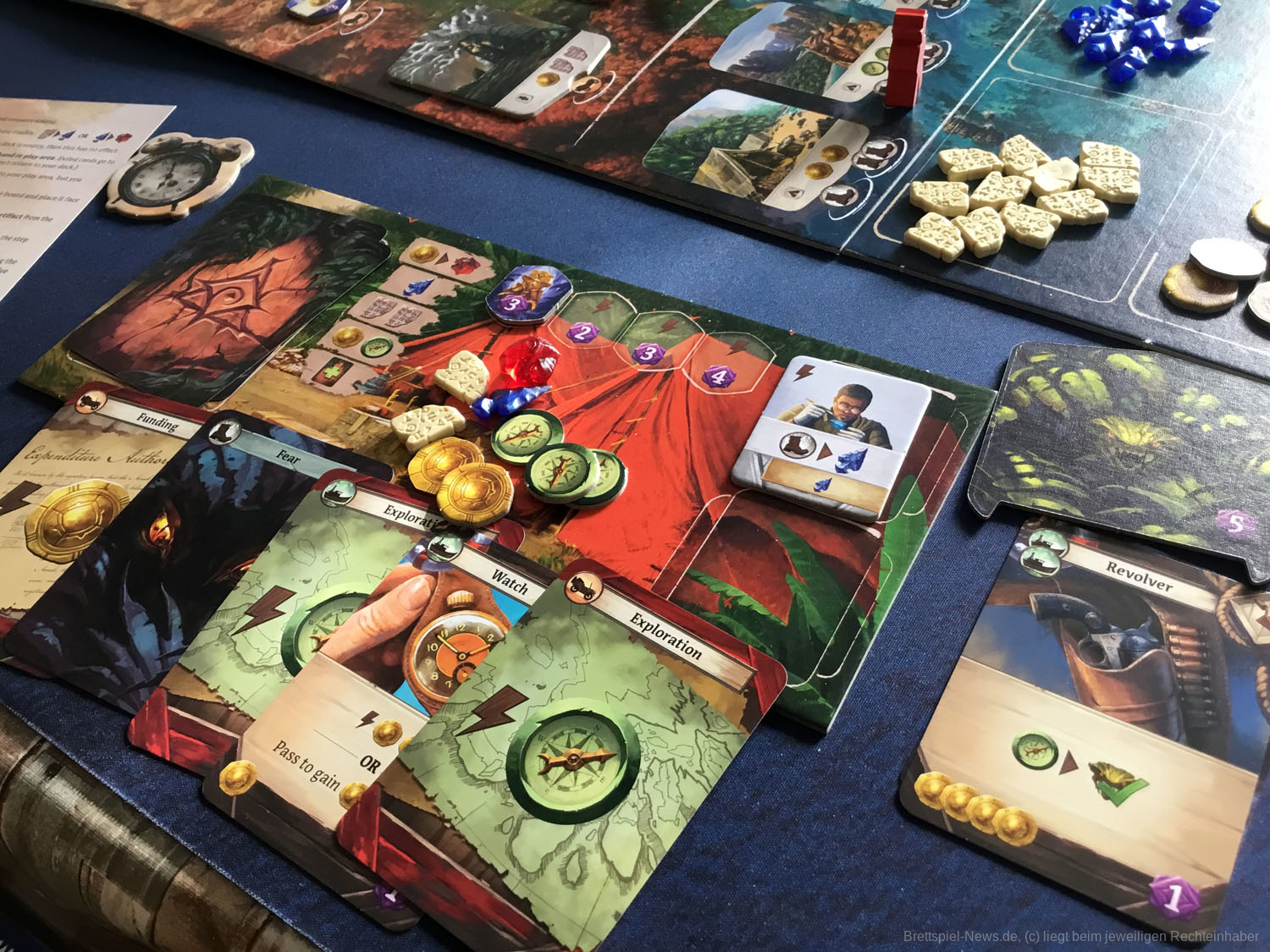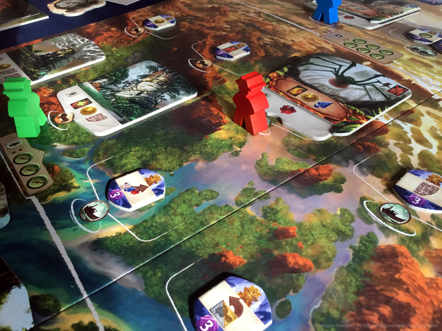 Im Kern ist das Spiel ein typisches Eurogame. Es werden Arbeiter eingesetzt, Ressourcen müssen gesammelt und Kosten bezahlt werden. Die Orte können immer nur von einem Spieler aufgesucht werden und so erstreckt sich die gesamte Interaktion mit anderen Spielern auf das Wegschnappen von Orten, Karten oder Plättchen. Das ist nicht schlimm, fühlt sich manchmal aber etwas einsam an. Ein echtes Abenteuer braucht eigentlich auch einen Gegenspieler und unerwartete Wendungen.