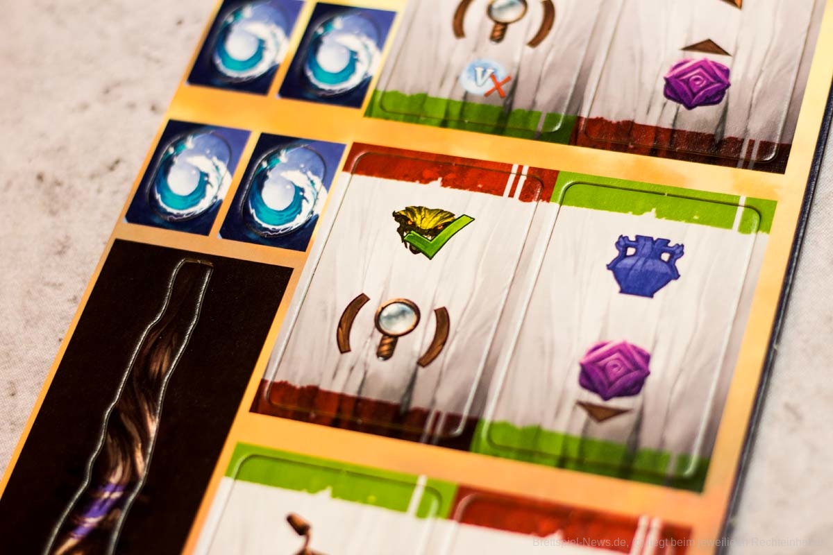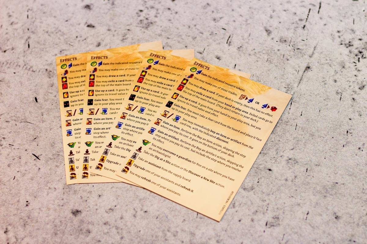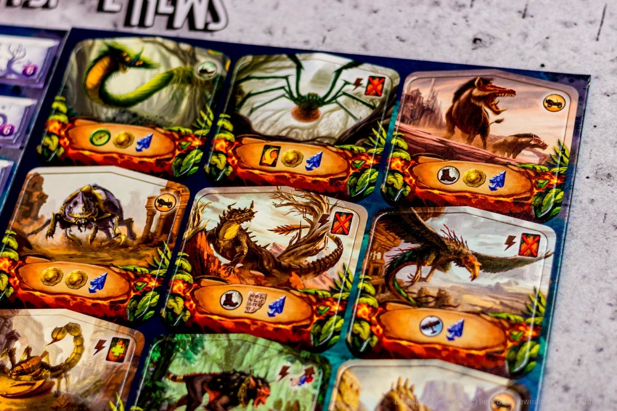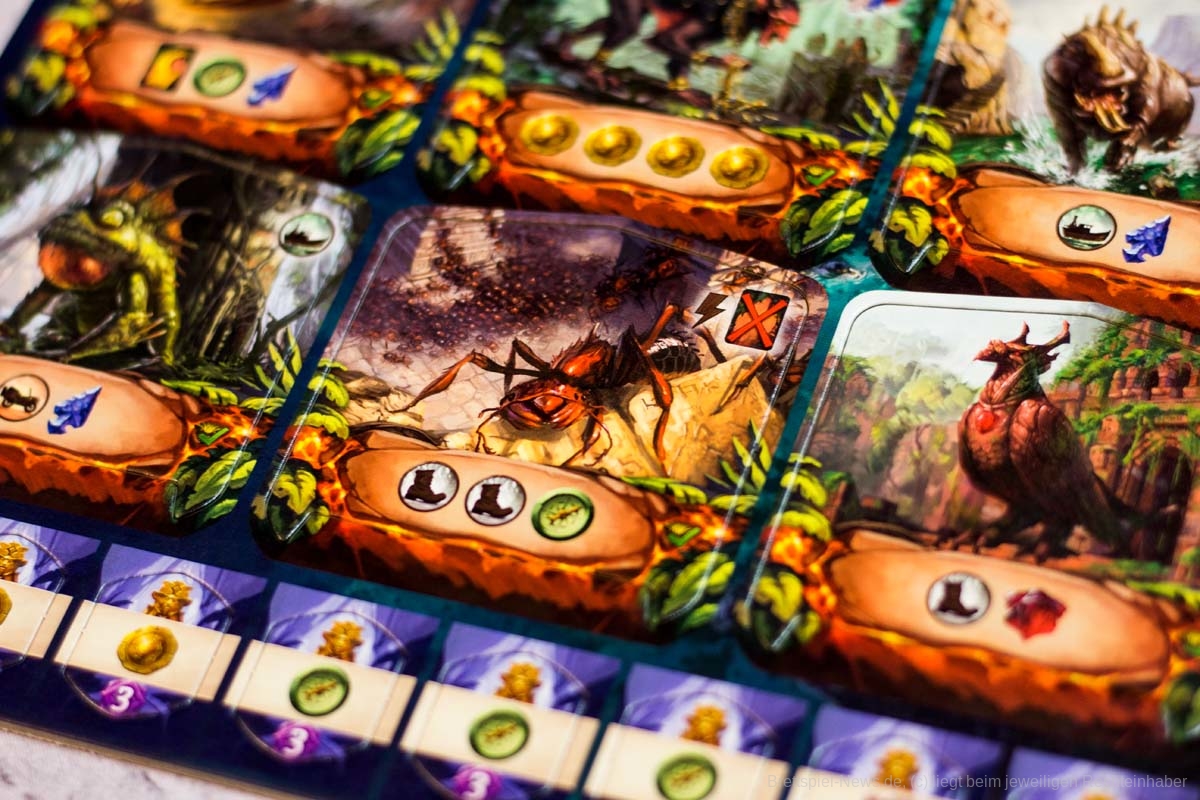 Von letzteren gibt es für meinen Geschmack leider ein wenig zu viele in DIE VERLORENEN RUINEN VON ARNAK. Die Kosten für Aktionen sind klar ersichtlich und alles ist, ebenfalls ganz typisch für Eurogames, kalkulierbar. Doch wenn es um das Entdecken neuer Orte geht, erleben die Spieler eine rasante Rutschpartie. Die Kosten für eine Entdeckung sind groß, was man findet, unterliegt aber völlig dem Zufall. So passiert es nicht selten, dass die nötigen Ressourcen fehlen, um den auftauchenden Wächter zu besiegen. Genau diese Zufälle stören mich. Denn die beträchtliche Investition wird dann auch noch durch Minuspunkte und ein verstopftes Kartendeck belohnt.