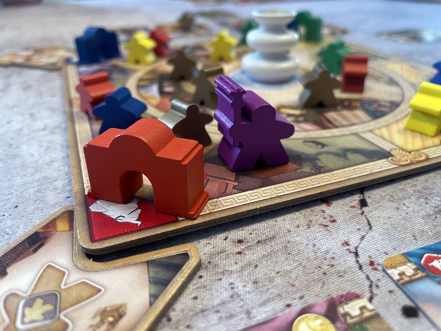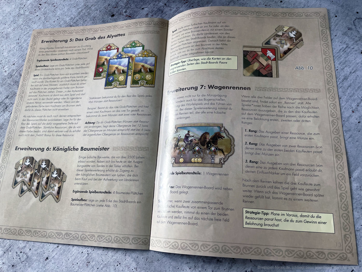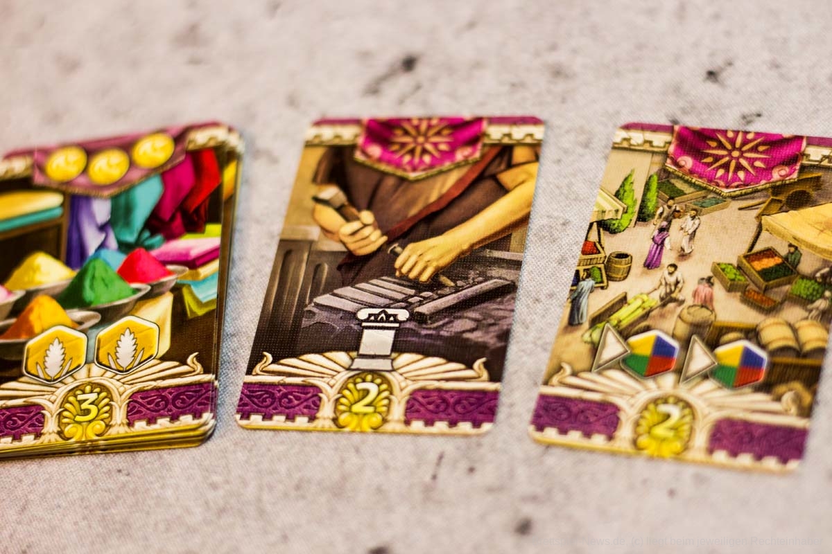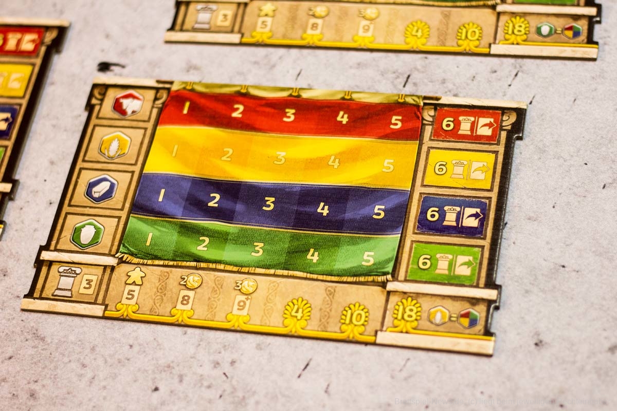 Die einzelnen Module bringen anschließend nicht nur willkommene Abwechslung ins Spiel, auch die Spieltiefe nimmt durch sie deutlich zu. Gerade wenn mehrere Module gleichzeitig in eine Partie integriert werden. Dann kann es auch für fortgeschrittene Spieler ein interessantes Spielerlebnis bieten. Die flexible Gestaltung der Partien ist ein absolut zu erwähnender Pluspunkt. Besonders gut haben uns die Module Wagenrennen, Landgüter und Innenhöfe gefallen. König Krösus und die Brunnenkarten würden wir in jede Partie als kleine Aufrüstung einbauen. Taktisch hat aber jede Erweiterung etwas Interessantes zu bieten und wertet das Grundspiel deutlich auf. So wird bei LYONS OF LYDIA verschiedenen Spielertypen etwas geboten. Insgesamt gibt sich das Spiel aber mit einem unteren Kennerniveau zufrieden.