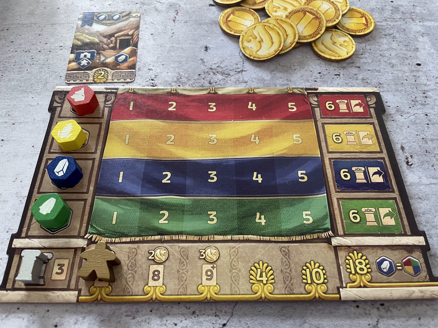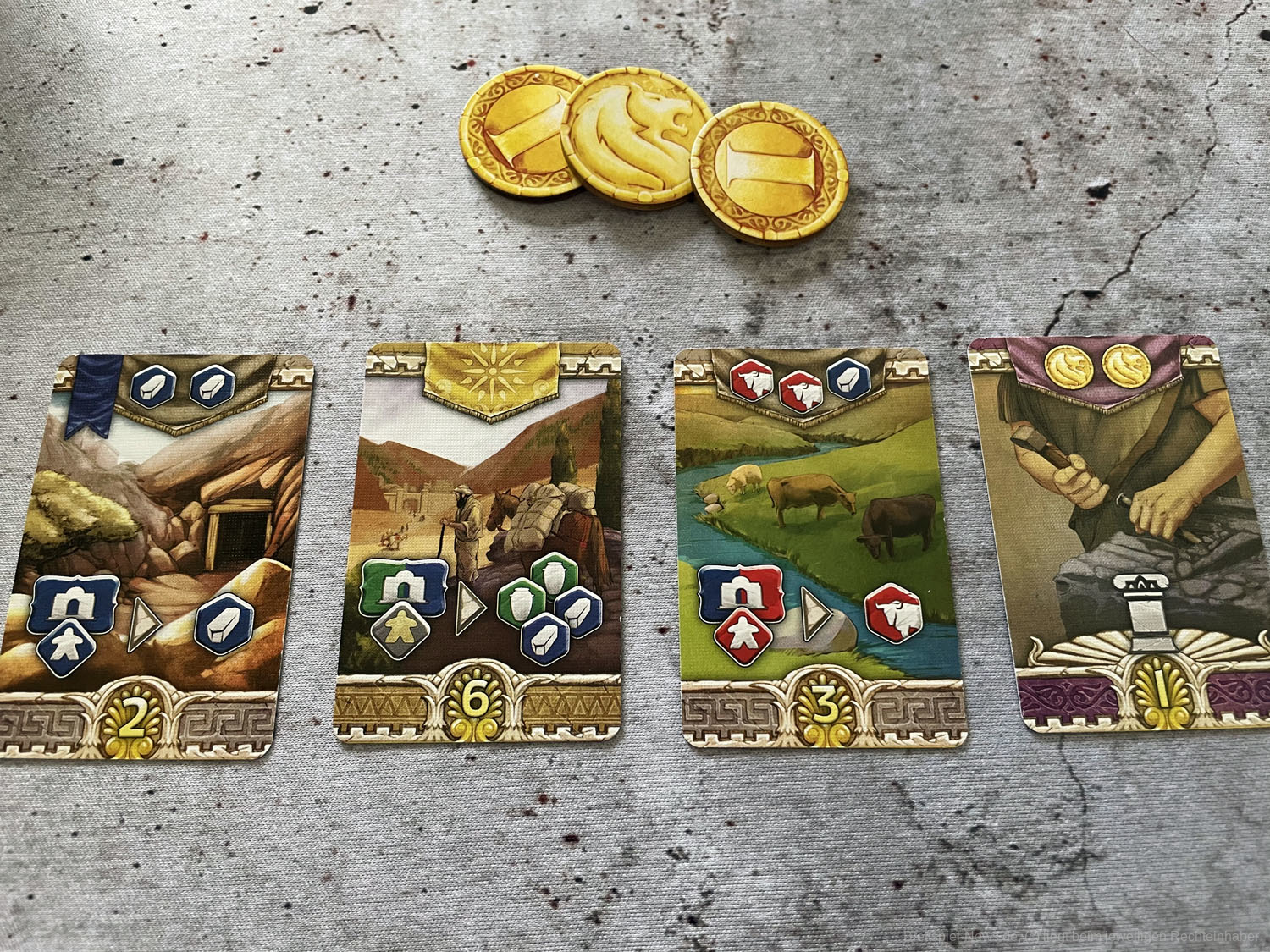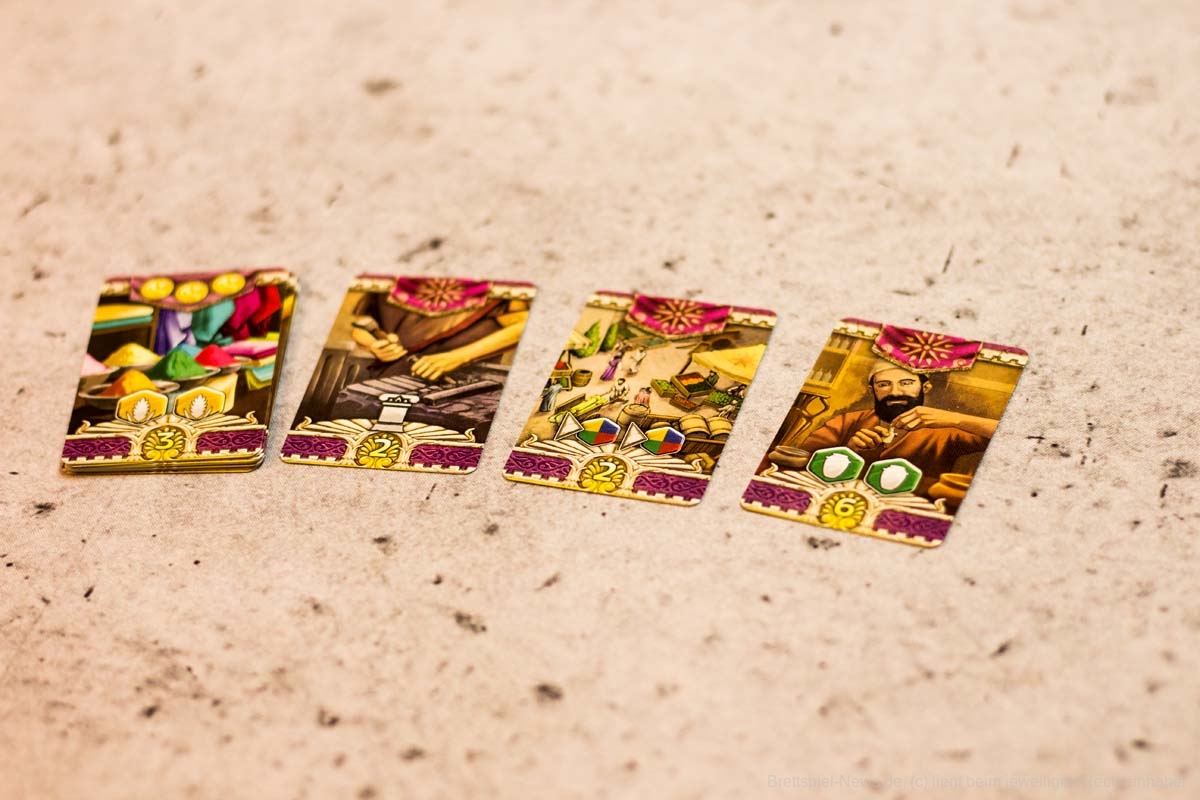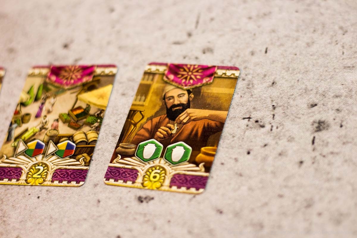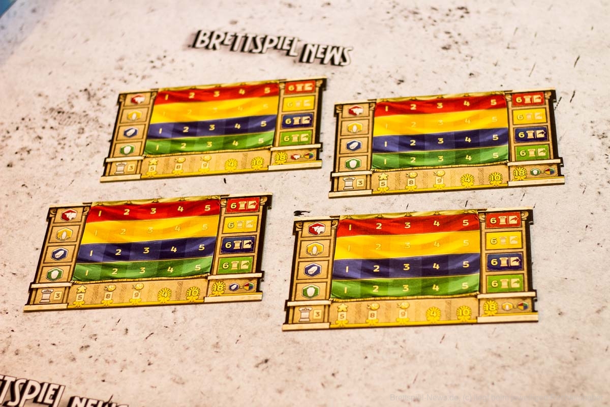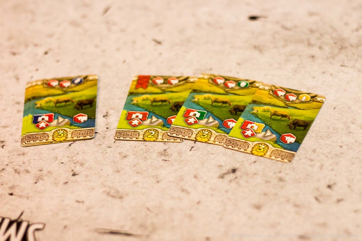 Mit mehr als drei Spielern am Tisch würden wir LIONS OF LYDIA nicht mehr auspacken. Die Wartezeit ist zwischen den Zügen einfach zu lang und die Interaktion zu gering. Auch wenn die Züge nur aus Figur aus dem Beutel ziehen und Figur platzieren bestehen, können gerade Spieleneulinge oder Hardcore-Grübler bei letzterem schon einmal länger verweilen. Zum einen muss die Ressourcenverwaltung abgehandelt werden, bevor der nächste seinen Kaufmann ziehen darf und zum anderen hemmt das ständige Überprüfen der Ländereikarten und deren Sonderfähigkeiten den Spielfluss.