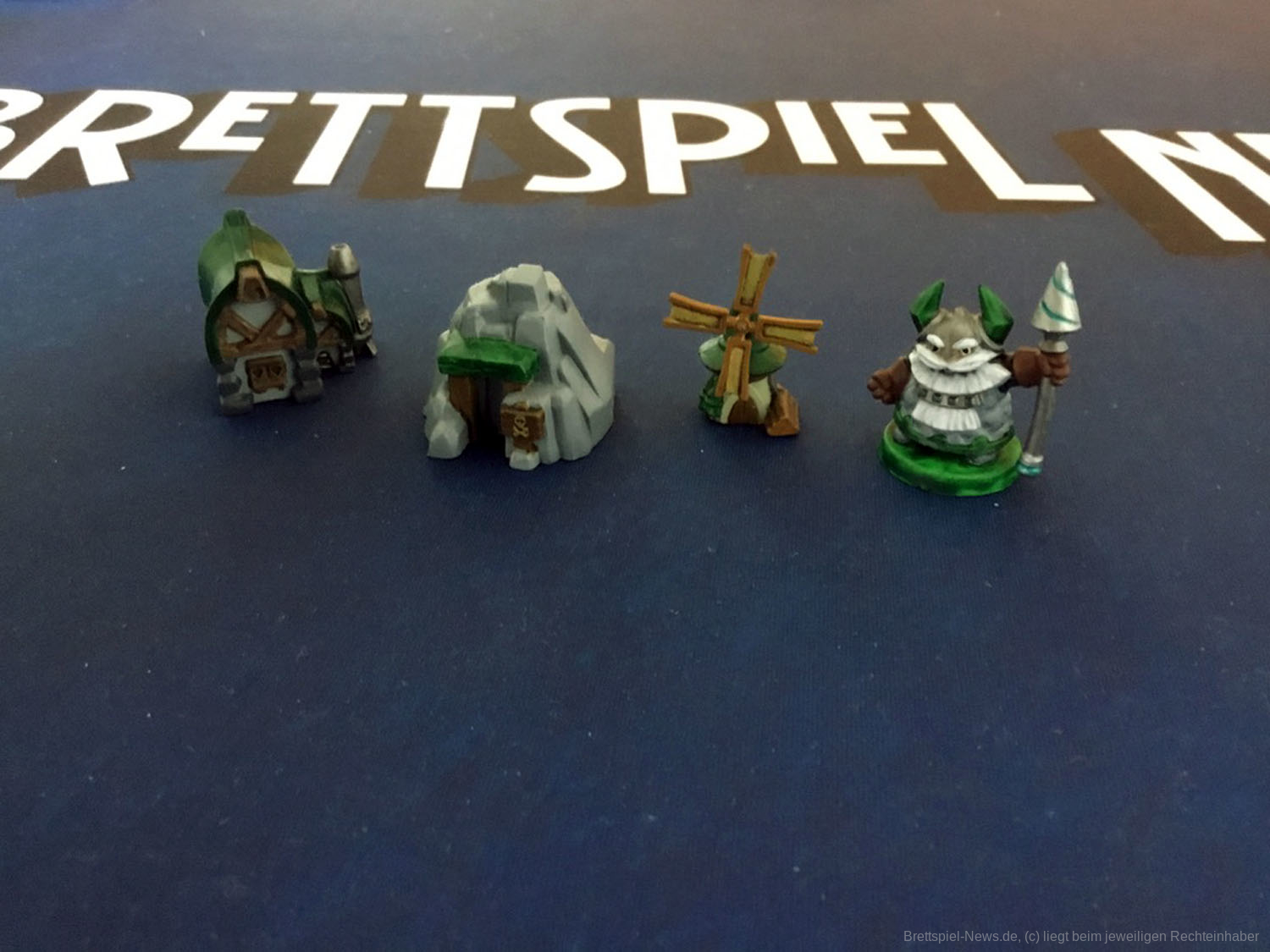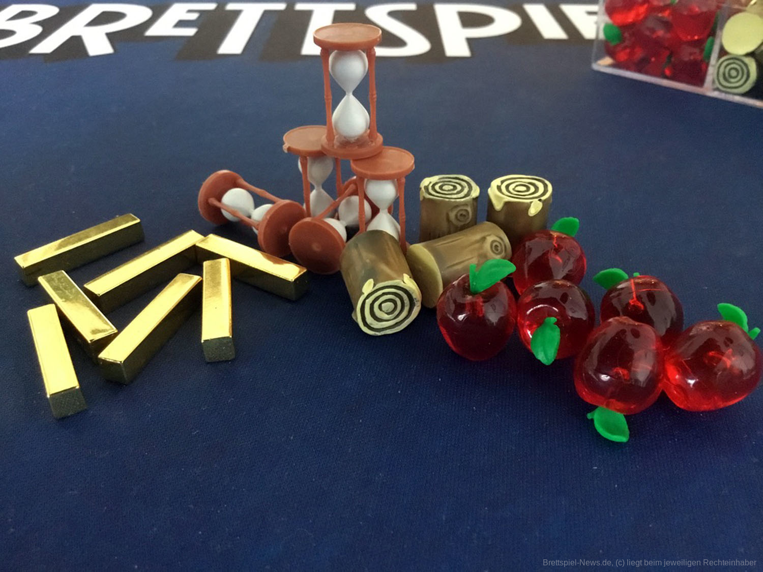 Es sei an dieser Stelle gesagt, dass ich statt der diversen Pappmarker für Zwerge und Ressourcen die Deluxevariante mit aufgewertetem Spielmaterial und Zwergenminiaturen besitze. Die Zwergenfiguren heben sich deutlich vom Untergrund ab und können so kaum übersehen werden. Bei den Pappscheiben-Zwergen ist dies durchaus möglich. Die kleinen Plastikäpfel wurden bereits mehr als einmal für Süßigkeiten gehalten und sind nur knapp einem Verzehr entgangen. Auch die Goldbarren und Holzklötze werten das Spiel deutlich auf. Die Erweiterungen des Spiels sind nicht Kickstarter-exklusiv und können beim Verlag regulär gekauft werden. Diese enthalten neben weiteren Monstern und mehr Drachen auch die Elfenfraktion, um das Spiel zu fünft zu ermöglichen. Ein weiteres Highlight ist für mich die Kompatibilität mit DWAR7S WINTER, denn alle Monster aus den beiden Spielen können im jeweils anderen eingesetzt werden und ergänzen einander sehr gut. Die entsprechenden Karten sind ebenfalls in den Erweiterungen enthalten.