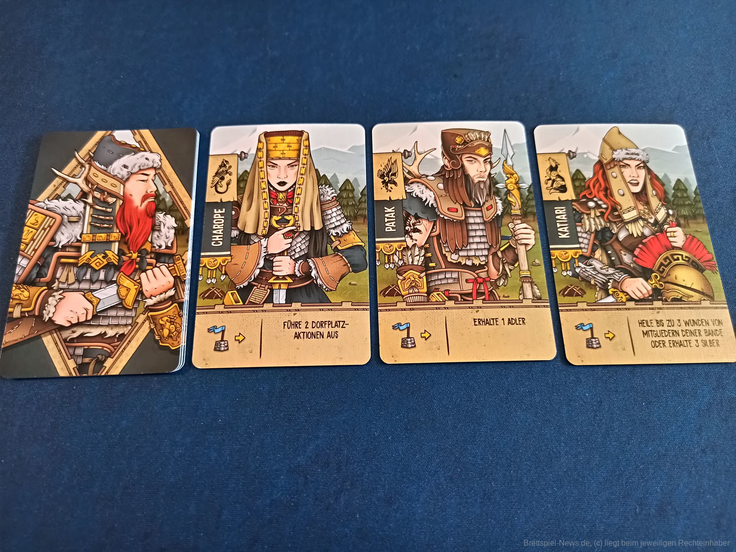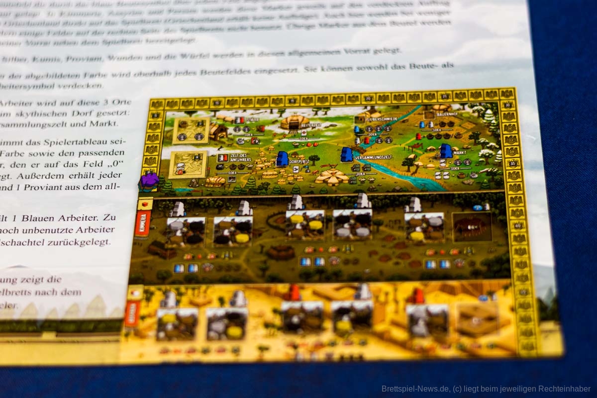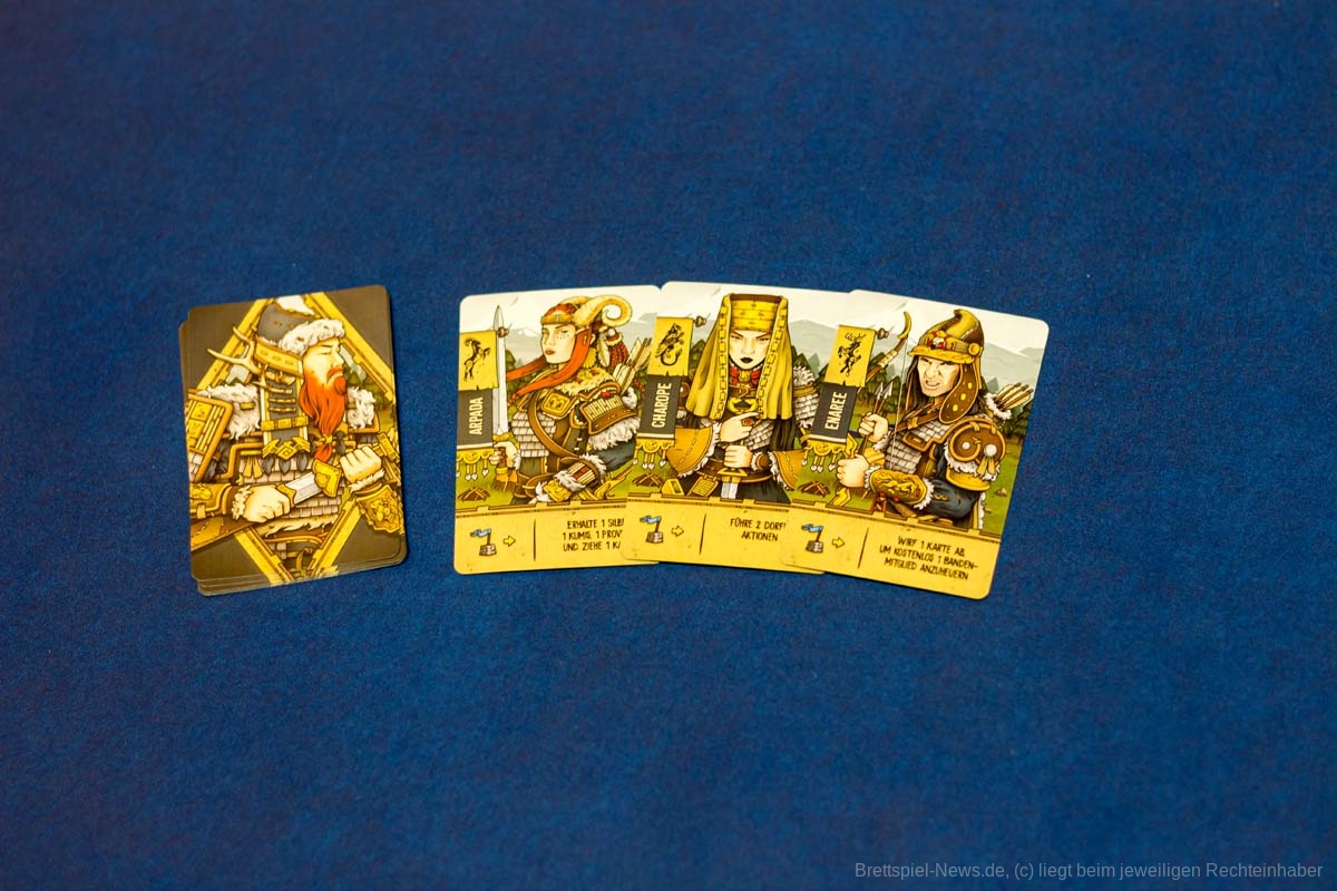 Arbeiter können dabei entweder zum Plündern einer der unteren Siedlungen oder in dem skytischen Dorf oben auf dem Spielfeld eingesetzt werden. In dem Dorf können die Spieler:innen Bandenmitglieder anheuern, indem sie die Silberkosten bezahlen und die entsprechende Karte von der Hand auf dem Spielertableau ablegen. Zudem können sie diese mit Pferden und Adlern ausstatten, notwendige Ressourcen sammeln, neue Karten ziehen und Aufträge erfüllen.