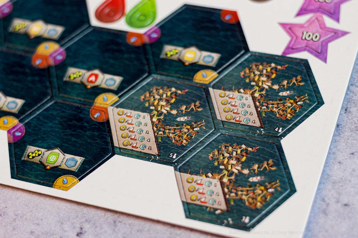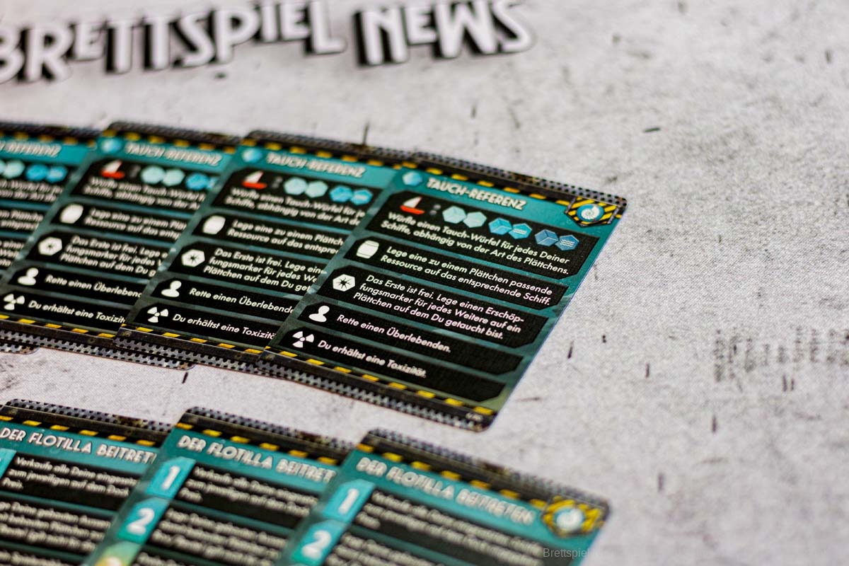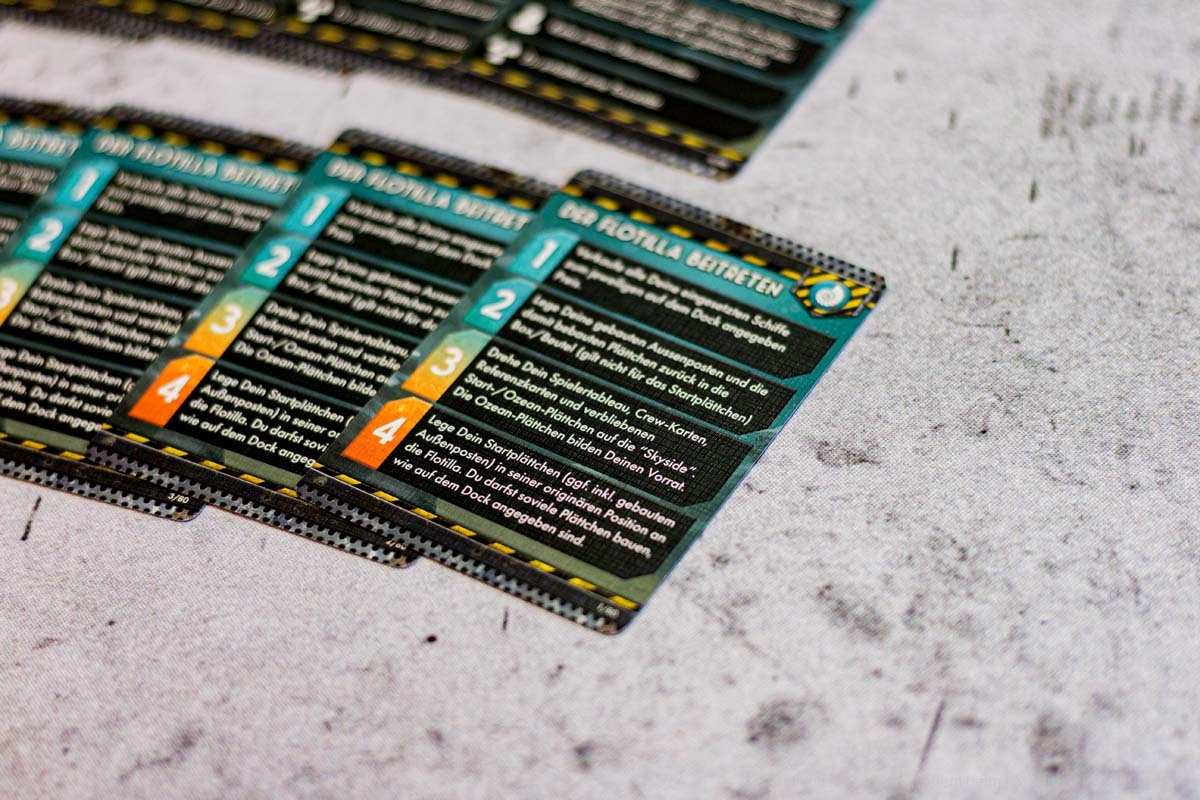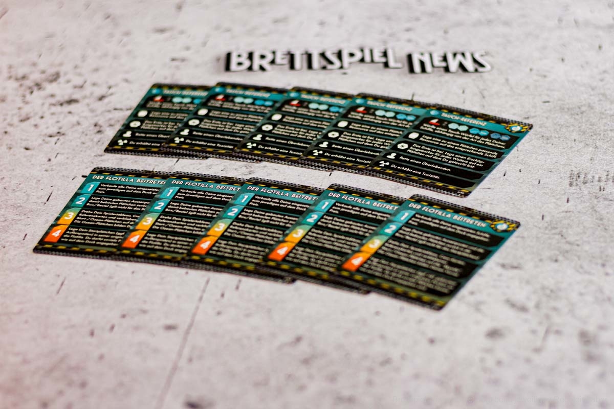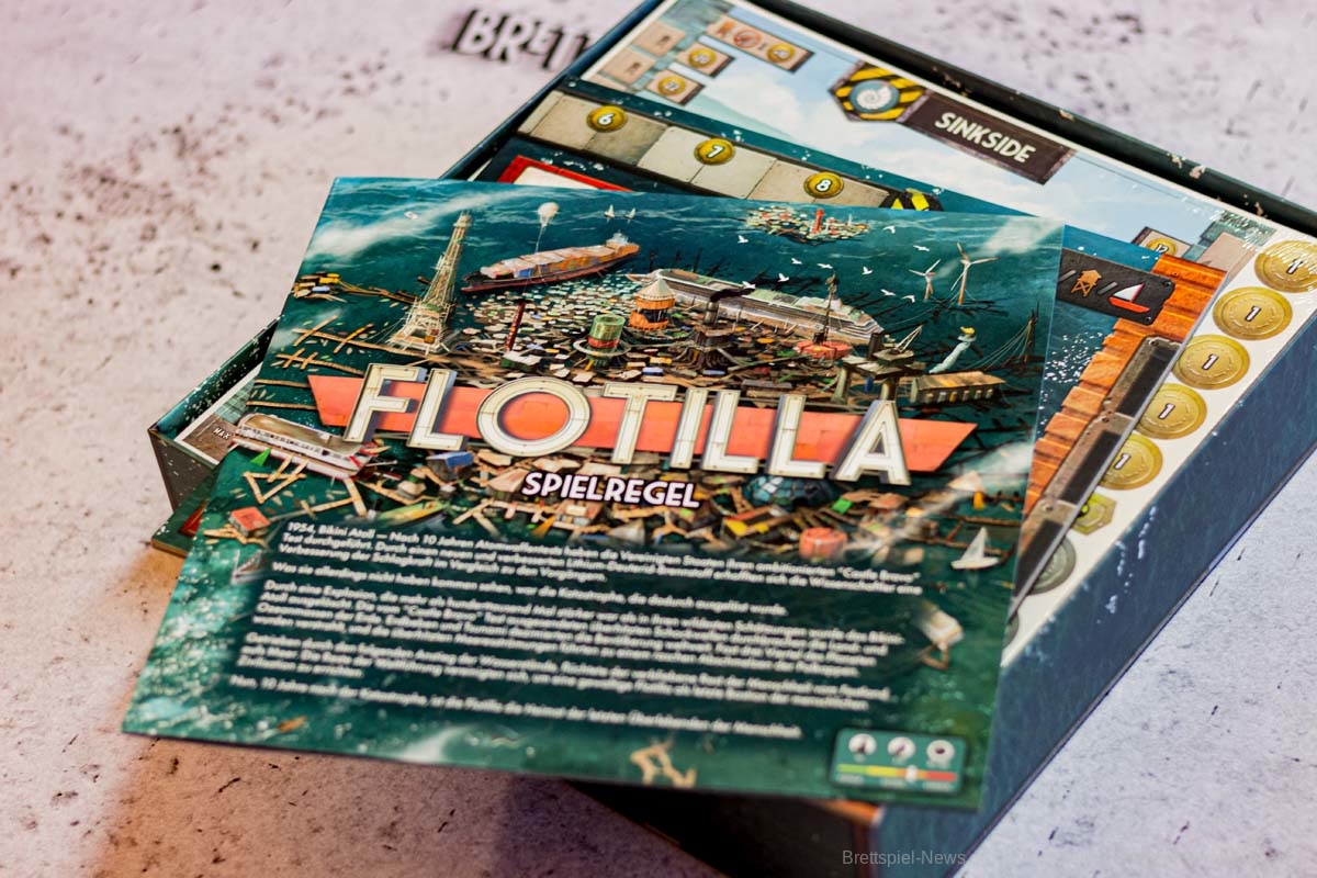 FLOTILLA ist ein Spiel für drei bis fünf Personen. Bezüglich der verzahnten Mechanik ergibt das Sinn, doch selbst zu dritt dauert das Spiel sehr lange. Eine Partie mit fünf unerfahrenen Spielern kann schnell den ganzen Abend in Anspruch nehmen. Durch die Verzahnung ist es nötig, jede Aktionskarte grundlegend zu erklären. Und da sich die Aktionen von denen der Rückseiten unterscheiden, ist es notwendig, beide Seiten zu erklären. Die Wechselwirkungen müssen immer wieder in der Anleitung nachgeschlagen werden. Hinzu kommt, dass FLOTILLA sich sehr einsam anfühlt. Interaktion gibt es nur über die Verzahnung, direktes Handeln von Waren oder gemeinsame Aktionen gibt es nicht. Ganz typisch für ein Eurogame beschränken sich die genügsamen Müllwühler also auf passive Aggressionen.