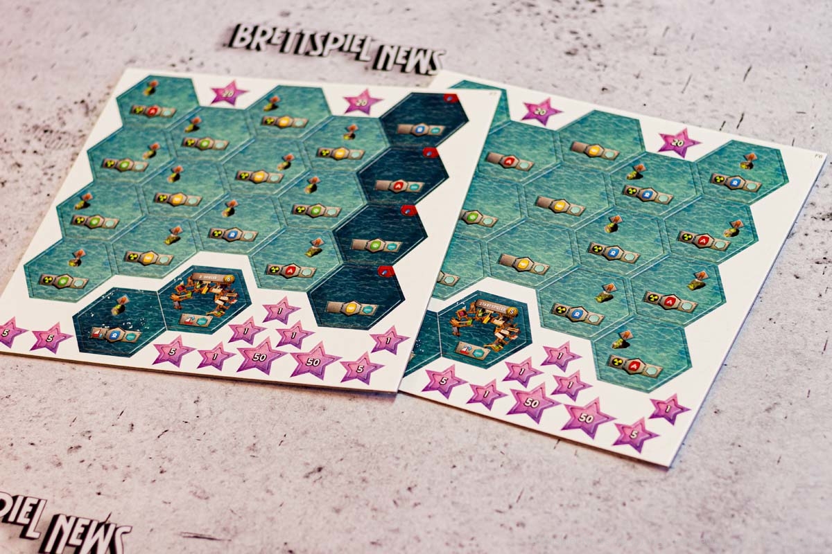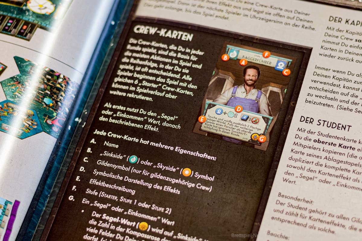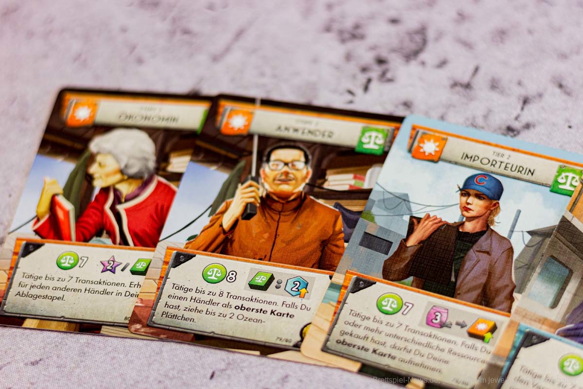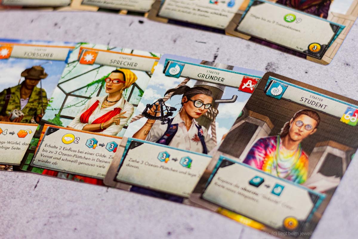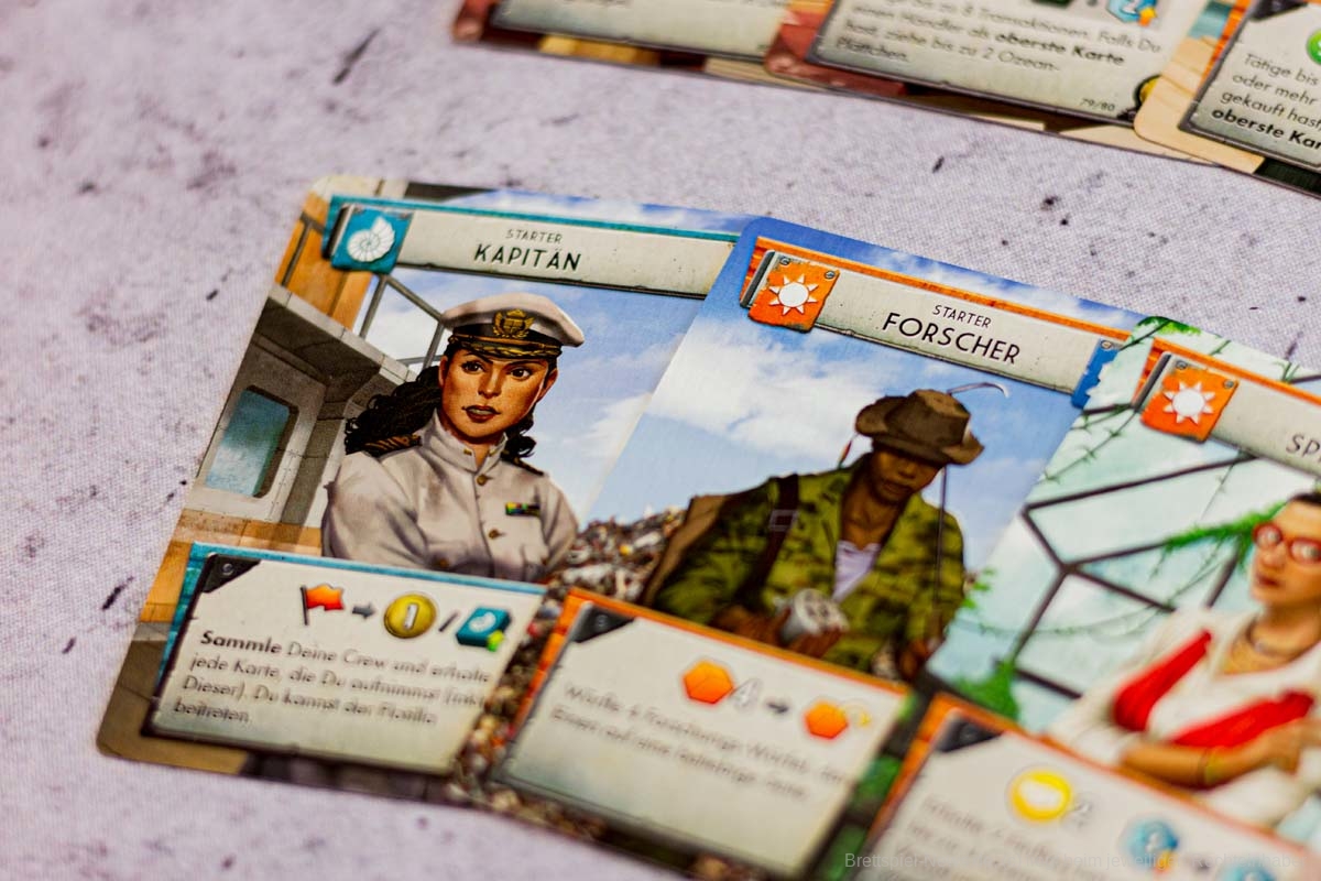 An diesem Punkt angelangt, fühlt sich FLOTILLA wie eine anstrengende Reise an, eine lohnende zwar, aber dennoch auch eine kräftezehrende Unternehmung in einer postapokalyptischen Welt, die vor 70 Jahren spielt. Die Spielgeschichte schien mir düster mit den radioaktiven Seegebieten und der unterschwelligen Hoffnungslosigkeit und all diesen Menschen, denen ein Leben als Müllsammler und Resteverwerter auferlegt wird. Doch das stört niemanden im Spiel und die tödliche Radioaktivität ist eben das notwendige Übel eines umtriebigen Entdeckerlebens. Alle Bewohner dieser Welt graben im Müll und lassen lethargisch ihr Leben für die Ressourcenbeschaffung. Diese düstere Seite spielt bei FLOTILLA jedoch keine Rolle. Die Karten, die eine sehr gute Verteilung von Männern und Frauen aufweisen (es sind gleich viele), sind farbenfroh und das vorherrschende Zwei-Kasten-System aus Sink- und Skysidern und die allumfassende Herrschaft aus vier Gilden scheinen dem Spieler förmlich zu zuflüstern: „Hey, mach dir keine Sorgen. Das Leben ist schön und voller Möglichkeiten. Und wenn dir die verstrahlten Haare ausfallen, dann fahr‘ halt woanders hin.“