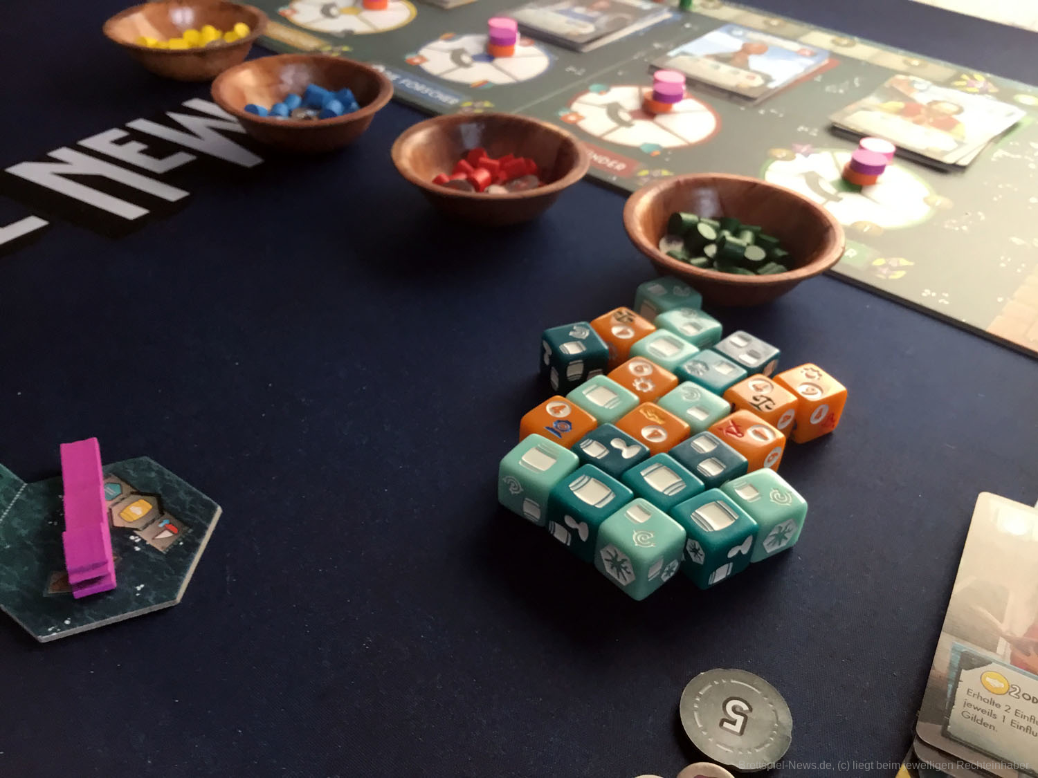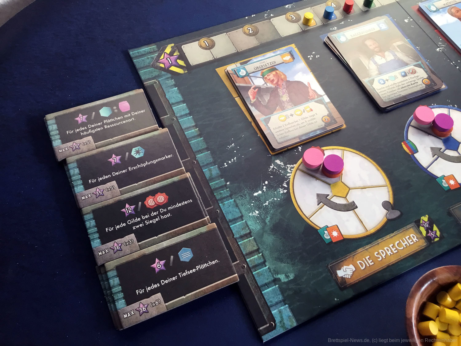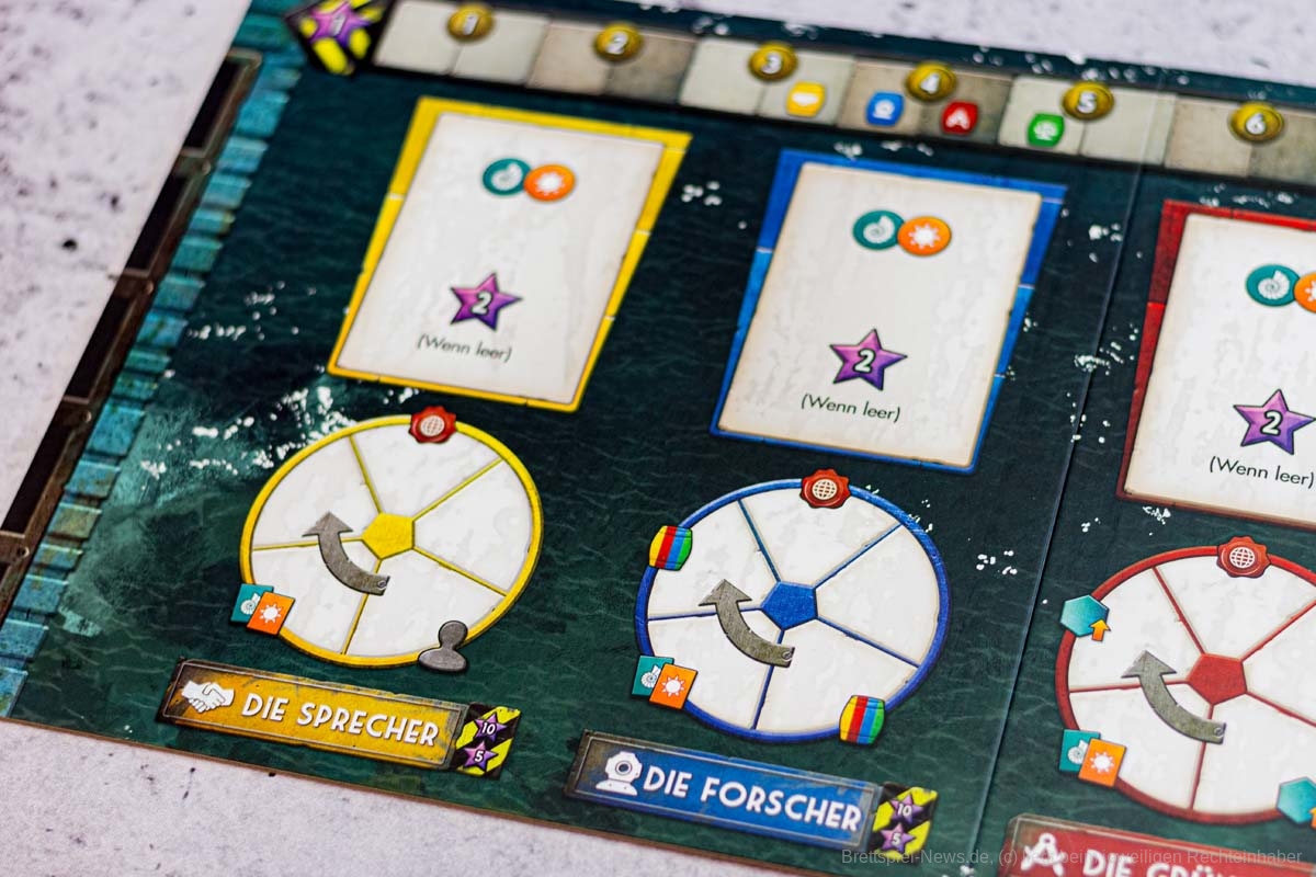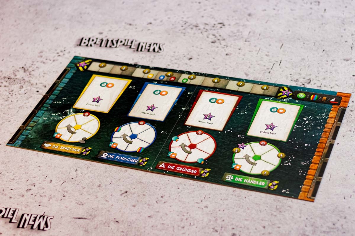Konzentrieren wir uns also auf die schönen Dinge. FLOTILLA ist angenehm bunt. Die Karten sind schön gestaltet und jede Person wurde für die Skyside anders gestaltet. Da wird der Taucher zum Sammler und der Student bleibt Student. Das ist absolut passend und macht Hoffnung, denn selbst in der Apokalypse scheint es die Prokrastination, also das Aufschieben von Tätigkeiten, noch zu geben. Diese Aktionskarten steuern das gesamte Spiel. Durch Einfluss in den Gilden erhalten die Spieler neue Karten und erweitern so nicht nur ihre Möglichkeiten mit sehr mächtigen neuen Aktionen, sondern schieben auch das unausweichliche Spielen des Kapitäns hinaus. Das Deckbuilding funktioniert ausgezeichnet und macht Spaß. Durch die verlockenden Fähigkeiten der Karten wird das Sammeln von Einfluss zum spannenden Wettrennen, das mit Siegpunkten belohnt wird.