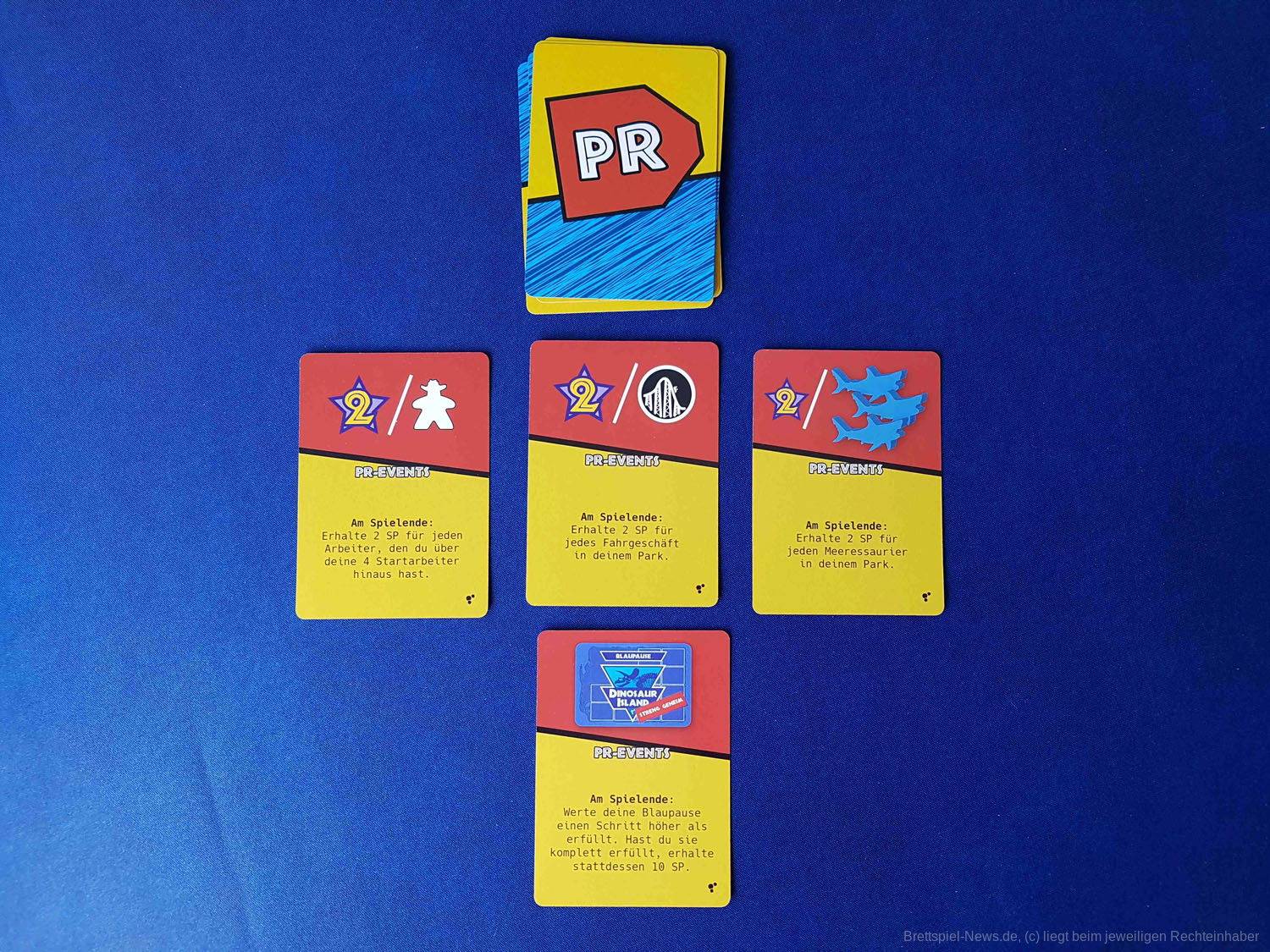 Bei diesem Modul erhalten alle Spieler:innen zu Beginn des Spiels zwei PR-Karten. Diese bringen zusätzliche Siegpunkte für eine bestimmte Anzahl an Attraktionen im Park. Der Clou: Nur eine der beiden Karten kann am Ende gewertet werden und alle Mitspieler:innen erhalten ebenfalls Siegpunkte für diese Art von Attraktion. Hier gilt es also, weise zu wählen, damit die eigene Werbung nicht nach hinten losgeht.