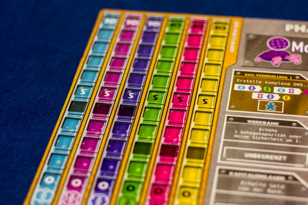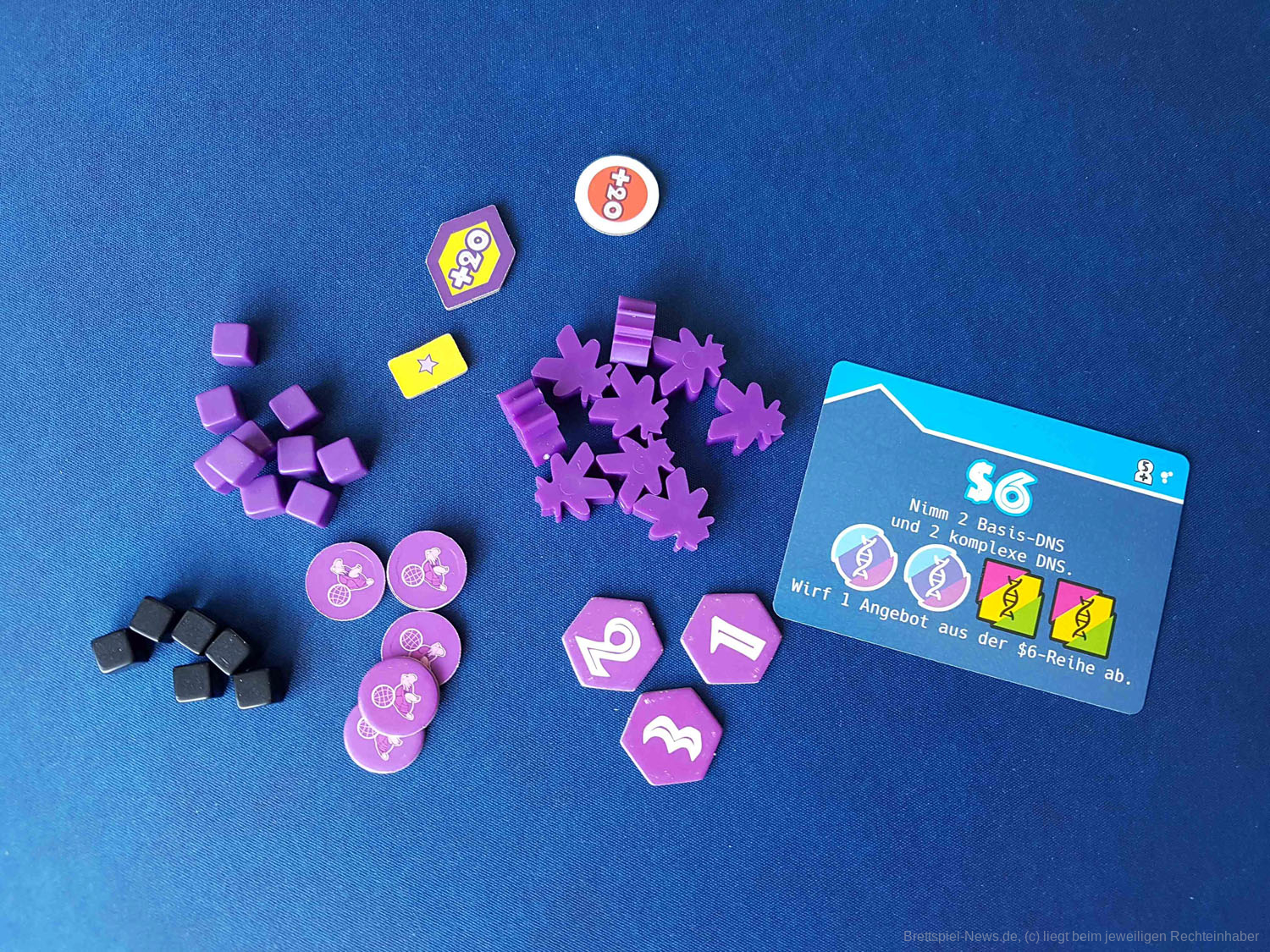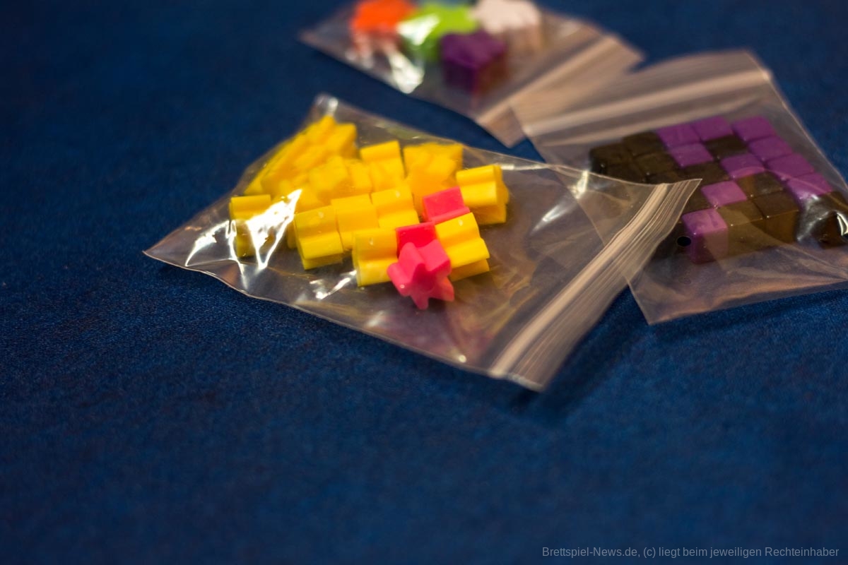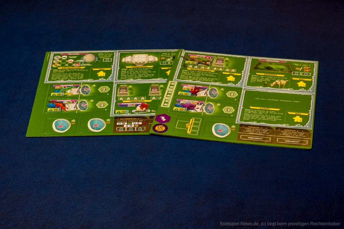 Das Spielmaterial selbst ist wieder sehr hochwertig produziert worden. Die zahlreichen Karten und Plättchen sind stabil, die Tableaus haben Vertiefungen für die Marker und die Plastik-Meeple weisen ausreichend Details auf. Somit gibt es hier für mich fast nichts zu meckern. Schade empfand ich lediglich, dass nicht exakt dieselben Farben wie beim Grundspiel verwendet wurden.