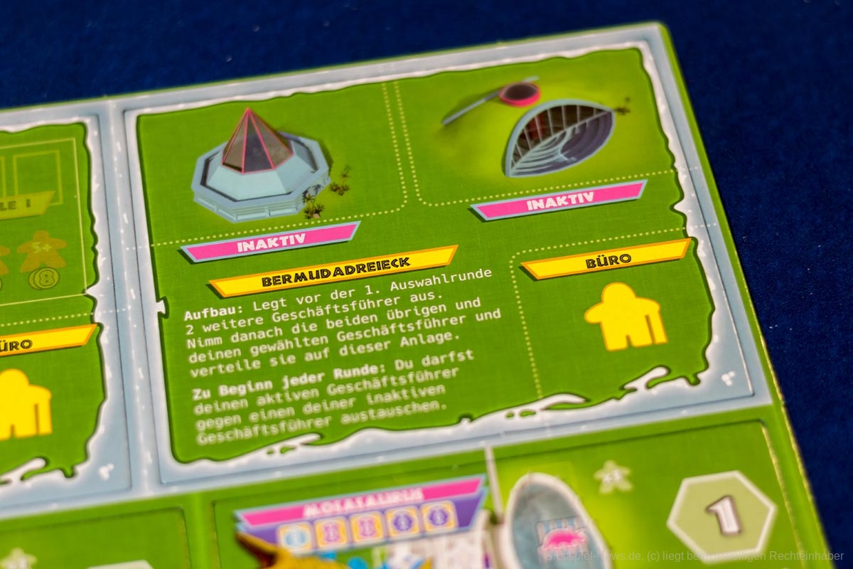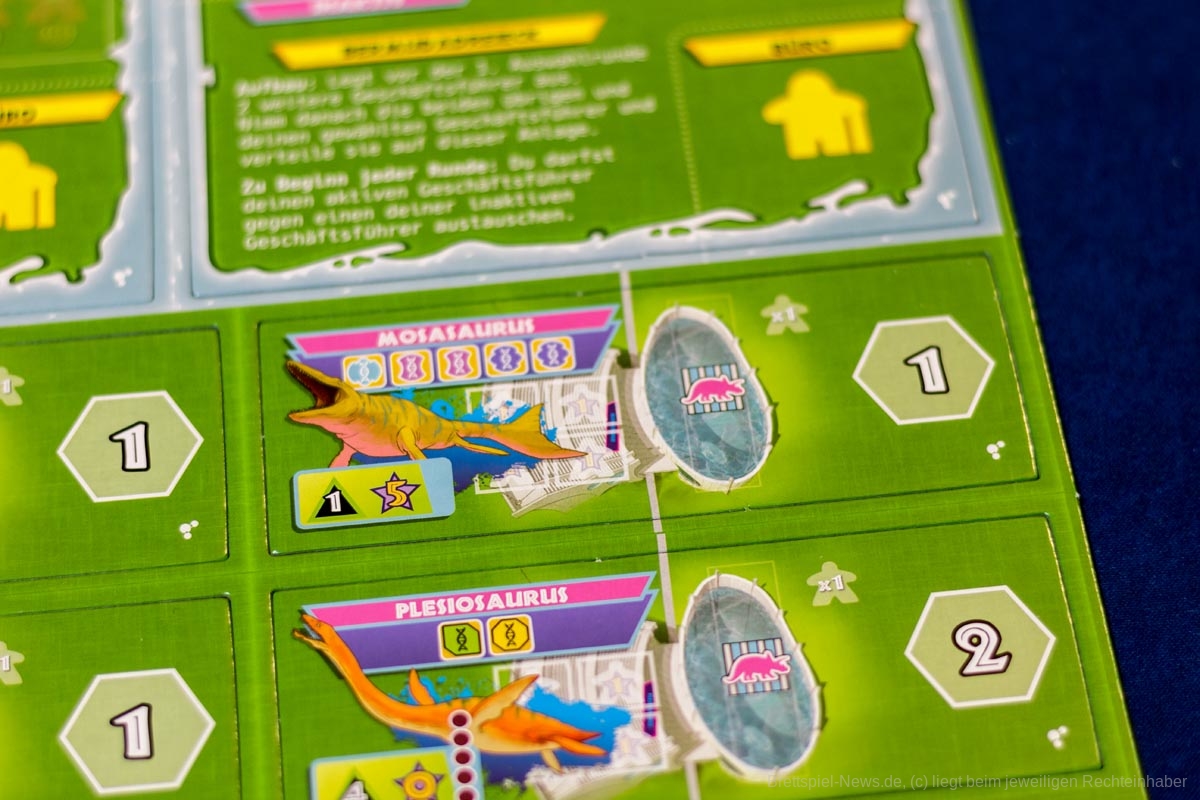 Zu Beginn der Partie dürfen die Spieler:innen beginnend mit dem letzten Spieler in Zugreihenfolge eine Anlage und einen Geschäftsführer auswählen. Beides bringt weitere Vorteile im Spielverlauf und erweitert so die strategischen Möglichkeiten. So gibt es beispielsweise eine Dino-Brutstation, in welcher nach einigen Runden Dinos ohne den Einsatz großer Mengen an DNA aus ihren Eiern schlüpfen. Die Geschäftsführer wiederum können unter anderem als zusätzliche Wissenschaftler oder Arbeiter eingesetzt werden.