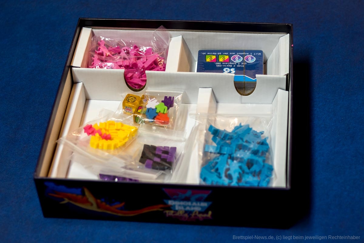 Wie auch schon das Grundspiel glänzt die Schachtel von DINOSAUR-ISLAND - TOTALLY LIQUID mit seinen quietschbunten-psychedelischen Illustrationen. Öffnet man die Schachtel, fällt erst einmal auf, dass diese nicht so prall gefüllt ist wie beim Grundspiel. Dafür ist die Erweiterung aber etwas günstiger, sodass ich ein gutes Preis-Leistungs-Verhältnis attestiere.