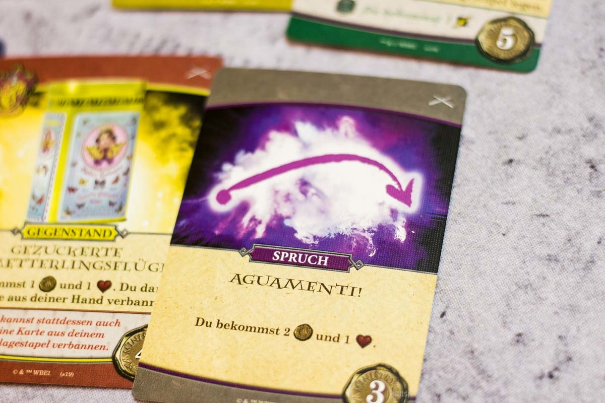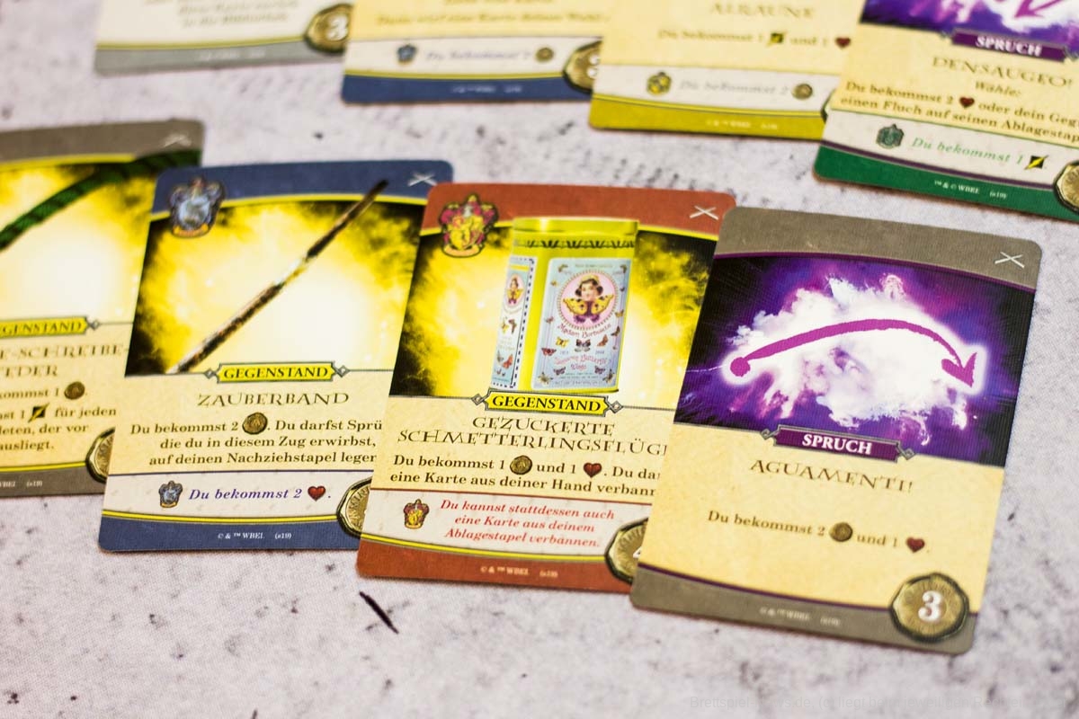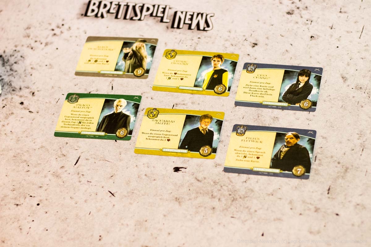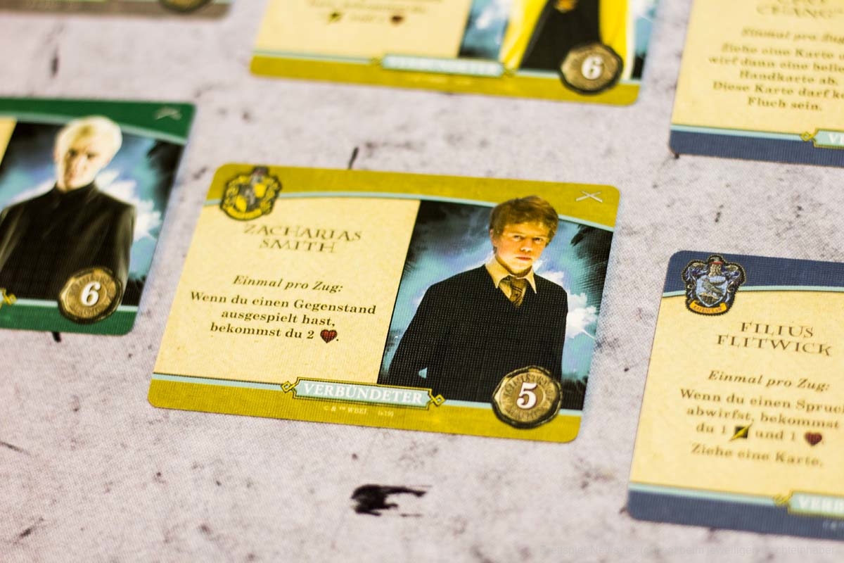 Das Duellfeeling wird durch das systematische Zurückdrängen des Gegenübers gut umgesetzt. Ansonsten ist der Ablauf der Züge sehr zugänglich und versierten Deckbau- und KAMPF-UM-HOGWARTS-Spieler:innen bestens bekannt. Da erfindet auch dieser Ableger nichts neues. Besser als beim kooperativen Vorgänger fanden wir jedoch die Synergien, die sich durch das Ausspielen und vor allem das dauerhafte Auslegen von Verbündeten ergeben. Hierdurch werden die Spieler:innen noch einmal zu interessanteren Entscheidungen beim Kauf der Karten getrieben. Generell sind die Marktkarten durch dieses Spieleelement noch einmal vielfältiger, da sie mehr Aktionen bei passenden Verbündeten und auch die Möglichkeit bieten, gegnerische Verbündete außer Gefecht zu setzen.