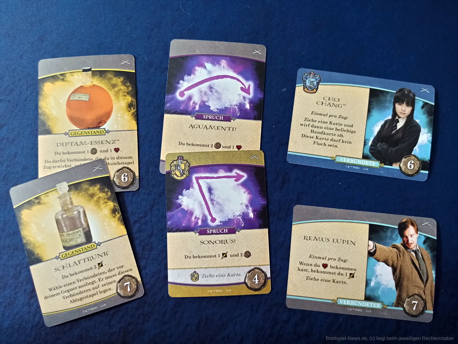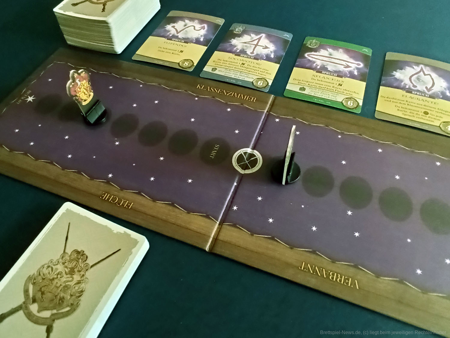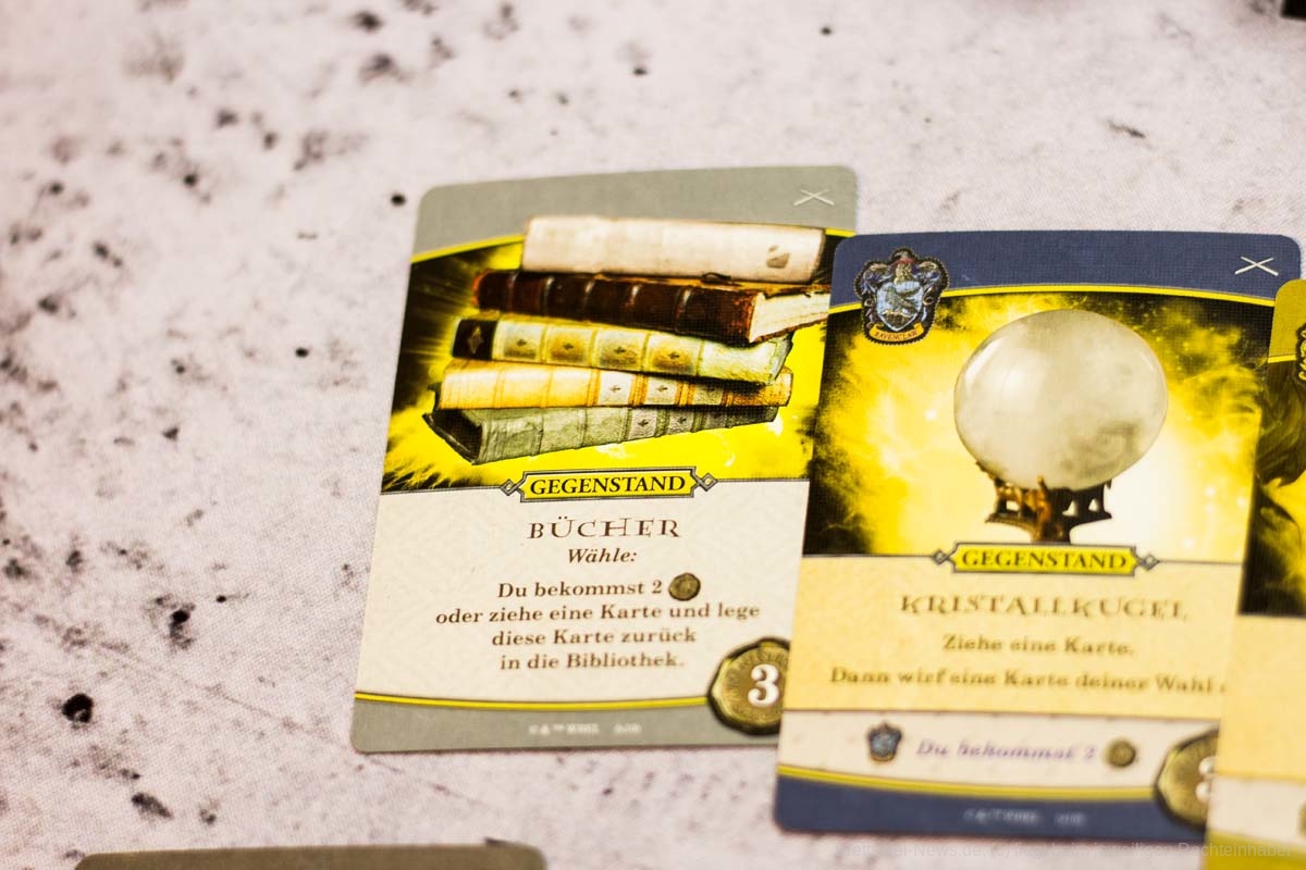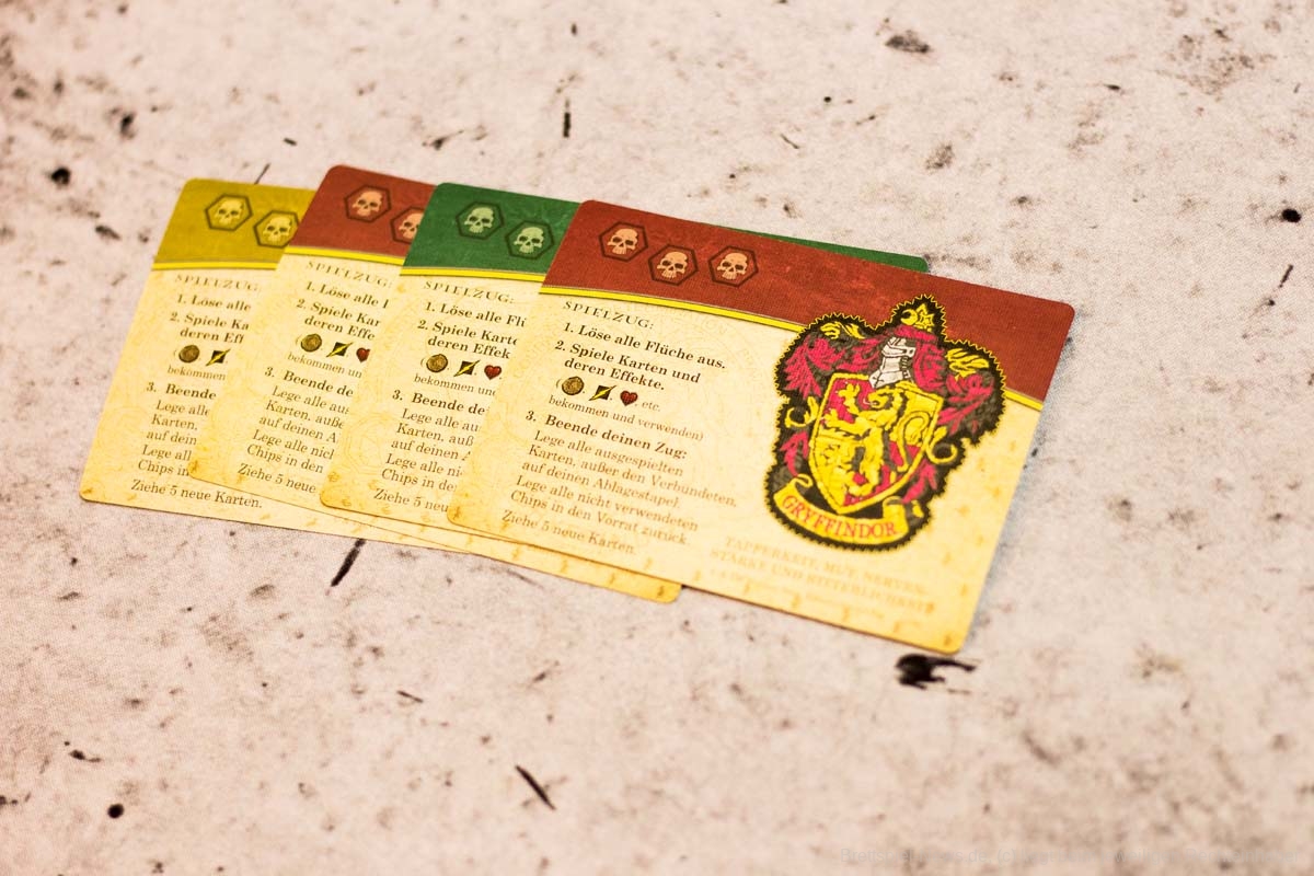 Das Duellfeeling wird durch das systematische Zurückdrängen des Gegenübers gut umgesetzt. Ansonsten ist der Ablauf der Züge sehr zugänglich und versierten Deckbau- und KAMPF-UM-HOGWARTS-Spieler:innen bestens bekannt. Da erfindet auch dieser Ableger nichts neues. Besser als beim kooperativen Vorgänger fanden wir jedoch die Synergien, die sich durch das Ausspielen und vor allem das dauerhafte Auslegen von Verbündeten ergeben. Hierdurch werden die Spieler:innen noch einmal zu interessanteren Entscheidungen beim Kauf der Karten getrieben. Generell sind die Marktkarten durch dieses Spieleelement noch einmal vielfältiger, da sie mehr Aktionen bei passenden Verbündeten und auch die Möglichkeit bieten, gegnerische Verbündete außer Gefecht zu setzen.