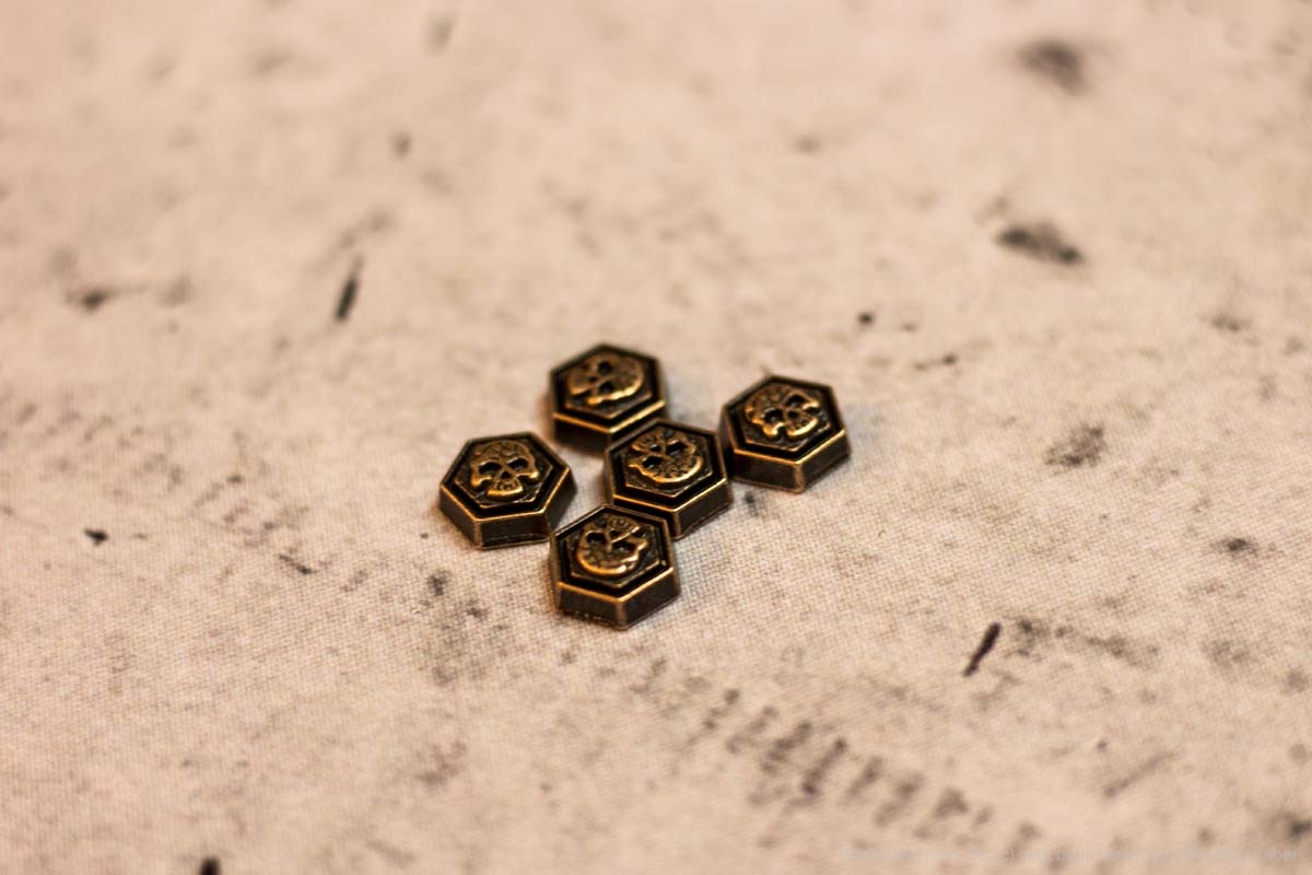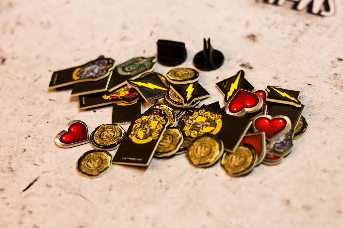 Die beiliegenden Marker sind zwar schön, aber obsolet. Werden die Karten gespielt, können die Blitze und Herzen als Schritte auf der Duellierbahn direkt abgetragen werden. Als Spielhilfe sind sie daher allerhöchstens für Anfänger geeignet.