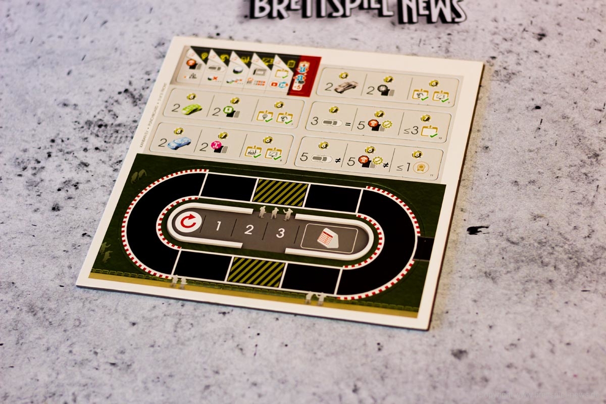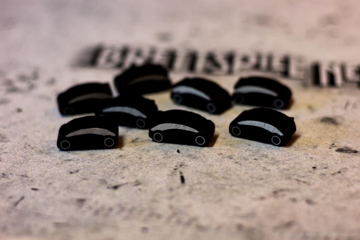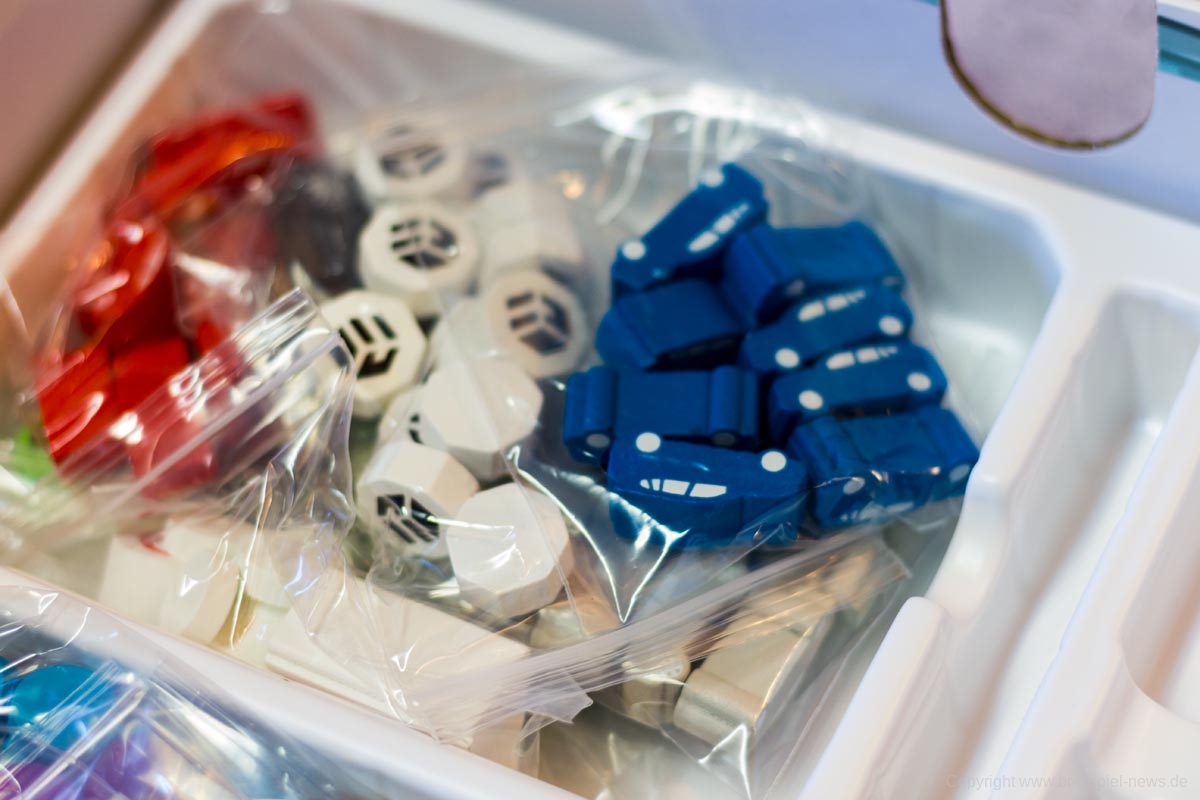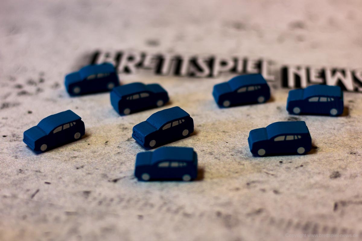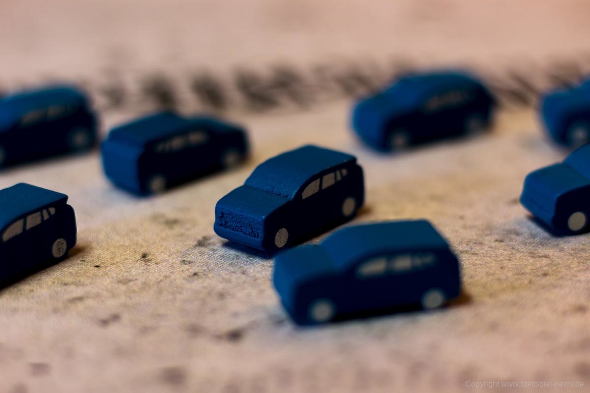 Wie bereits bei Lacerda-Vorgängern bietet Skellig Games auch hier eindeutig wieder großartige Materialqualität für einen stolzen Preis. Wie bei eigentlich allen Spielen des Autors bekommt der Käufer jede Menge fette (dick wäre noch untertrieben) Holztoken und in diesem Spiel sogar Holzautos. Diese finden ordentlich aufgereiht in einer Sortierbox ihren Platz, genau wie die anderen bemalten Holzteile. Das Plastik-Inlay mit Zwischendeckel unterstützt sowohl einen schnellen Aufbau, als auch eine sichere Aufbewahrung.