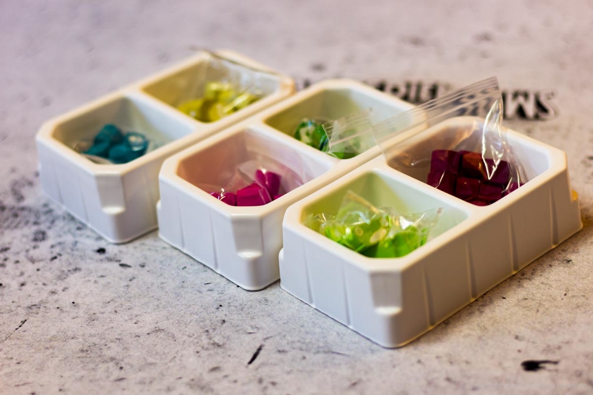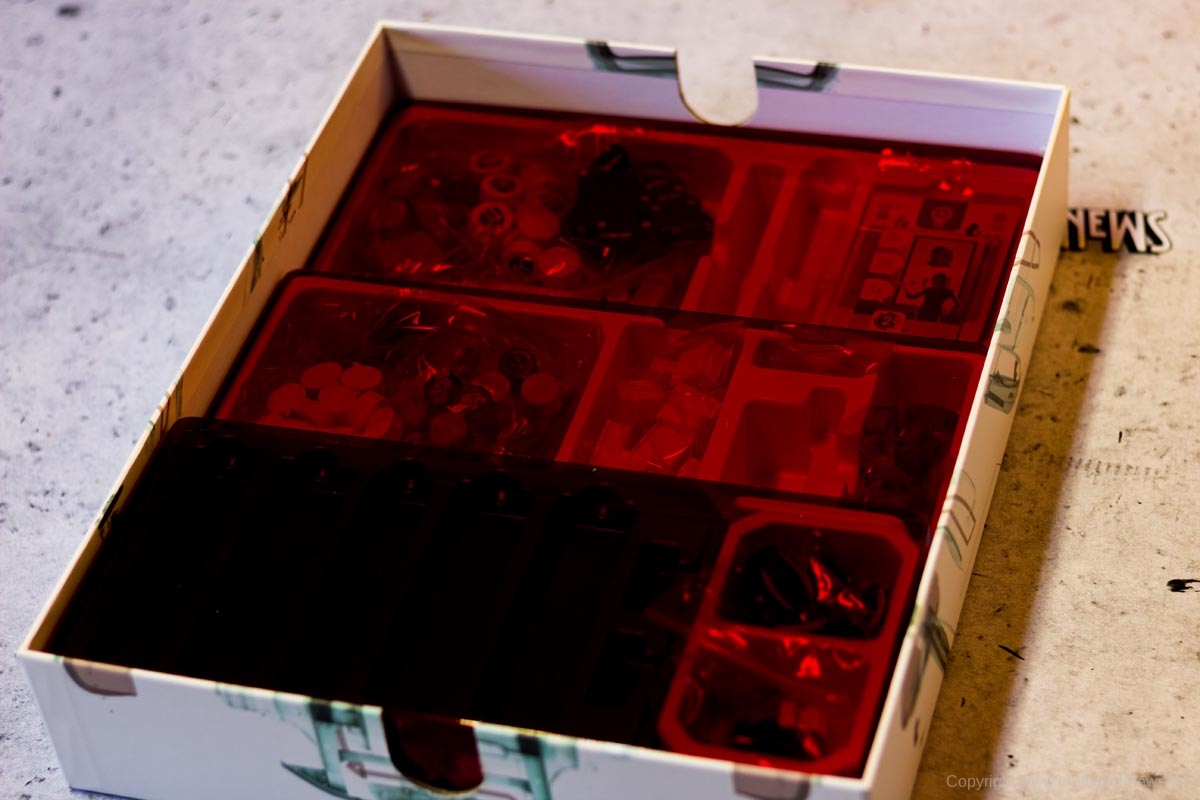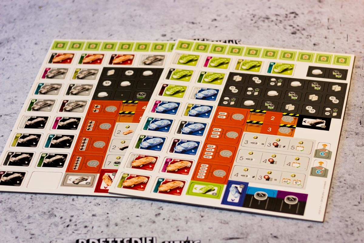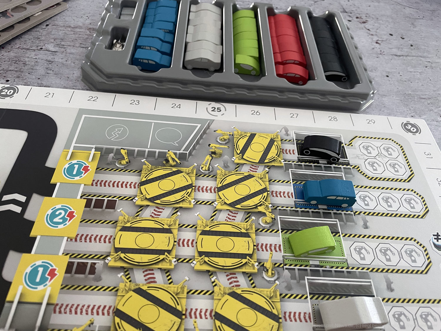 Wie bereits bei Lacerda-Vorgängern bietet Skellig Games auch hier eindeutig wieder großartige Materialqualität für einen stolzen Preis. Wie bei eigentlich allen Spielen des Autors bekommt der Käufer jede Menge fette (dick wäre noch untertrieben) Holztoken und in diesem Spiel sogar Holzautos. Diese finden ordentlich aufgereiht in einer Sortierbox ihren Platz, genau wie die anderen bemalten Holzteile. Das Plastik-Inlay mit Zwischendeckel unterstützt sowohl einen schnellen Aufbau, als auch eine sichere Aufbewahrung.