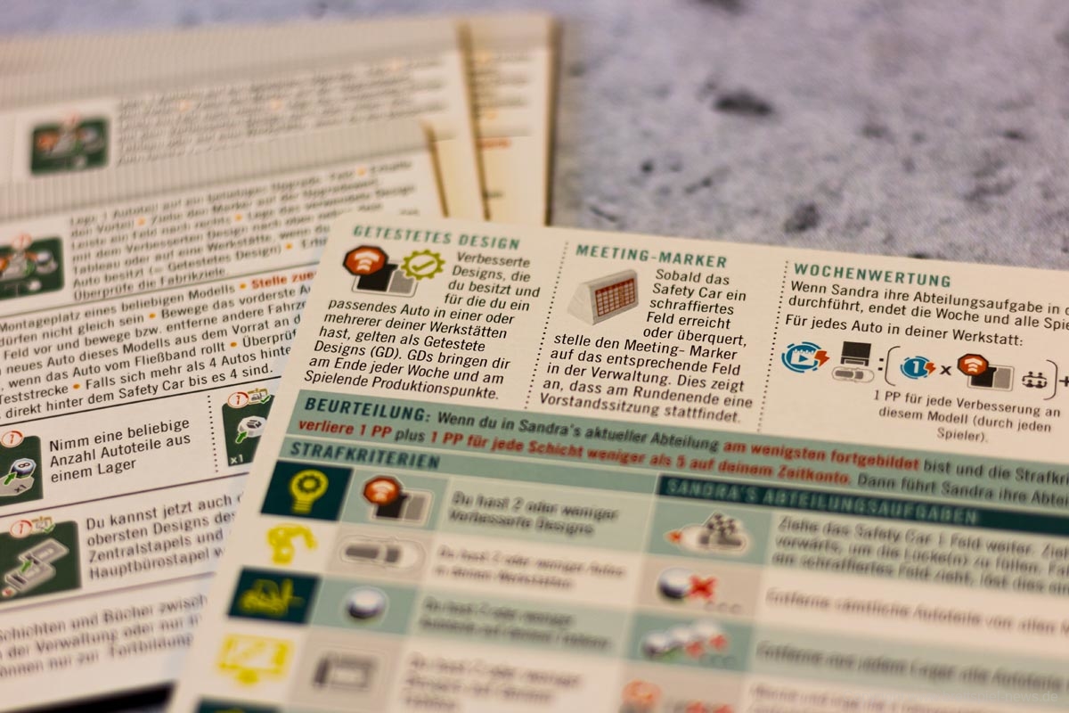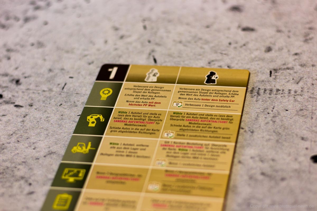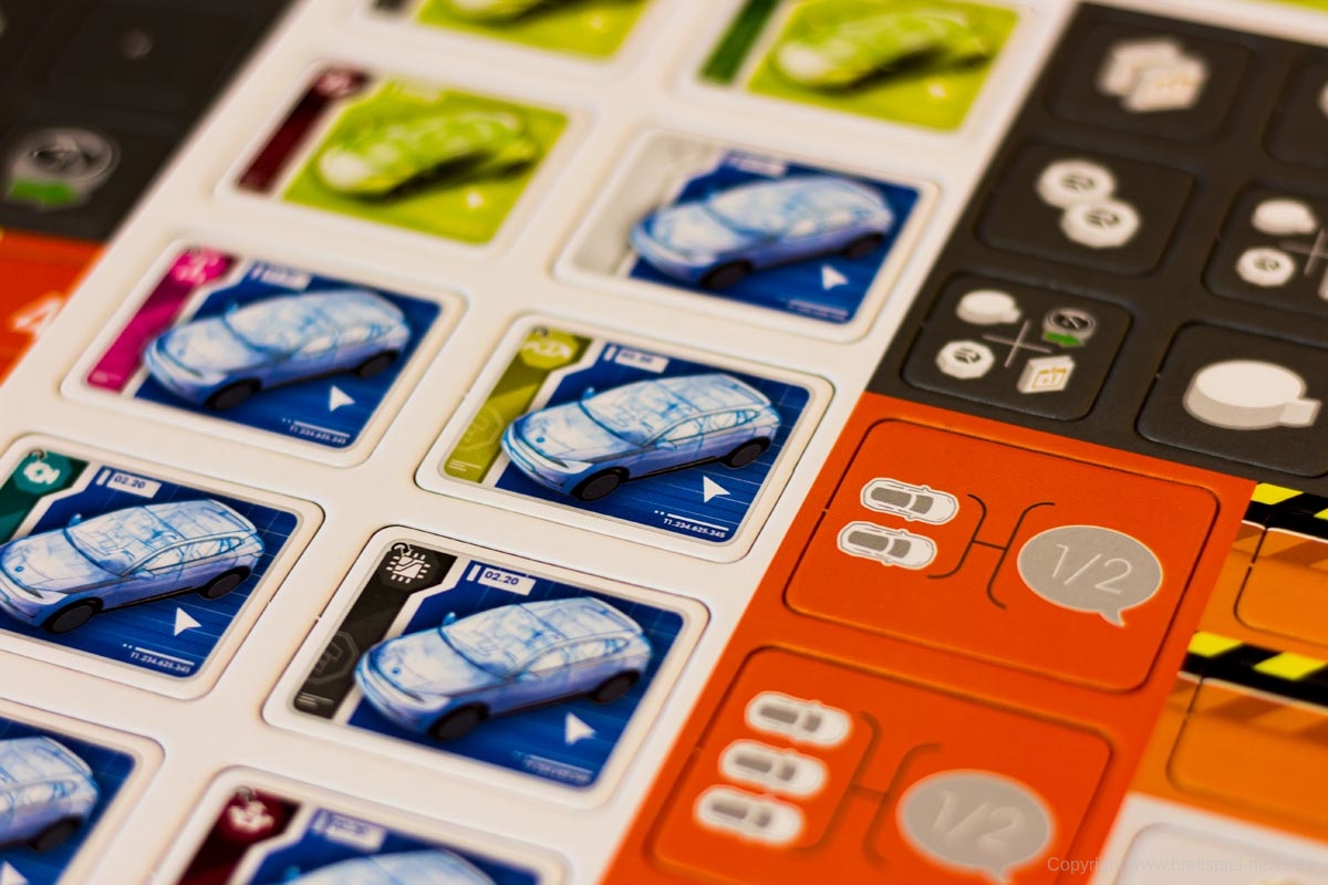 In der Designabteilung liegen Designblättchen mit verschiedenen Automodellen, die auch unterschiedliche Autoteile benötigen, aus. Mit einer Schicht darf der Spieler ein Design auf sein Spielertableau legen.
