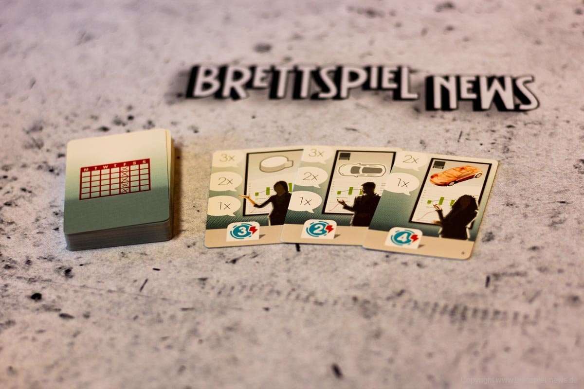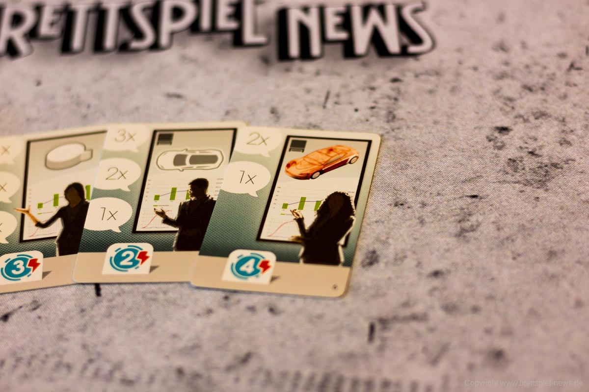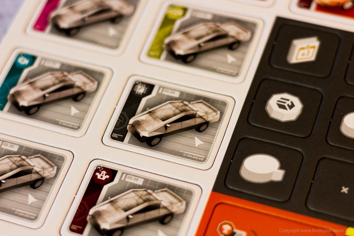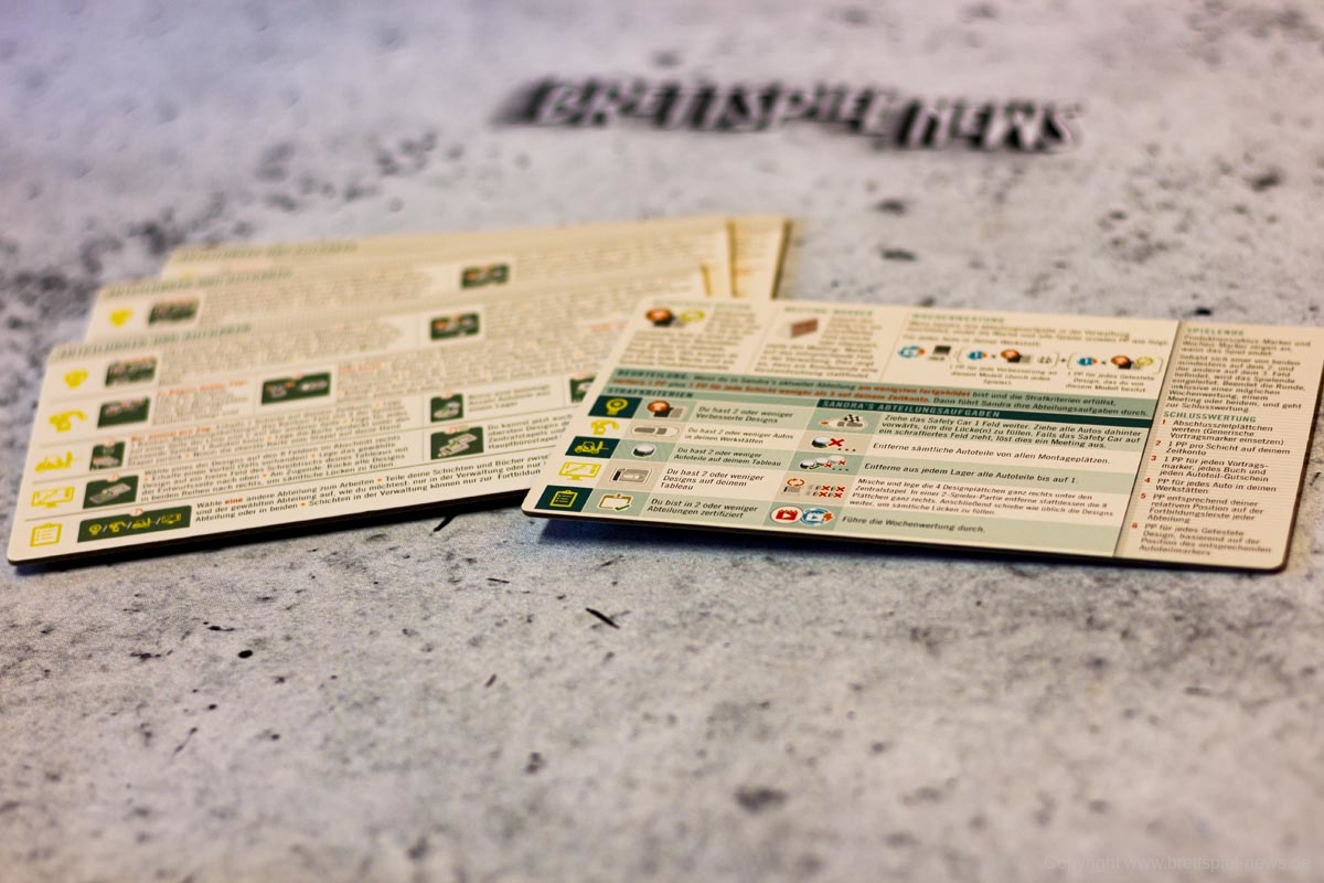 In der Designabteilung liegen Designblättchen mit verschiedenen Automodellen, die auch unterschiedliche Autoteile benötigen, aus. Mit einer Schicht darf der Spieler ein Design auf sein Spielertableau legen.