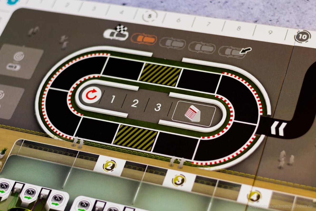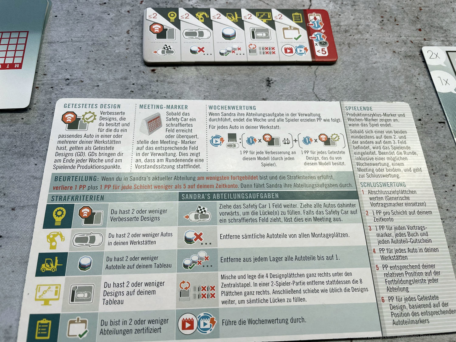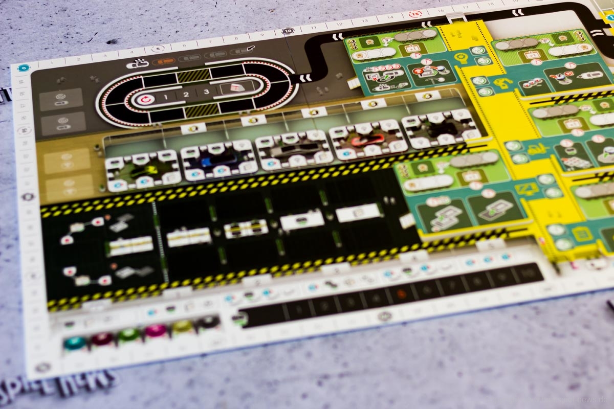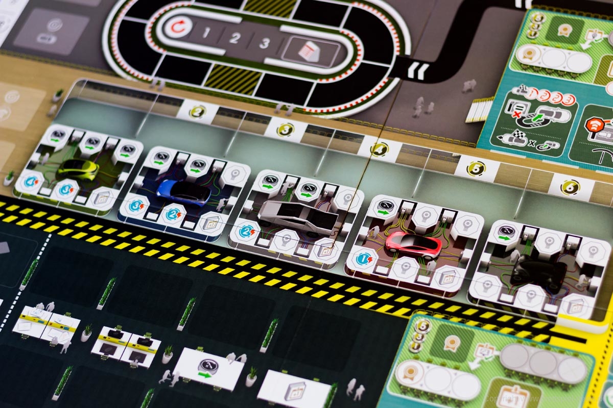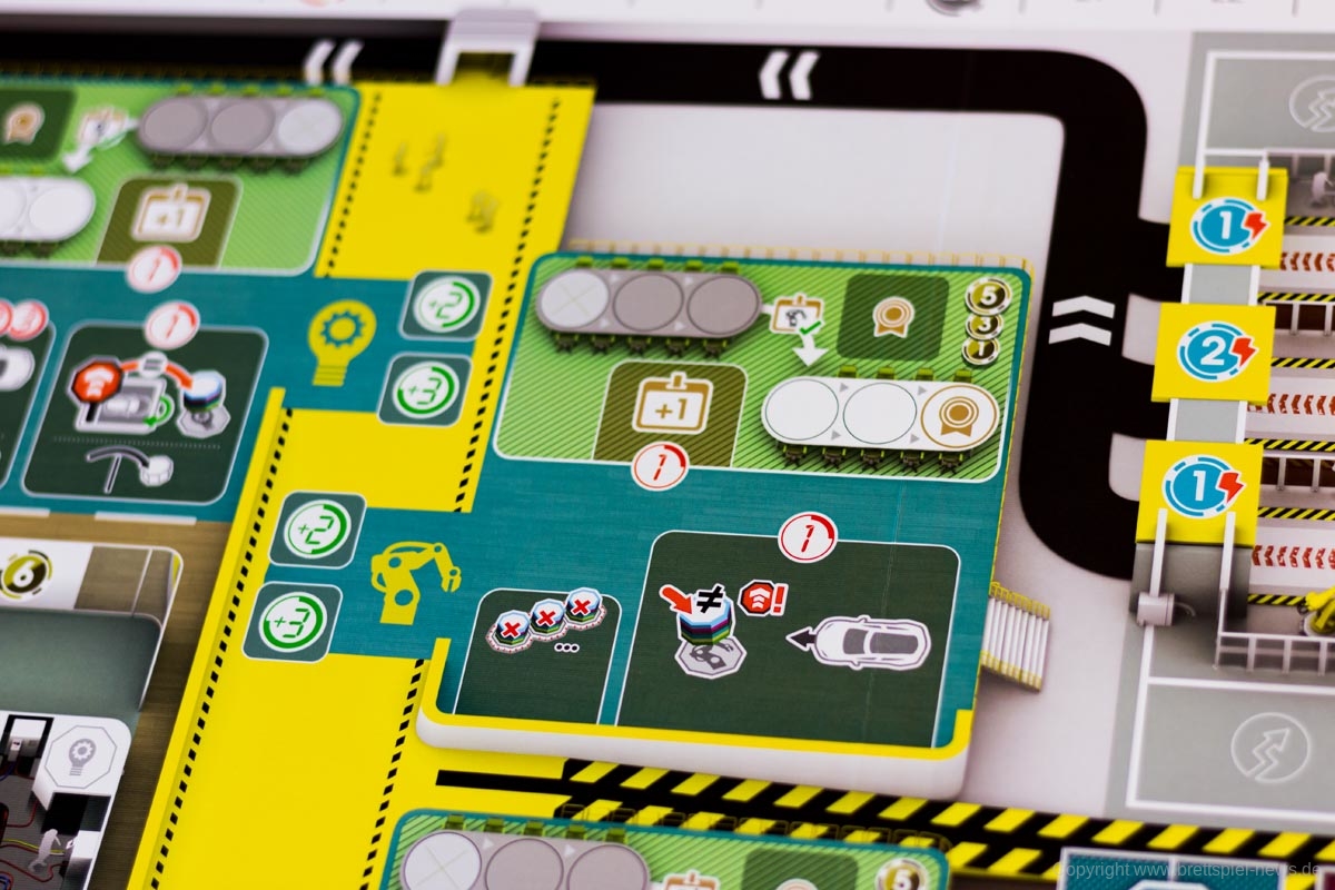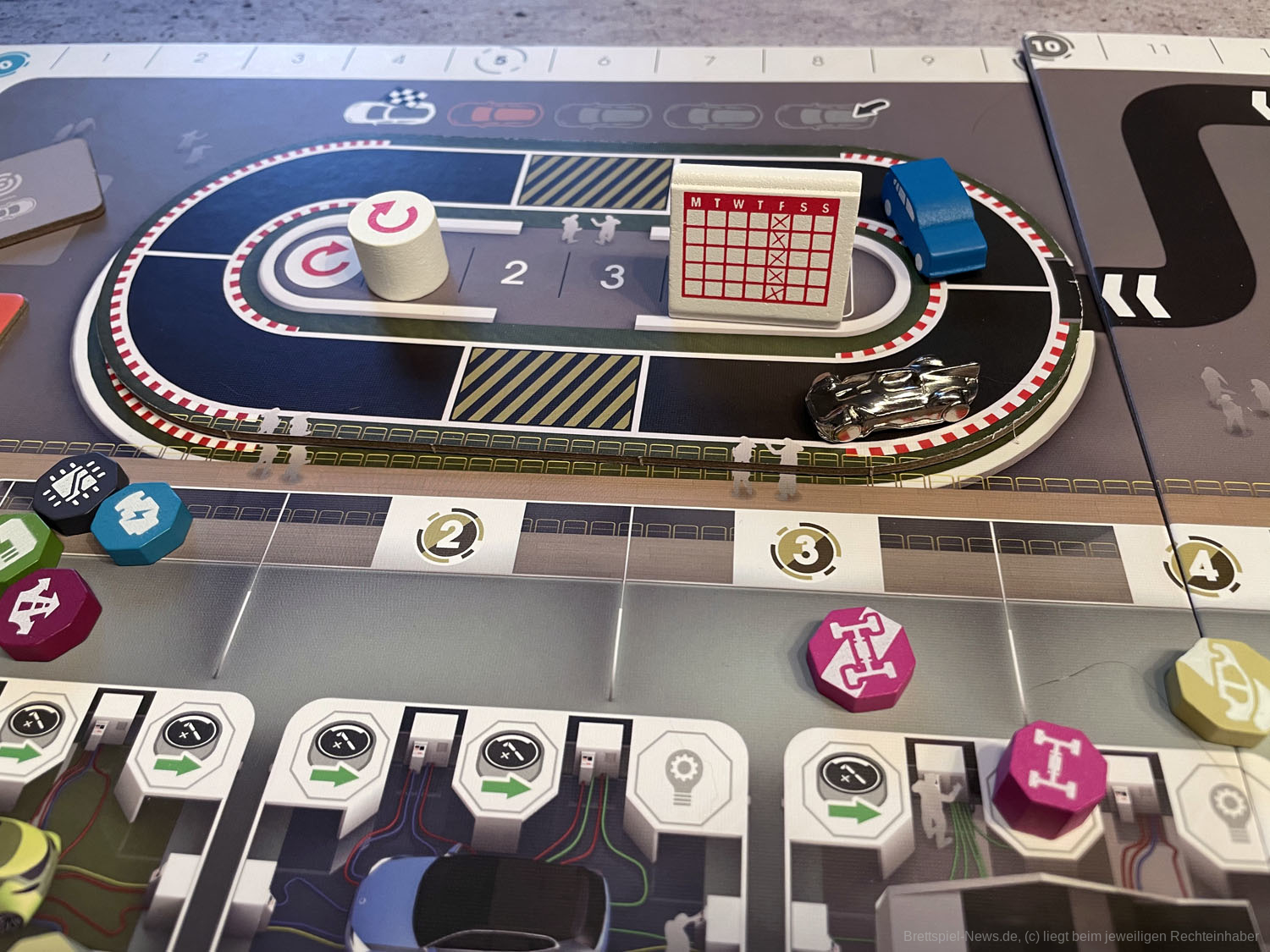 In der Fertigungsabteilung können damit nun verschiedene Automodelle produziert werden. Wird ein Bauteil auf der Fertigungslinie hinter einem Fahrzeug platziert, setzt sich die Produktionskette in Bewegung und das vorderste Fahrzeug dieser Reihe fährt auf dem Fließband einen Platz nach vorne. Hinten wird nachgerückt und ein neues Auto desselben Modells nimmt den Platz ein. Sobald das vorderste Auto auf diese Weise das Fließband vollständig verlässt, fährt es zur Teststrecke und reiht sich hinter dem silbernen ,,Safety Car‘‘. In dieser Abteilung, der Forschung und Entwicklung, kann ein Spieler dieses getestete Auto beanspruchen. Das Modell wird danach auf eine freie Werkstatt auf dem eigenen Spielertableau gestellt und das Safety Car um ein Feld vorwärtsbewegt. Fährt das Safety Car zu irgendeinem Zeitpunkt über ein schraffiertes Feld, ist es Zeit für ein Meeting am Ende dieser Arbeitsphase. In dieser Abteilung besteht für die Spieler außerdem die Möglichkeit, bereits gelagerte Designs zu verbessern. Dafür wird das auf dem eigenen Designblättchen abgebildete Ressourcenteil auf ein Bonusfeld des entsprechenden Modells gelegt und der dazu passende Marker auf der Upgradeleiste ein Feld nach vorne gesetzt. Besitzt der Spieler das zum verbesserten Design passende Automodell, gilt es als ,,getestetes Design“ und gibt dem Spieler mehr Siegpunkte bei der Wochenwertung und am Ende des Spiels.