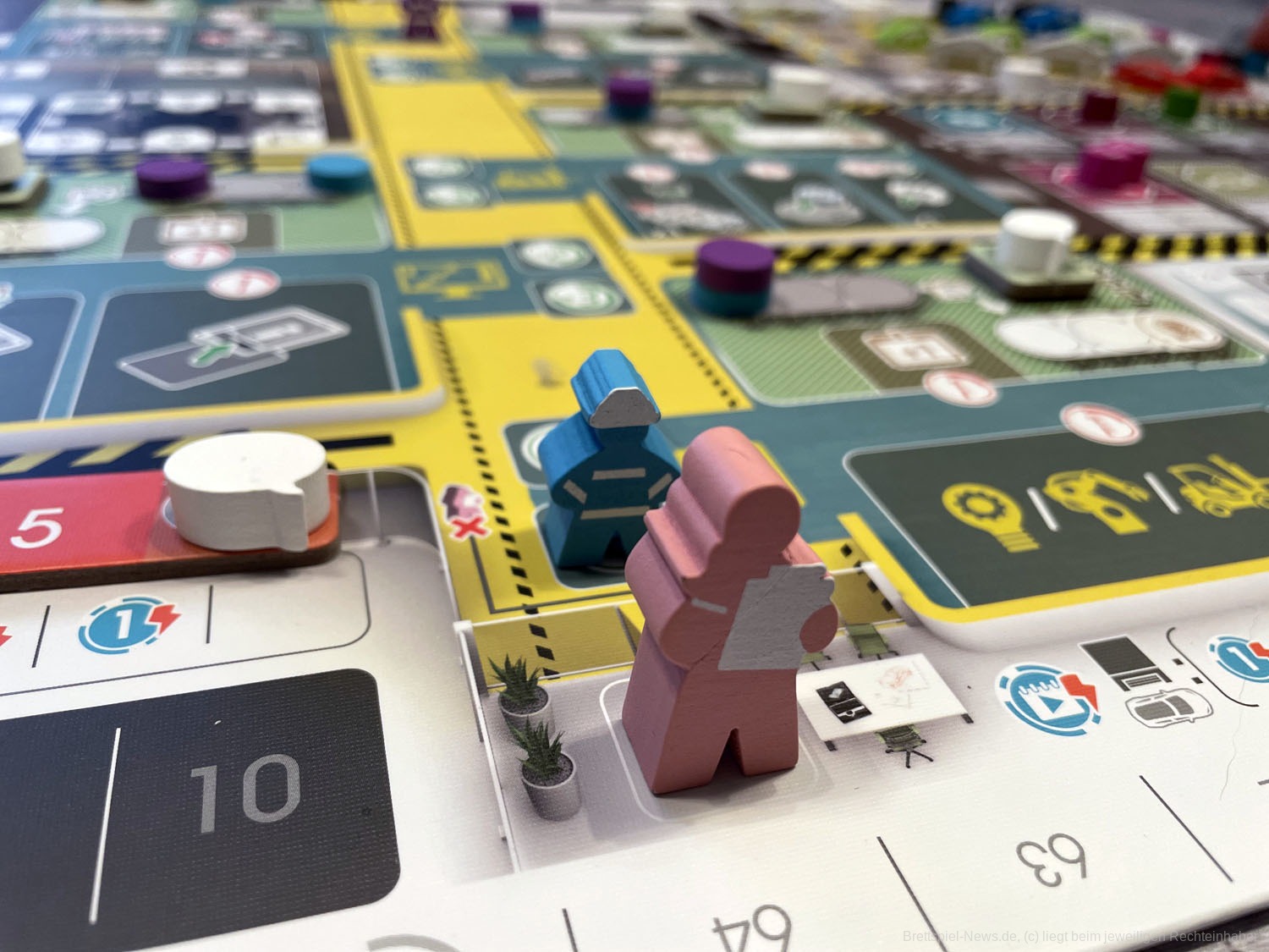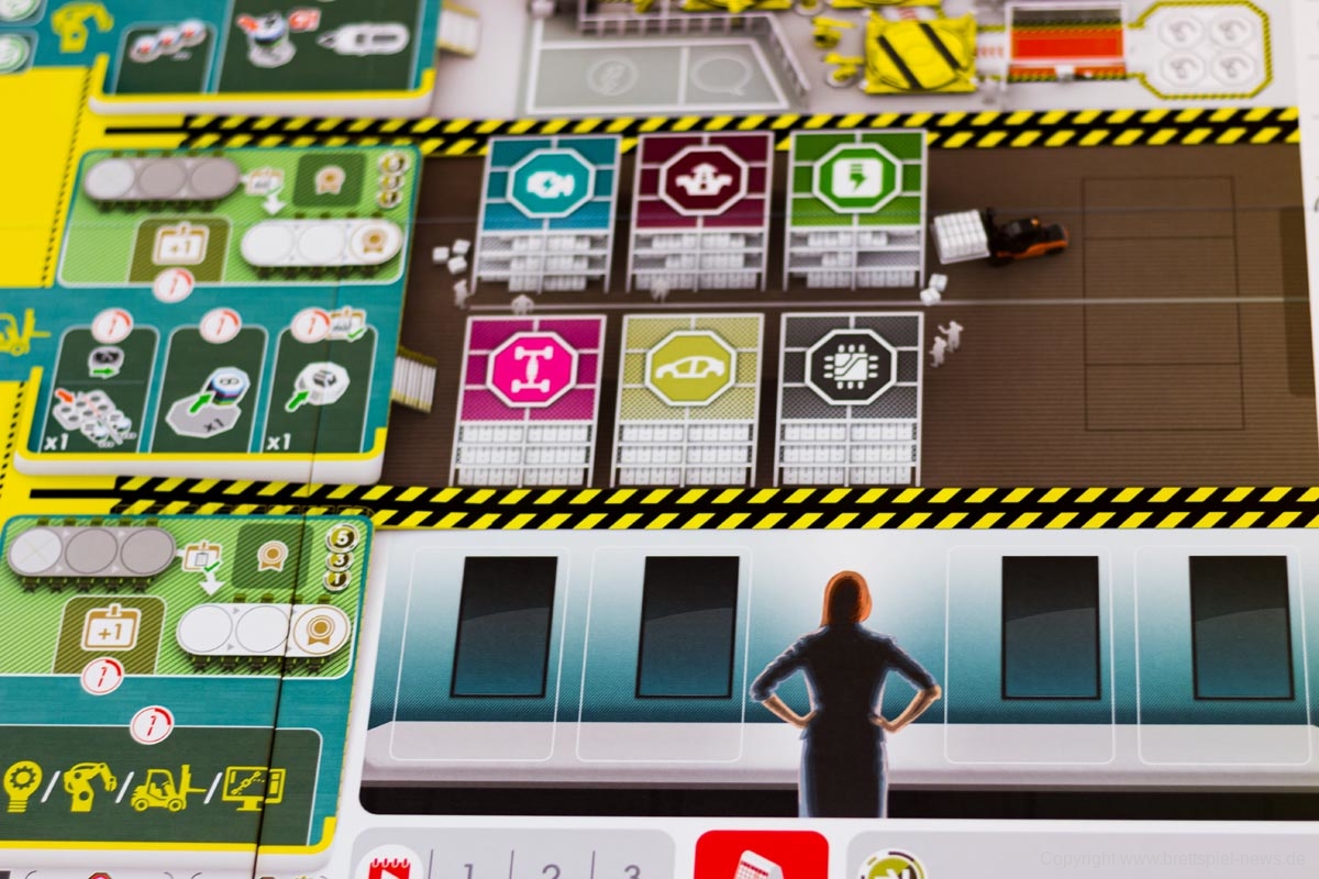 „Lacerda-Kenner“ wissen bereits: In seinen Spielen liegt die Antwort auf die philosophische Frage, „Was war zuerst da: das Huhn oder das Ei – die Mechanik oder das Thema?“, auf der Hand. Man spürt sofort: Die einzelnen Mechanismen wurden erst nach der Themenfindung regelrecht komponiert, perfekt daran angepasst, statt umgekehrt. Die Mechanik transportiert das Thema. Vom Lesen der ersten Seite des Regelhefts bis zum letzten Setzen eines Ressourcenmarkers bin ich als Spieler Teil dieser Fabrik. Das simple Stellen der rosa Figur mit Klemmbrett auf das Spielfeld löst in mir das Bild der kaltschnäuzigen Chefin aus, die sich in allen Abteilungen über meine Fortschritte informiert und mir bei jedem Handgriff kleinlich über die Schulter schaut. Ein bunter Holzklotz berührt eine reduziert illustrierte Pappkarte und schon befinde ich mich in einem Konferenzsaal, einen Vortrag über meinen aktuellen Leistungsstand bezüglich der Verbesserung des Fahrassistentensystems unseres Kleinwagenmodells haltend. Sandra gähnt. Die Wochenwertung steht ebenfalls noch aus…