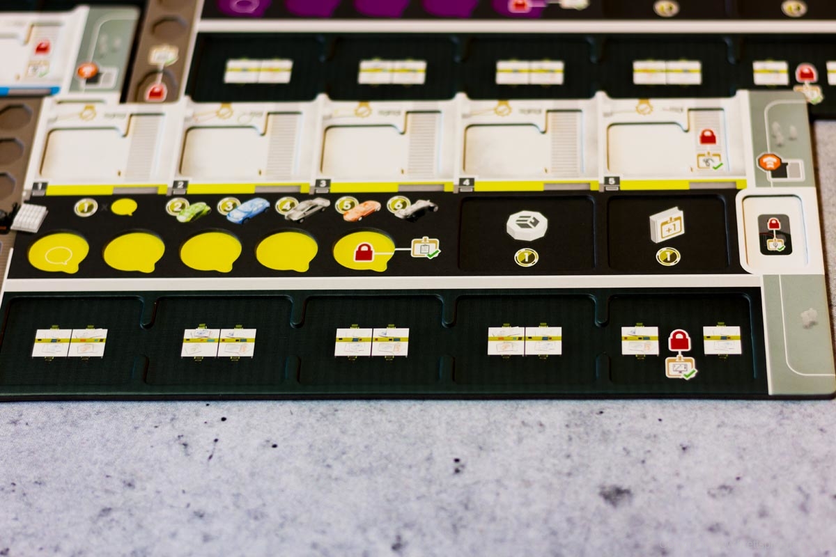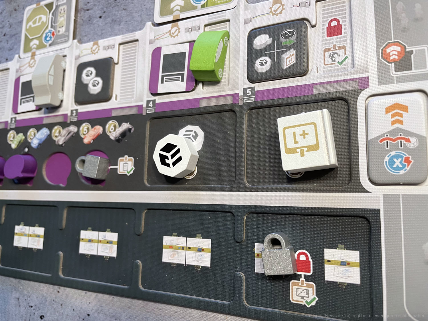 In jeder dieser Abteilungen können Schichten zur Weiterbildung aufgewendet werden. Entsprechend schreitet der eigene Fortbildungsmarker in der jeweiligen Abteilung voran. Überschreitet der Marker die erste Hürde, gilt der Arbeiter als zertifiziert und darf den dazu passenden Bereich auf seinem Spielertableau freischalten. So entsteht mehr Platz für das persönliche Lagern von Designs, Autos und Ressourcen.