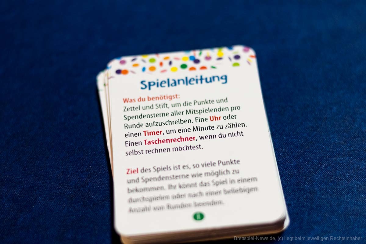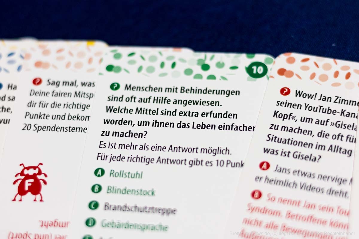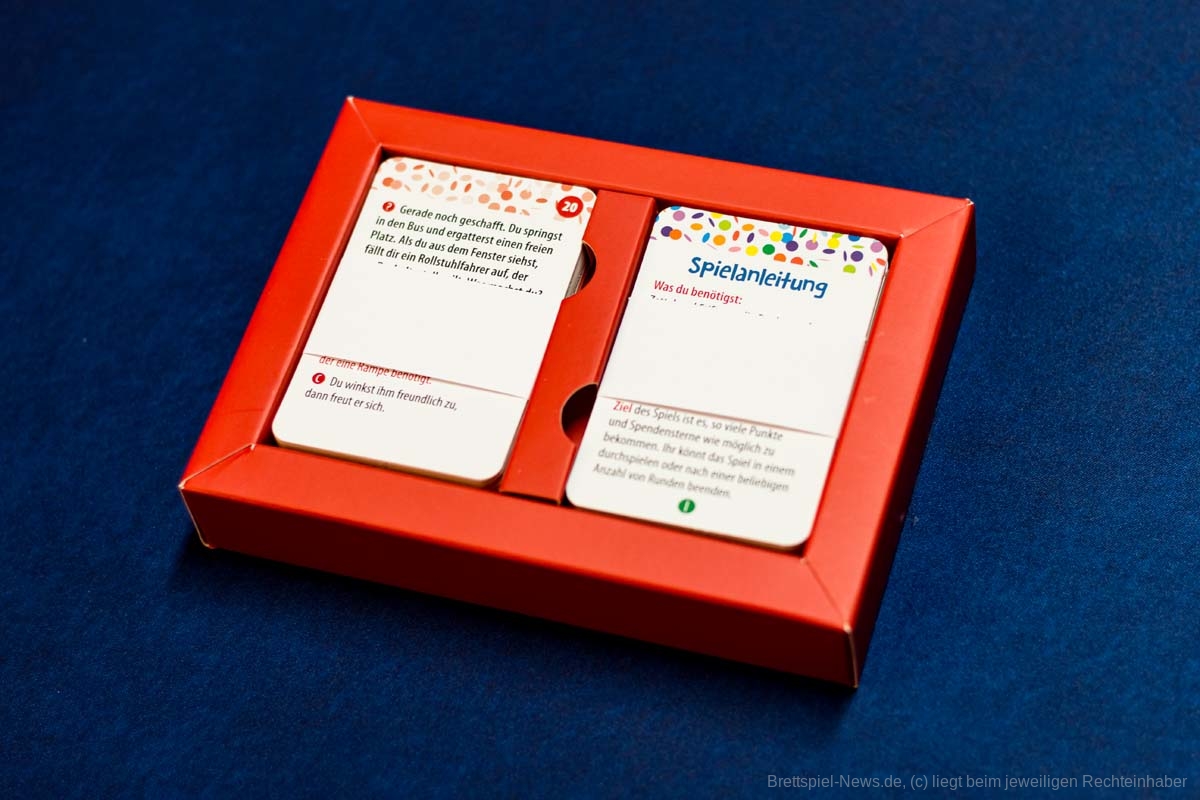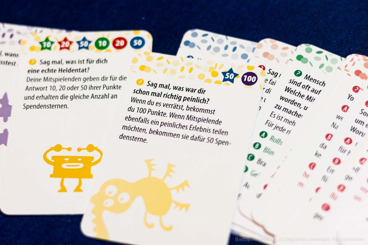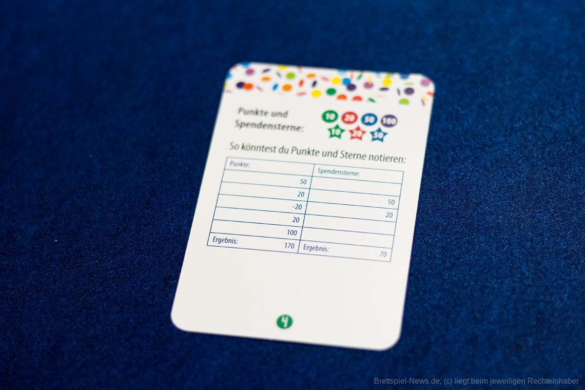 Dennoch wird diese nicht konsequent bei den Fragen berücksichtigt, denn die Schwierigkeit der Fragen variiert von sehr einfach bis sehr schwer. Außerdem erschließt sich mir in diesem Kontext nicht, warum es Aufgaben gibt, wie „ein Lied singen“ oder „Hampelmänner machen“. Wie passen diese mit dem Thema zusammen? Zudem gibt es Karten, durch die der Spieler Punkte verliert oder mit einem anderen Spieler teilen muss, ohne dass es einen erkennbaren Sinn hat oder der Spieler Einfluss darauf hat. Hierbei gibt es ebenfalls das Problem, dass Spieler nicht immer für moralische Entscheidungen belohnt werden, sondern es zum Teil aus taktischen Gründen Sinn ergibt, bei den Mitspielern nicht mitzumachen oder diesen zu helfen. Gerade bei einem Spiel, in dem es hauptsächlich um Respekt, Wertschätzung und Empathie geht, ist dieses kontraproduktiv. Das Punktesystem hat somit generelle Schwächen und wird durch die Spendensterne unnötig verkompliziert, ohne dass die Spieler einen großen Einfluss auf diese haben.
