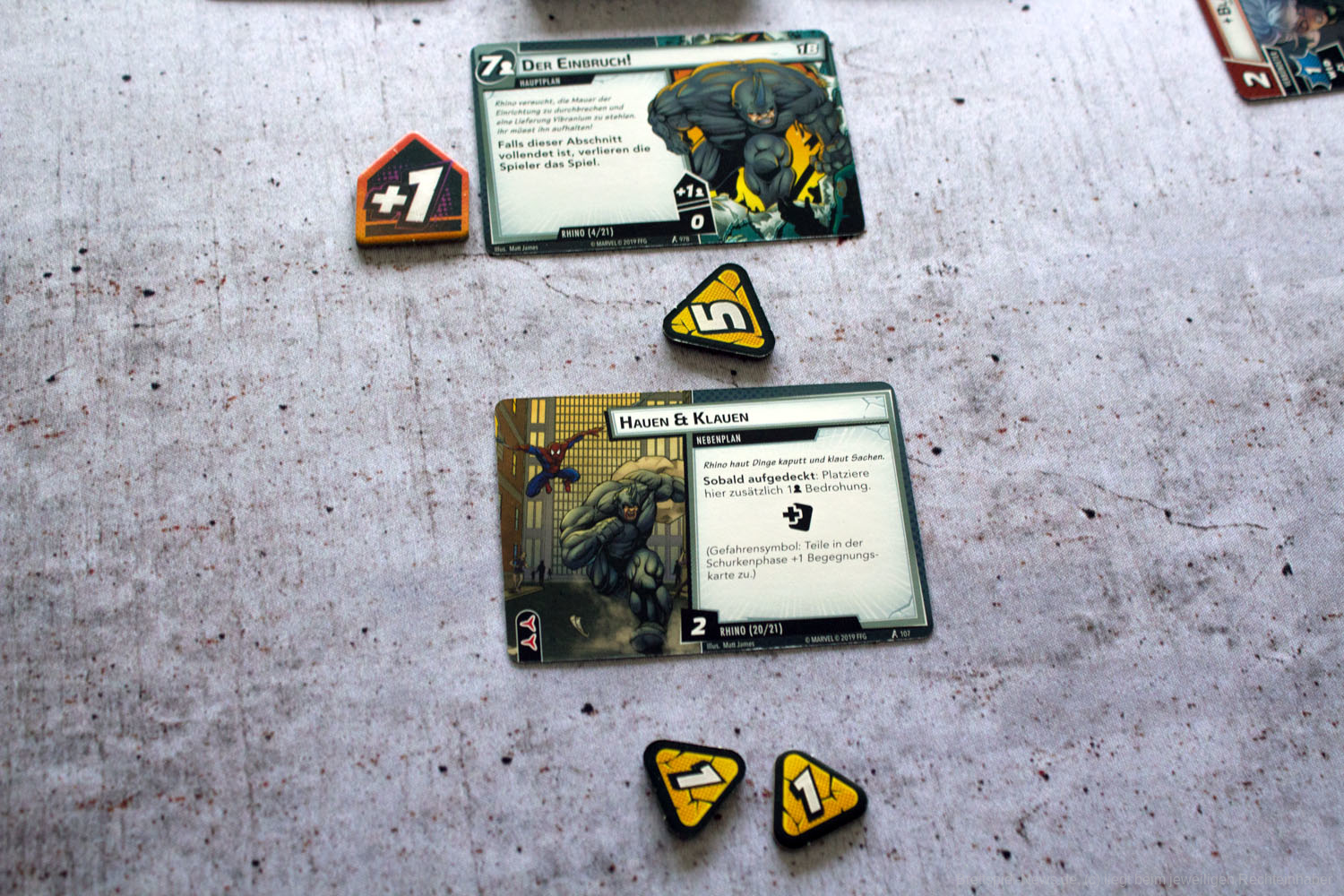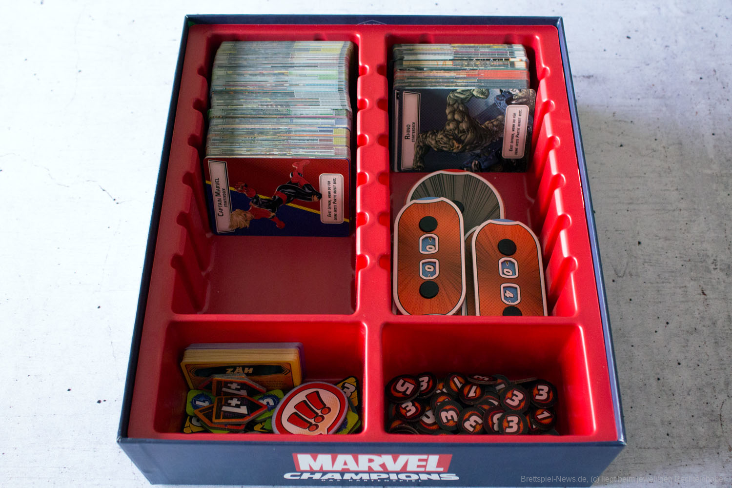 Bei MARVEL CHAMPIONS handelt es sich um einen Deckbuilder und dementsprechend stellen eine ganze Reihe von Karten (insgesamt 343) das wesentliche Spielmaterial der Box dar. Die Oberfläche der Karten ist glänzend, was leider schnell zu unschönen Fingerabdrücken auf den Karten führen kann. Neben einer ganzen Reihe Papp-Markern befinden sich noch vier kleine Lebenspunktezähler für die Heldenfiguren und 1 großer Zähler für den Schurken in der Box. Leider sind gerade die kleinen Zähler recht schwerläufig hinsichtlich des Bewegens der Scheiben. Die Schachtel wirkt auf den ersten Blick überdimensioniert für eine Handvoll Marker und Karten, ist aber für die Aufnahme zukünftig erscheinender Packs gewappnet. Unverständlich ist, warum trotz vorhandener Einsparungen in den beiden Kartenslots keine vernünftigen Trenner im Lieferumfang enthalten sind.