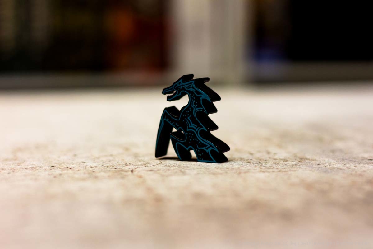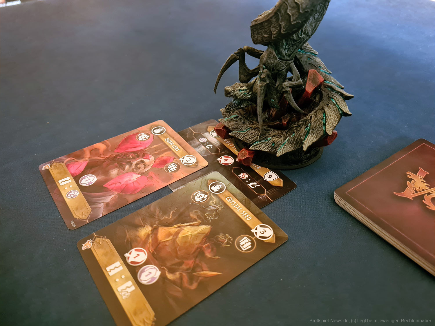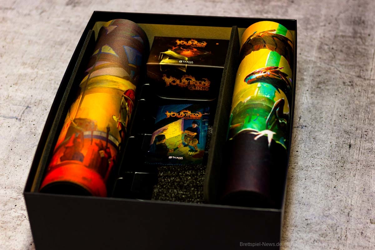 Die große Volfyirion-Miniatur trifft einen Mittelweg zwischen Ästhetik und Nützlichkeit. Im Grunde tauscht die große Resinminiatur nur das kleine Holztoken des normalen Spiels aus, um eine bedrohlichere Präsenz auf dem Spieltisch darzustellen. Zusätzlich wurde der Miniatur eine kleine Mini-Erweiterung beigelegt, die in VOLFYIRION und VOLFYIRION GUILDS genutzt werden kann. Geben die Spielenden während des Spiels nämlich 10 Ressourcen aus, können sie einen Kristall an der Basis der Miniatur herausziehen. Diese Kristalle verfügen über kleine Zahlen (von 1-5) und können im Nachhinein abgeworfen werden, um eine Karte des Gegners mit Kosten in Höhe der Nummer des Kristalls aus dem Spiel zu entfernen. Spielgruppen, die nicht nur gerne große Wyrm-Miniaturen auf dem Spieltisch sehen, sondern auch zusätzliche Regeln erhalten möchten, die das Spiel noch vielseitiger gestalten, könnten hier schwach werden.