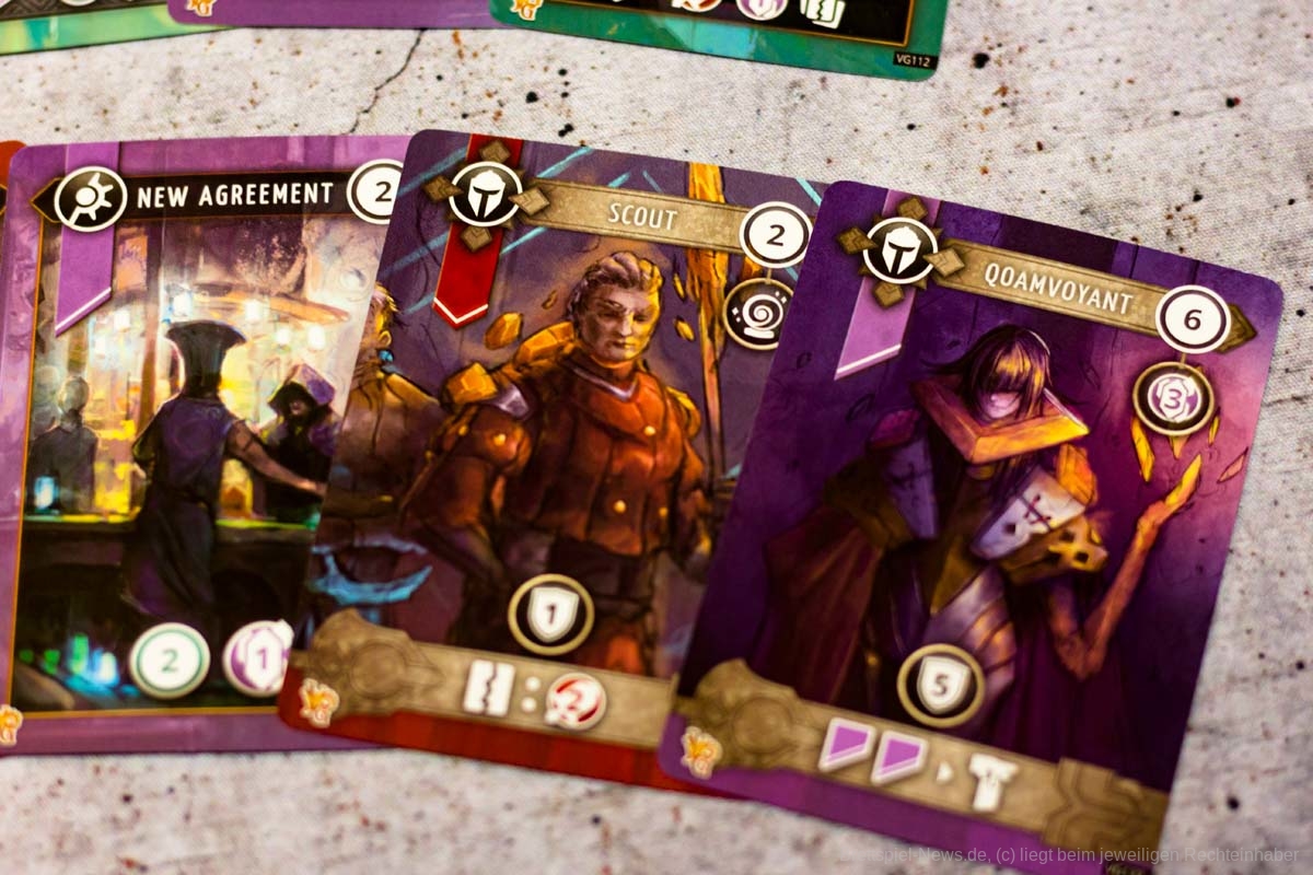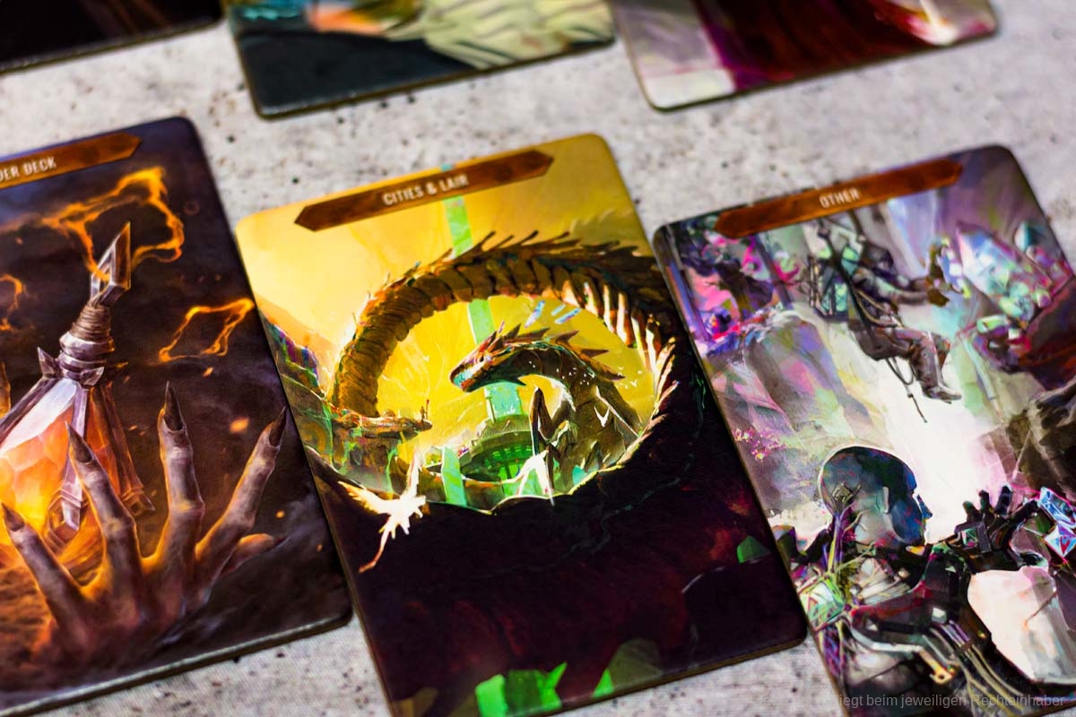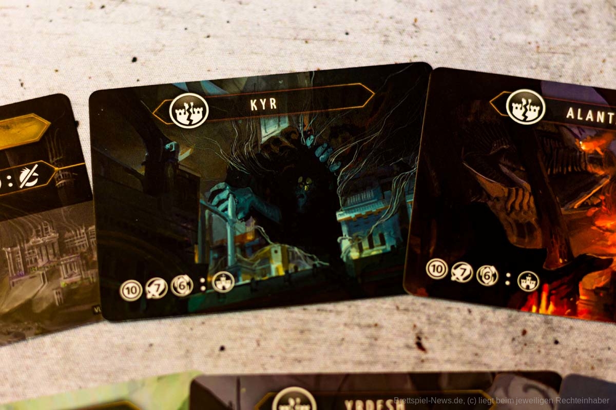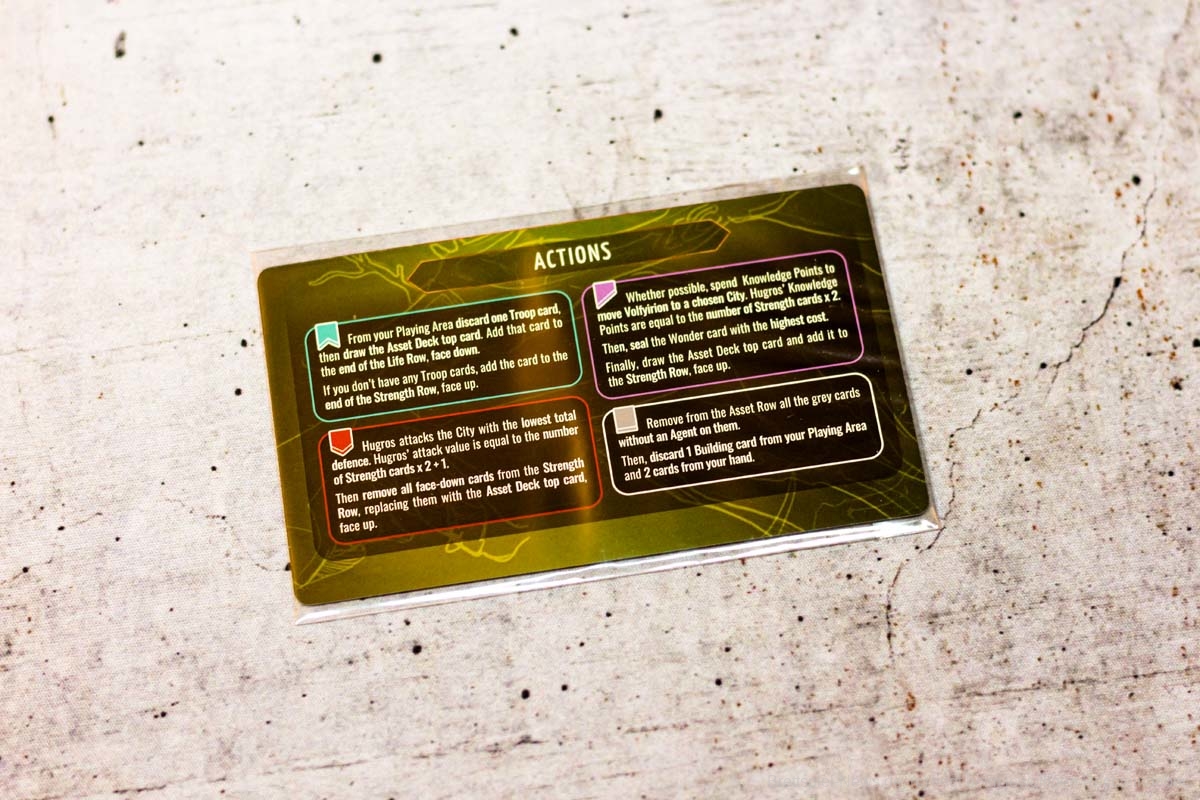 Die Karten besitzen drei unterschiedliche Ressourcen, mit denen die Spielenden unterschiedliche Strategien verfolgen können. Mit den türkisen Kommandopunkten können Karten erworben werden, mit den roten Kampfpunkten die Städte des Gegners zerstört oder Karten aus Volfyirions Hort erkämpft werden und mit den violetten Wissenspunkten werden Karten aus der zentralen Auslage ausgetauscht oder Volfyirion wird davon überzeugt, dass er einer gegnerischen Stadt einen Besuch abstatten sollte.