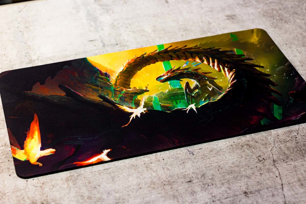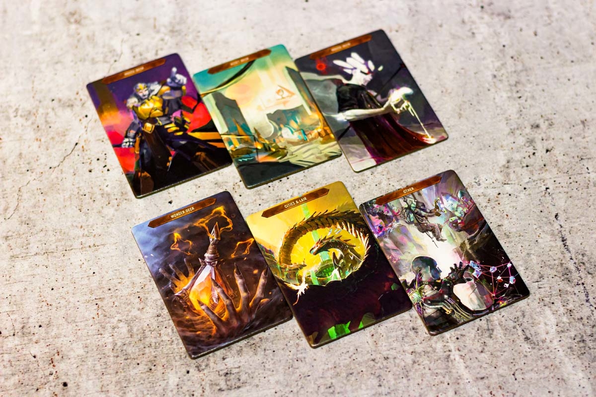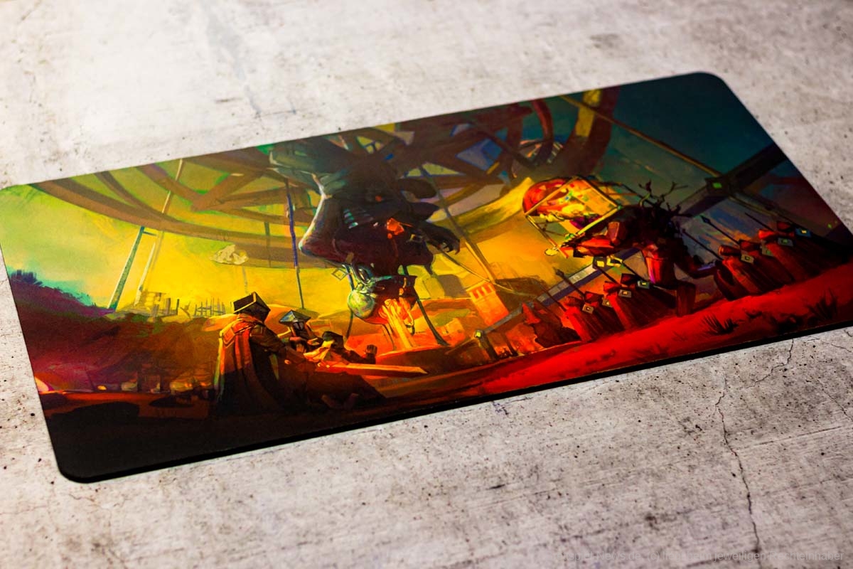 TABULA GAMES war so freundlich, uns nicht nur die Spiele an sich zu schicken, sondern auch die große Big Box des Spiels, die Platz für alle Spiele, Erweiterungen und sonstiges Zubehör bietet. Die hier enthaltenen Spielmatten, die in der fertigen Ausführung dünner als im Prototyp sein werden, bieten, neben dem sehr schön gestalteten Artwork, eine angenehme Spielfläche, die aber darüber hinaus keine weiteren Funktionen erfüllt. Wir hätten Markierungen toll gefunden, die dem Spiel ein wenig mehr Struktur verliehen hätten. In dieser Form bietet sie aber insbesondere Spielgruppen, die bereits Spielmatten als Tischunterlage nutzen, bis auf die Ästhetik keinen Mehrwert.