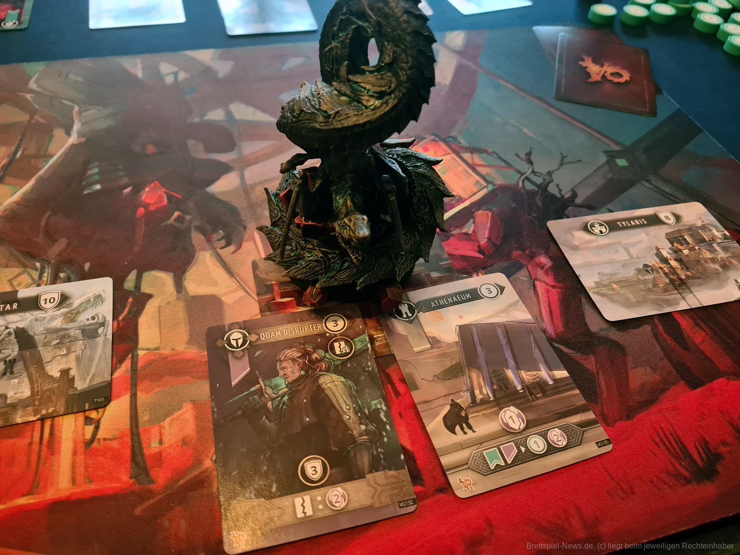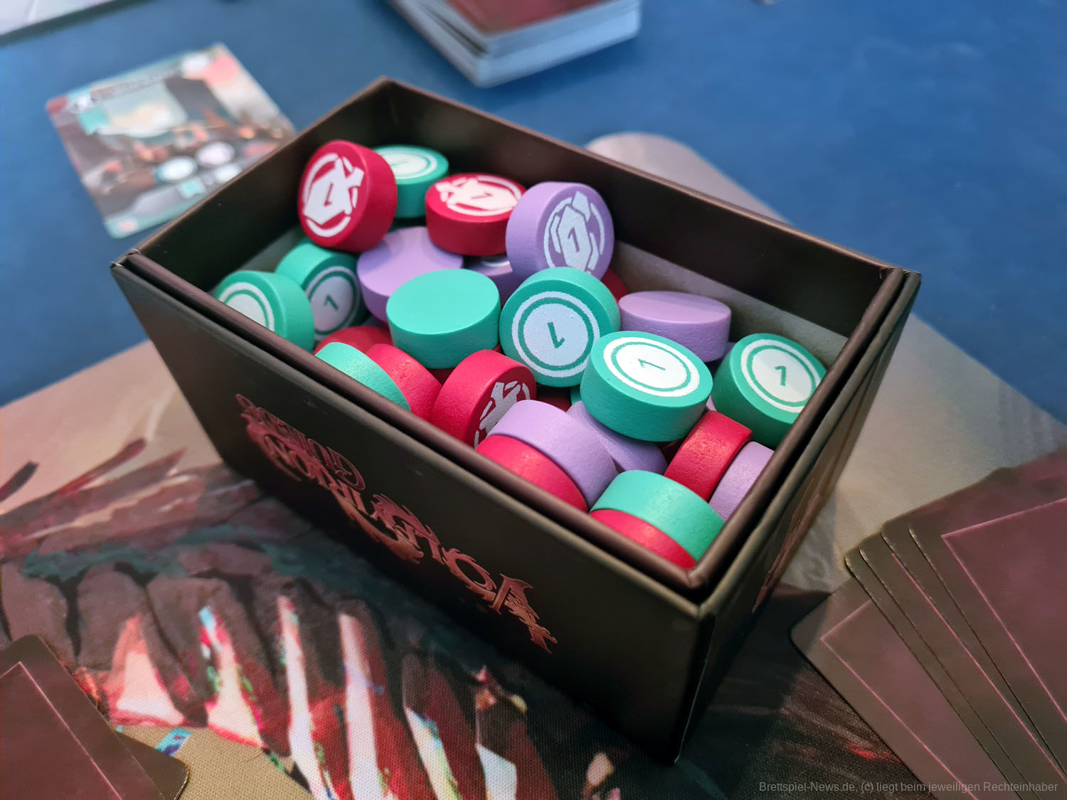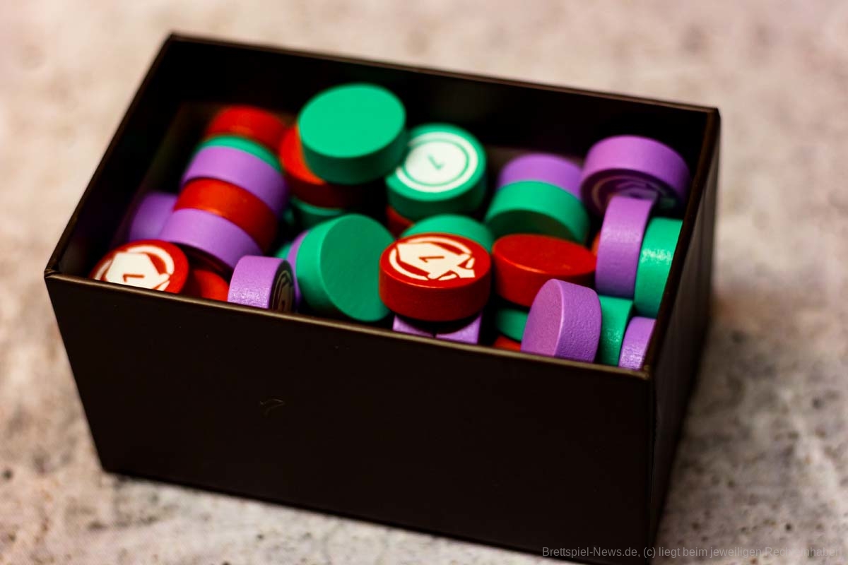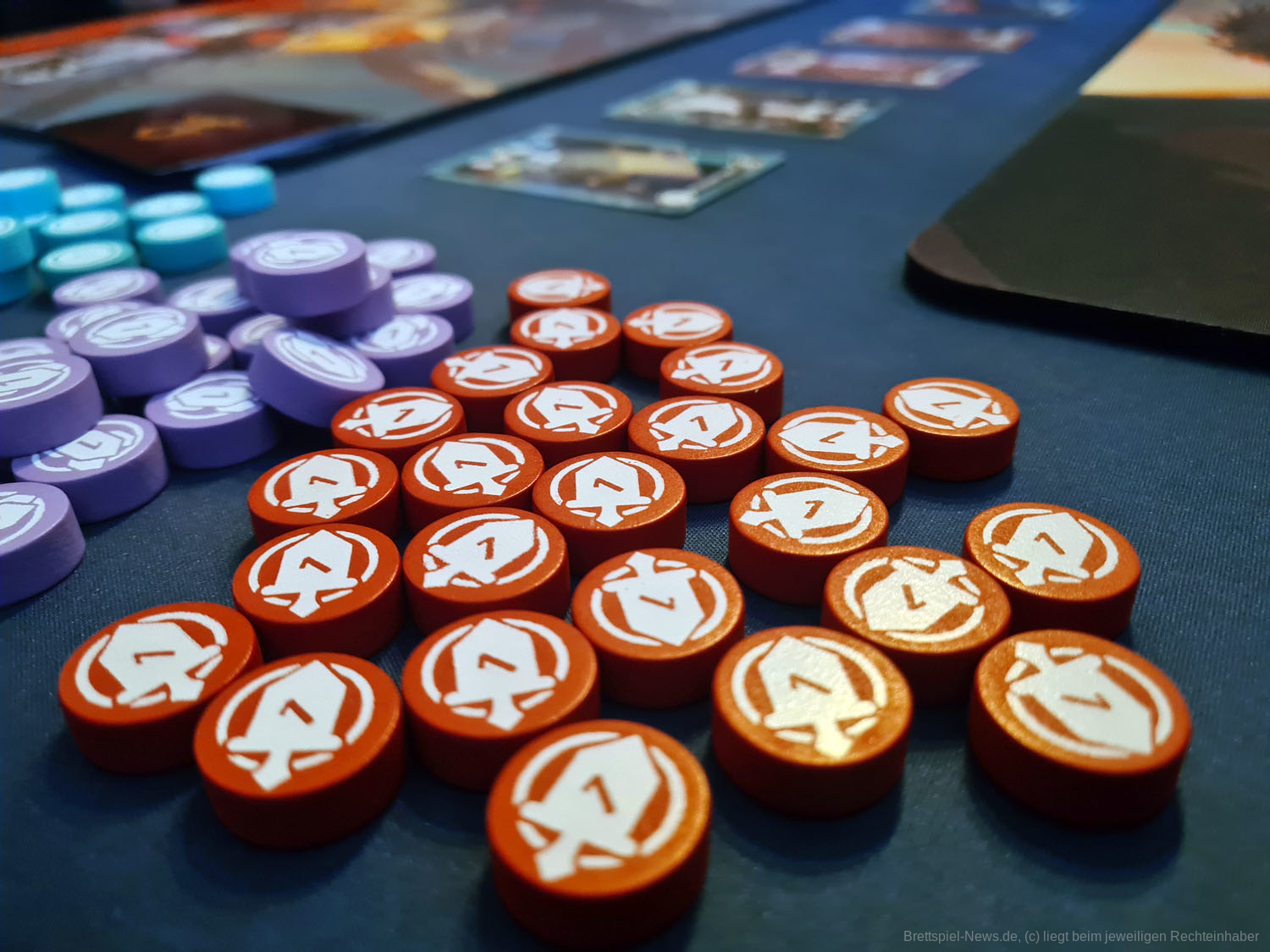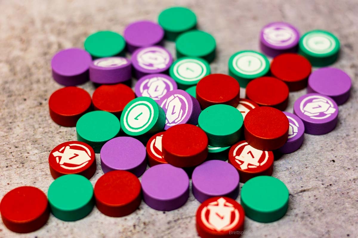 Einen großen Vorteil besitzen im Vergleich dazu die Holztoken, die dafür genutzt werden, die unterschiedlichen Ressourcentypen, die die Spielenden innerhalb des Spielzuges erhalten, im Überblick zu behalten. Sind sie zu Beginn des Spiels noch eher unnötig, steigert sich ihre Relevanz mit jeder Runde, da immer mehr Ressourcen produziert werden und es damit immer schwieriger wird, den Überblick darüber zu behalten, welche Ressourcen bereits ausgegeben worden sind.