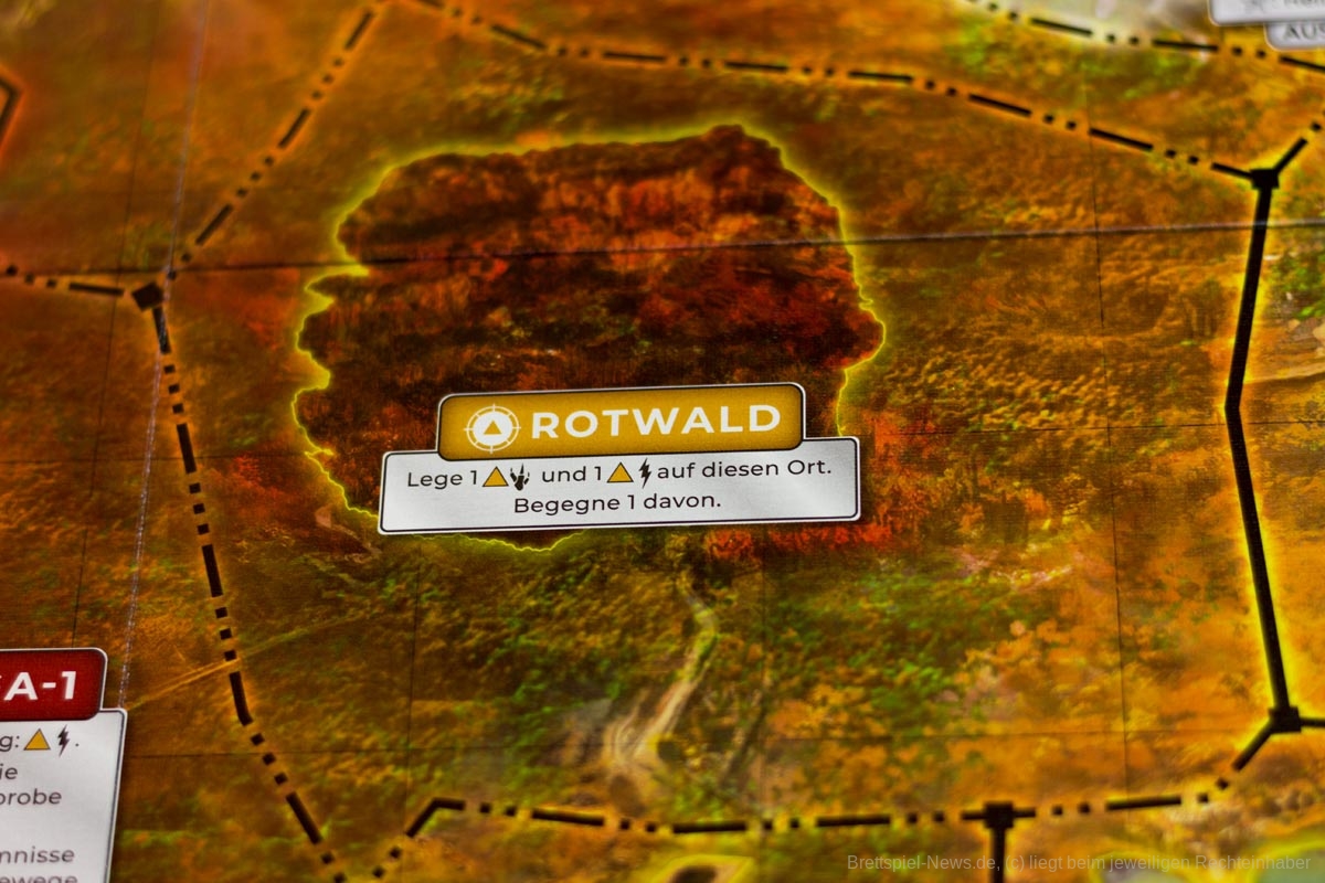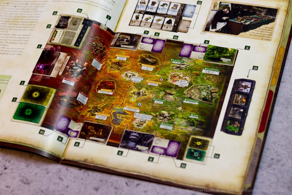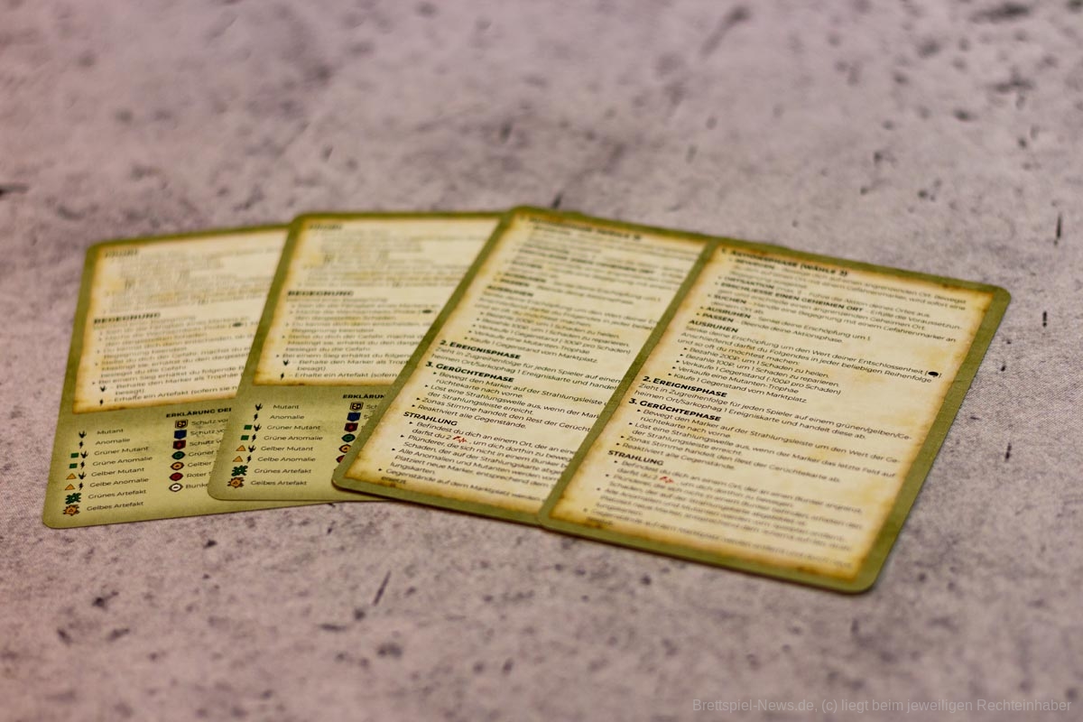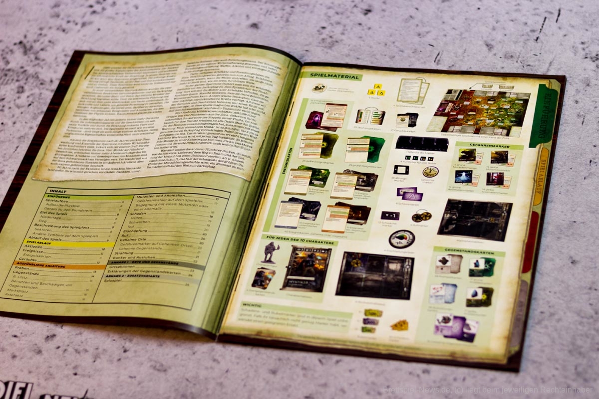 Die Anleitung liegt auf Deutsch bei und ist mit fast 30 Seiten umfangreich. Allerdings enthält sie große Bilder, teilweise sogar doppelseitige, und zahlreiche ausführliche Beispiele. Im ebenfalls enthaltenen Anhang werden alle Ortskarten, Mutanten- und Anomalieplättchen erläutert, sodass keine Fragen offenbleiben.