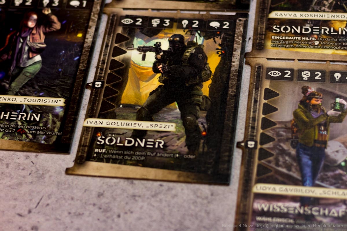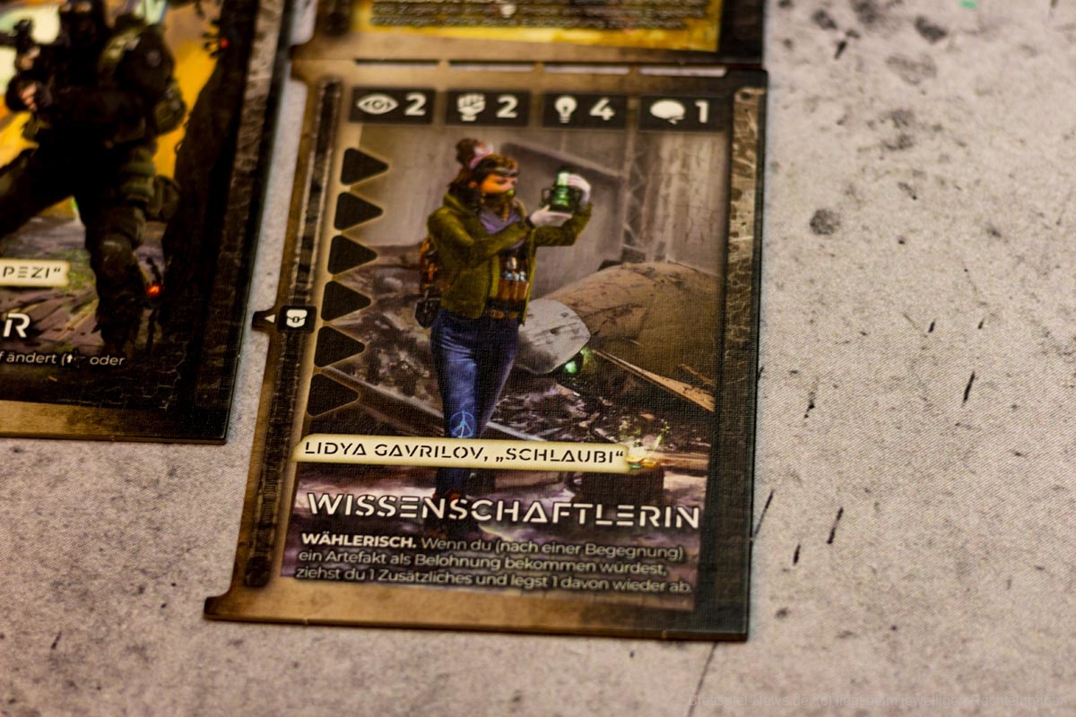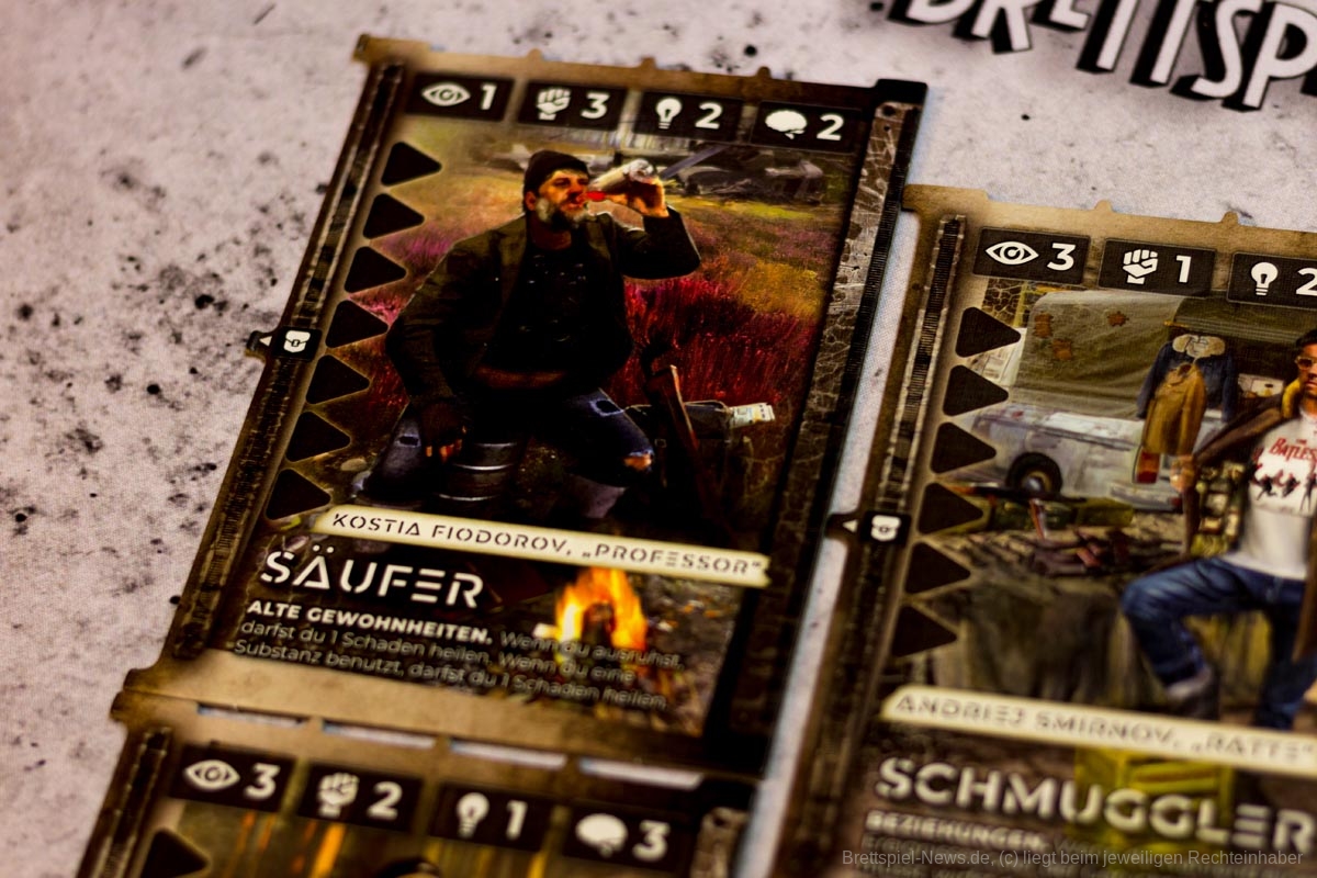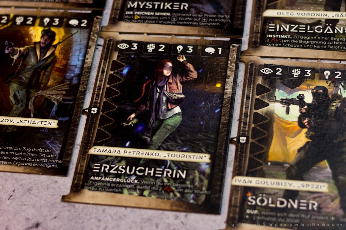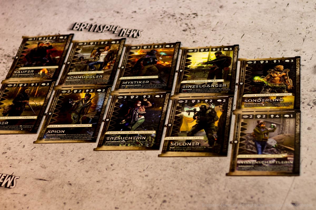Alle Spieler wählen ihre Charaktere und erhalten das passende Tableau und ein Ausrüstungstableau mit Rucksack und Ausrüstungsplätzen. Auf der Rückseite der Charaktertableaus finden sich die Angaben zu Startposition, Startkapital und Reputation. Manche Charaktere starten sogar mit Schadensmarkern, da sie selbst für Plünderer im radioaktiven Niemandsland nicht den gesündesten Lebenswandel pflegen. Ebenfalls gibt jedes Tableau zwei Orte für Gefahrenplättchen an, die entsprechend gezogen und verteilt werden. Grüne Plättchen für Mutanten und Anomalien sind leichter zu überwinden, gelbe schwieriger. Da auch das Spielbrett in die drei Farbbereiche rot, gelb und grün aufgeteilt ist und dies auf den Gefahrengrad zurückzuführen ist, werden gelbe Plättchen nur im gelben und grüne Plättchen ausschließlich im grünen Bereich zu finden sein.