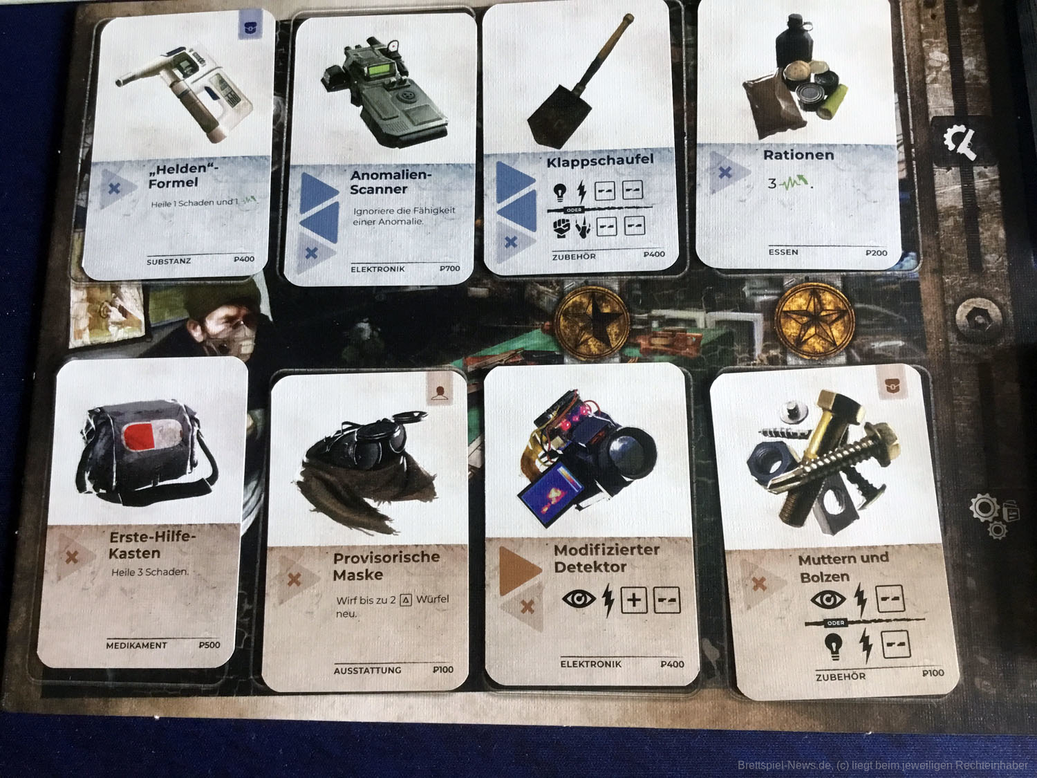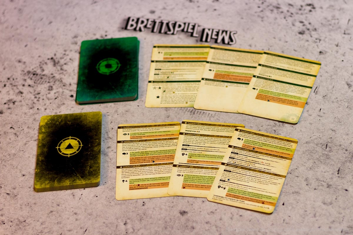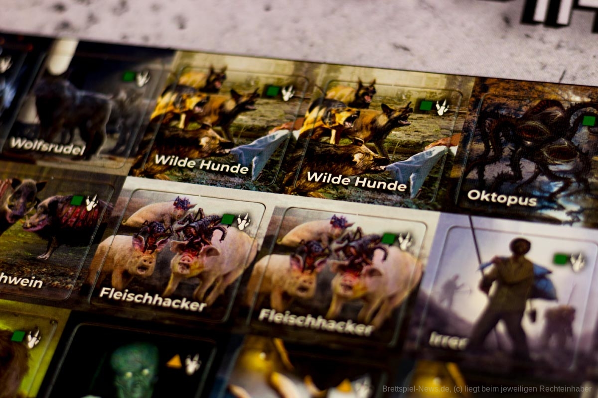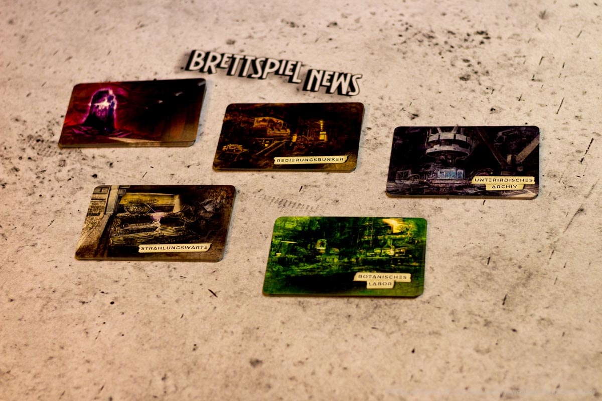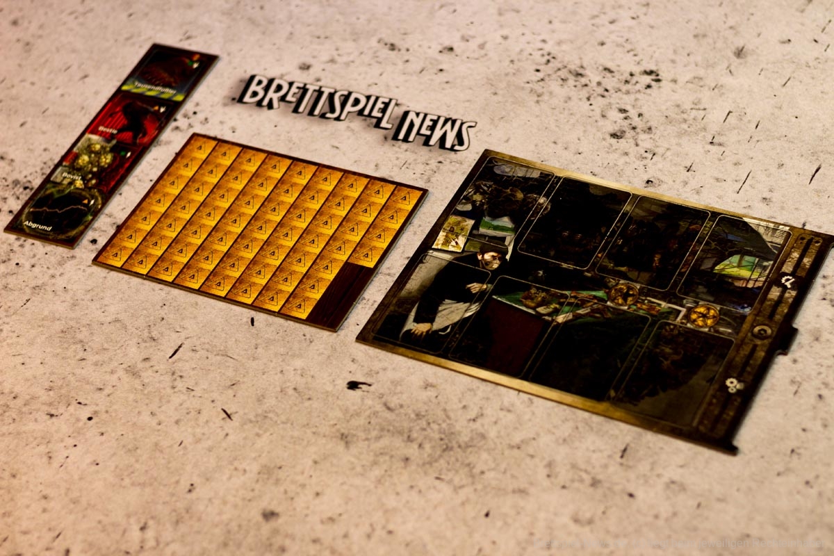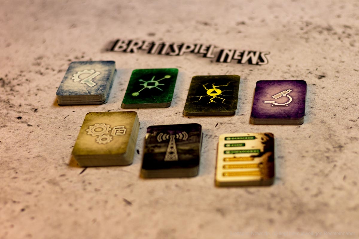 Der Inhalt der Spielschachtel ist umfassend und qualitativ hochwertig. Das beginnt beim passgenauen Schachteleinsatz mit herausnehmbaren Sortierelementen. Mutanten- und Anomalieplättchen können so im Sortiereinsatz direkt neben dem doppelseitigen Spielbrett platziert werden, was den Aufbau beschleunigt. Die zehn detaillierten Miniaturen sind gegen das Umherfallen in der Schachtel mit einem Deckel gesichert. Im gleichen Einsatz finden auch die drei geprägten Würfel Platz. Sowohl die großformatigen als auch die kleinen Karten sind qualitativ hochwertig mit Leinenprägung und guter Materialstärke. Die Ikonographie ist deutlich und leicht verständlich, dennoch liegen dem Spiel große Karten als Spielerhilfen bei und erläutern kurz und ausreichend den Rundenablauf und einzelne Symbole. Pappmarker für Geld und Materialabnutzung sind gut verklebt und fransen nicht aus. Die Stanzungen sind ebenfalls gut und so bleibt kaum etwas beim Auspöppeln der Marker am Stanzrahmen hängen. Die Spielertableaus sind zweigeteilt und qualitativ ebenfalls kompromisslos gut. Kein Verbiegen oder Ausfransen trat bisher auf. Zuletzt sind noch die Erschöpfungsanzeiger für die Spieler zu erwähnen, auch diese bestehen aus fester Pappe und sind gut zentriert gedruckt und gestanzt. Die Plastikniete für den beweglichen Zeiger rastet spürbar ein und bietet angemessenen Widerstand, sodass der Zeiger nicht leicht verrutschen kann.