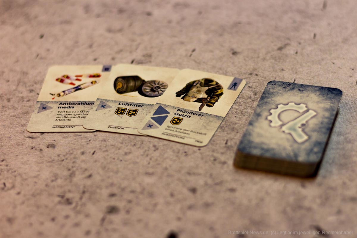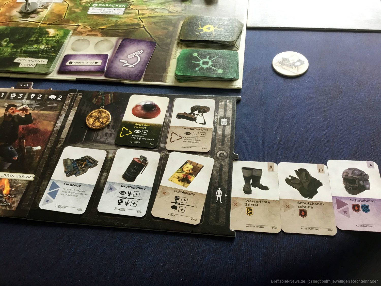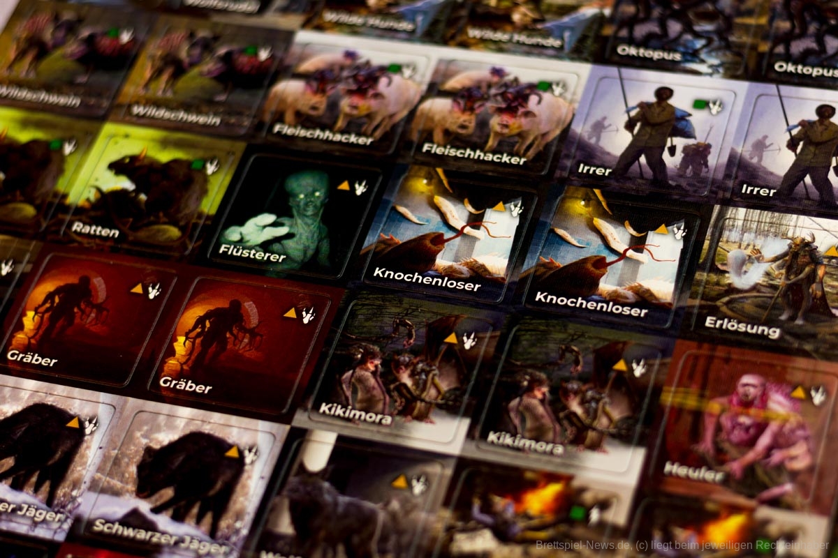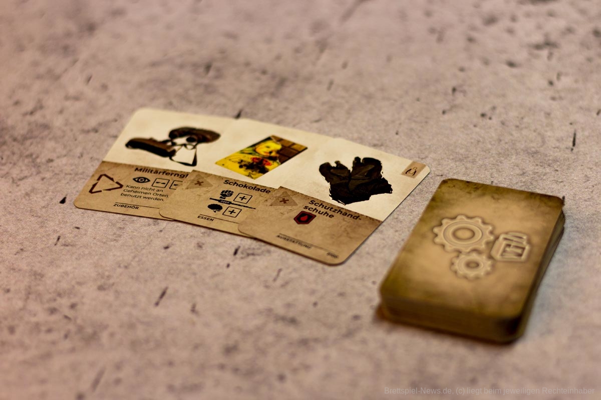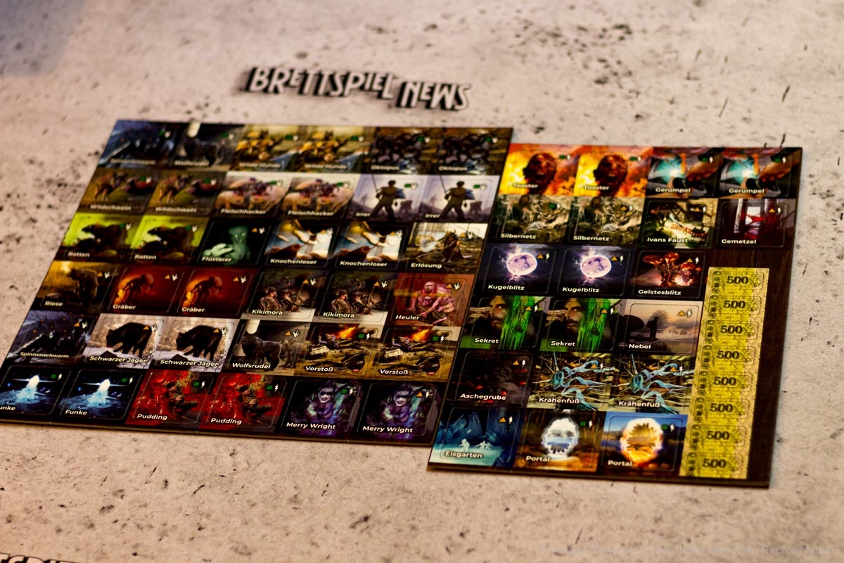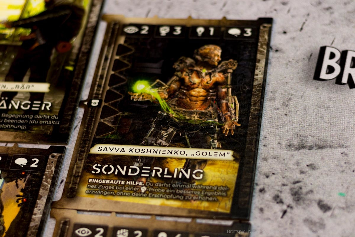 Der Inhalt der Spielschachtel ist umfassend und qualitativ hochwertig. Das beginnt beim passgenauen Schachteleinsatz mit herausnehmbaren Sortierelementen. Mutanten- und Anomalieplättchen können so im Sortiereinsatz direkt neben dem doppelseitigen Spielbrett platziert werden, was den Aufbau beschleunigt. Die zehn detaillierten Miniaturen sind gegen das Umherfallen in der Schachtel mit einem Deckel gesichert. Im gleichen Einsatz finden auch die drei geprägten Würfel Platz. Sowohl die großformatigen als auch die kleinen Karten sind qualitativ hochwertig mit Leinenprägung und guter Materialstärke. Die Ikonographie ist deutlich und leicht verständlich, dennoch liegen dem Spiel große Karten als Spielerhilfen bei und erläutern kurz und ausreichend den Rundenablauf und einzelne Symbole. Pappmarker für Geld und Materialabnutzung sind gut verklebt und fransen nicht aus. Die Stanzungen sind ebenfalls gut und so bleibt kaum etwas beim Auspöppeln der Marker am Stanzrahmen hängen. Die Spielertableaus sind zweigeteilt und qualitativ ebenfalls kompromisslos gut. Kein Verbiegen oder Ausfransen trat bisher auf. Zuletzt sind noch die Erschöpfungsanzeiger für die Spieler zu erwähnen, auch diese bestehen aus fester Pappe und sind gut zentriert gedruckt und gestanzt. Die Plastikniete für den beweglichen Zeiger rastet spürbar ein und bietet angemessenen Widerstand, sodass der Zeiger nicht leicht verrutschen kann.