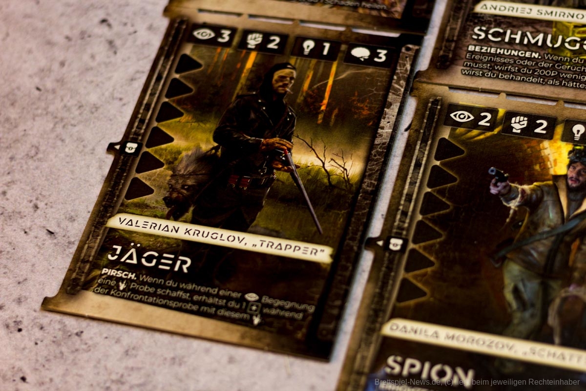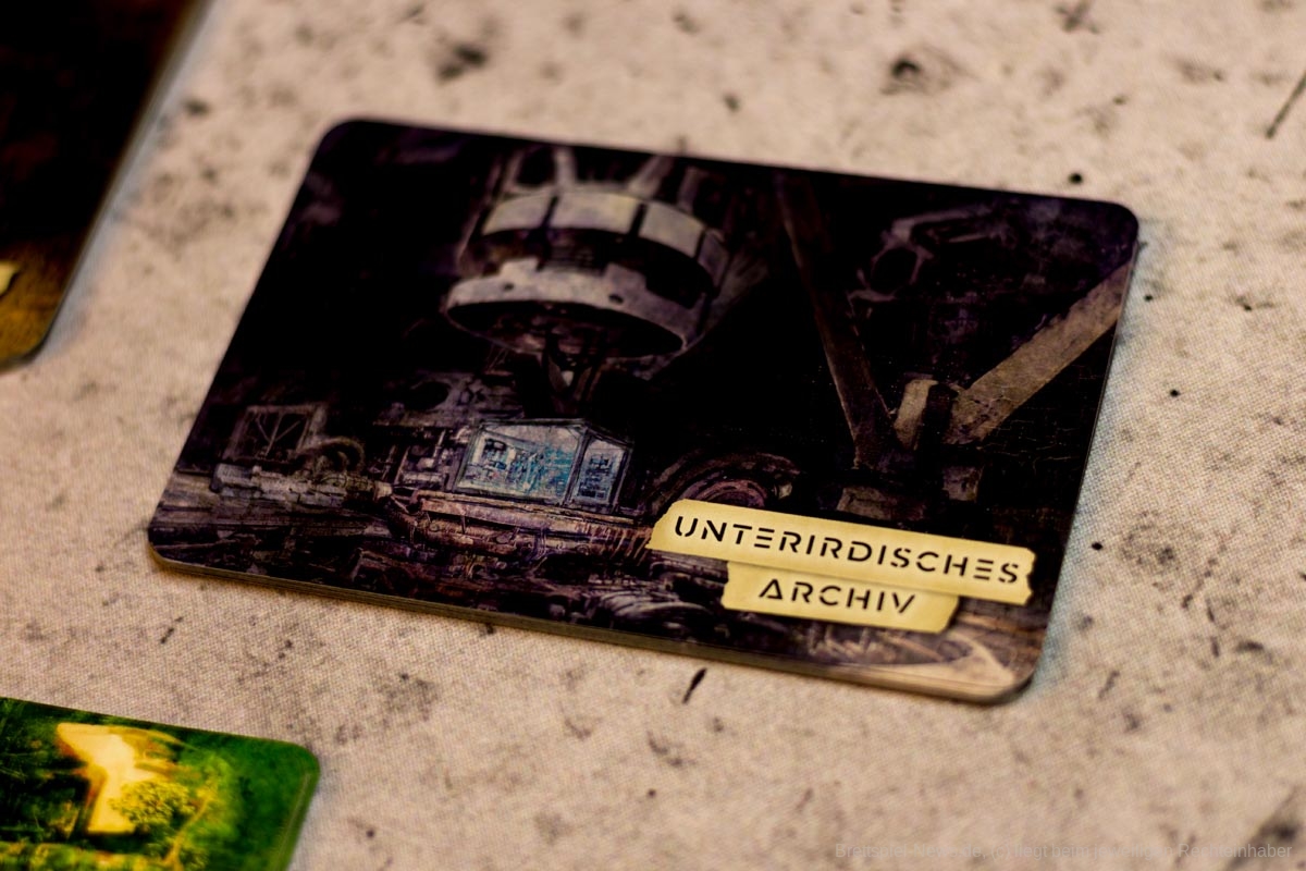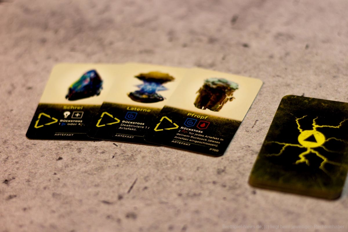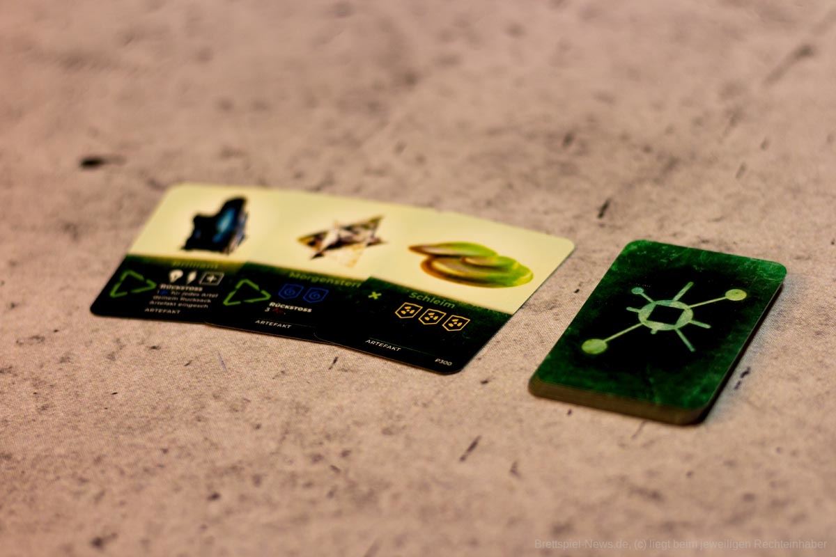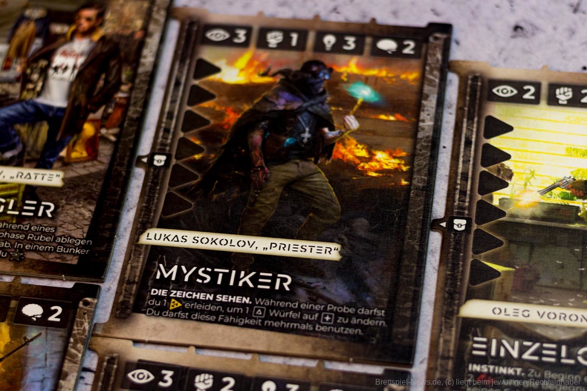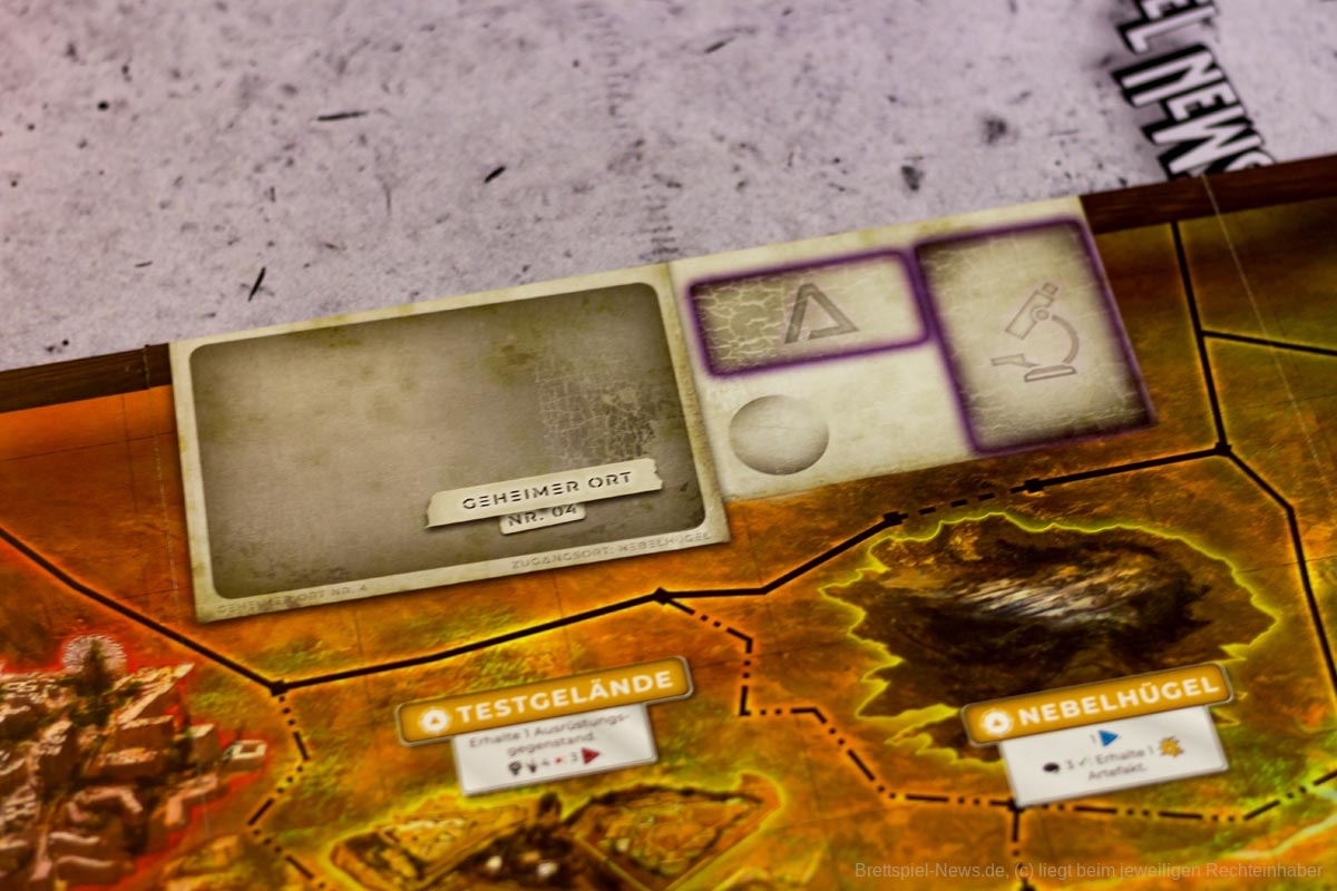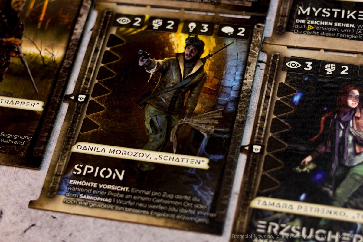 Der Inhalt der Spielschachtel ist umfassend und qualitativ hochwertig. Das beginnt beim passgenauen Schachteleinsatz mit herausnehmbaren Sortierelementen. Mutanten- und Anomalieplättchen können so im Sortiereinsatz direkt neben dem doppelseitigen Spielbrett platziert werden, was den Aufbau beschleunigt. Die zehn detaillierten Miniaturen sind gegen das Umherfallen in der Schachtel mit einem Deckel gesichert. Im gleichen Einsatz finden auch die drei geprägten Würfel Platz. Sowohl die großformatigen als auch die kleinen Karten sind qualitativ hochwertig mit Leinenprägung und guter Materialstärke. Die Ikonographie ist deutlich und leicht verständlich, dennoch liegen dem Spiel große Karten als Spielerhilfen bei und erläutern kurz und ausreichend den Rundenablauf und einzelne Symbole. Pappmarker für Geld und Materialabnutzung sind gut verklebt und fransen nicht aus. Die Stanzungen sind ebenfalls gut und so bleibt kaum etwas beim Auspöppeln der Marker am Stanzrahmen hängen. Die Spielertableaus sind zweigeteilt und qualitativ ebenfalls kompromisslos gut. Kein Verbiegen oder Ausfransen trat bisher auf. Zuletzt sind noch die Erschöpfungsanzeiger für die Spieler zu erwähnen, auch diese bestehen aus fester Pappe und sind gut zentriert gedruckt und gestanzt. Die Plastikniete für den beweglichen Zeiger rastet spürbar ein und bietet angemessenen Widerstand, sodass der Zeiger nicht leicht verrutschen kann.
