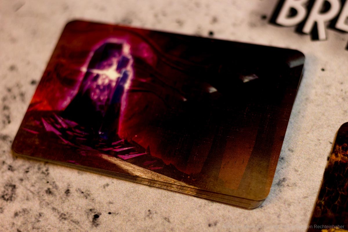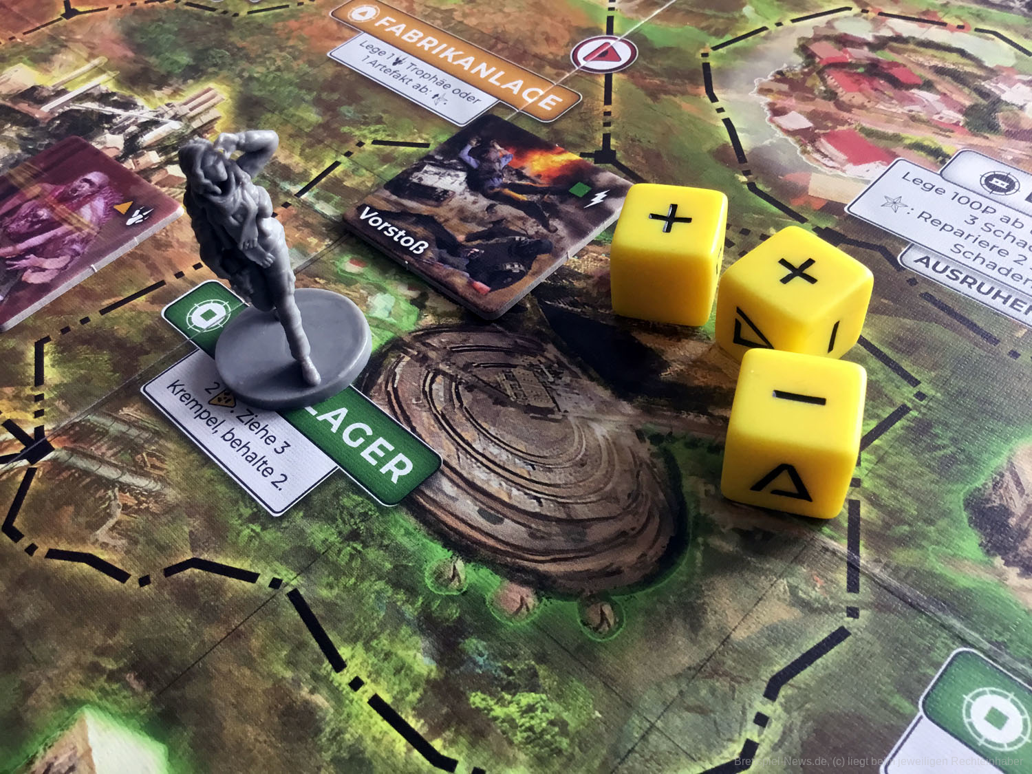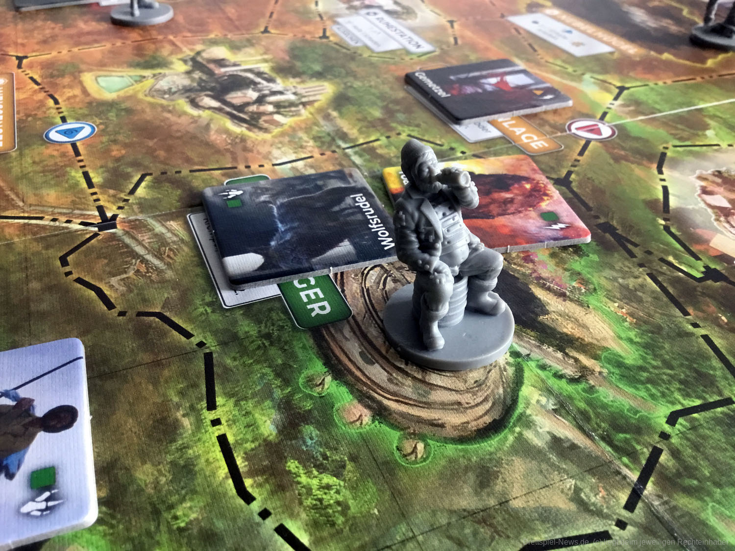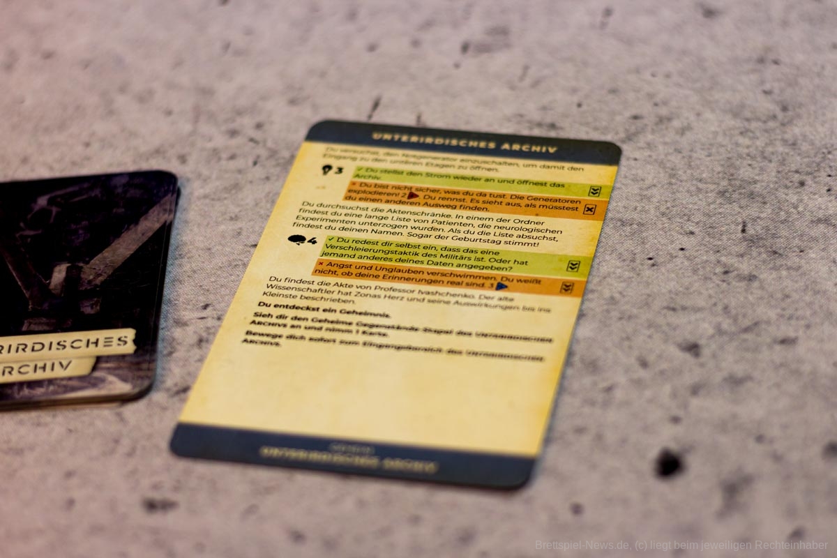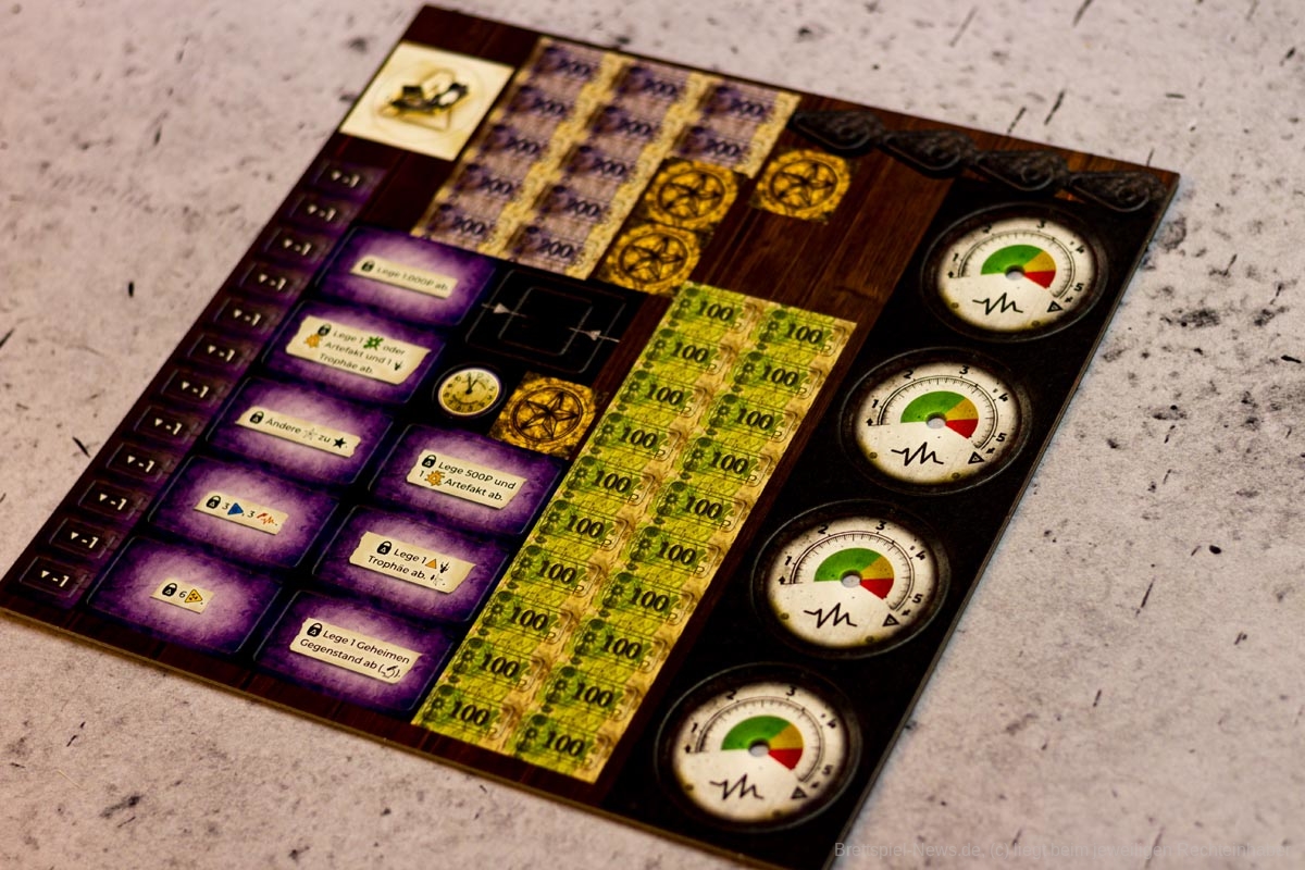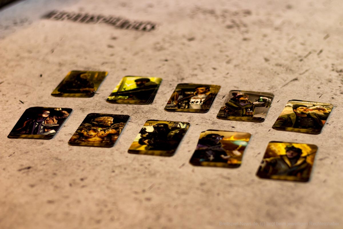 Der Inhalt der Spielschachtel ist umfassend und qualitativ hochwertig. Das beginnt beim passgenauen Schachteleinsatz mit herausnehmbaren Sortierelementen. Mutanten- und Anomalieplättchen können so im Sortiereinsatz direkt neben dem doppelseitigen Spielbrett platziert werden, was den Aufbau beschleunigt. Die zehn detaillierten Miniaturen sind gegen das Umherfallen in der Schachtel mit einem Deckel gesichert. Im gleichen Einsatz finden auch die drei geprägten Würfel Platz. Sowohl die großformatigen als auch die kleinen Karten sind qualitativ hochwertig mit Leinenprägung und guter Materialstärke. Die Ikonographie ist deutlich und leicht verständlich, dennoch liegen dem Spiel große Karten als Spielerhilfen bei und erläutern kurz und ausreichend den Rundenablauf und einzelne Symbole. Pappmarker für Geld und Materialabnutzung sind gut verklebt und fransen nicht aus. Die Stanzungen sind ebenfalls gut und so bleibt kaum etwas beim Auspöppeln der Marker am Stanzrahmen hängen. Die Spielertableaus sind zweigeteilt und qualitativ ebenfalls kompromisslos gut. Kein Verbiegen oder Ausfransen trat bisher auf. Zuletzt sind noch die Erschöpfungsanzeiger für die Spieler zu erwähnen, auch diese bestehen aus fester Pappe und sind gut zentriert gedruckt und gestanzt. Die Plastikniete für den beweglichen Zeiger rastet spürbar ein und bietet angemessenen Widerstand, sodass der Zeiger nicht leicht verrutschen kann.