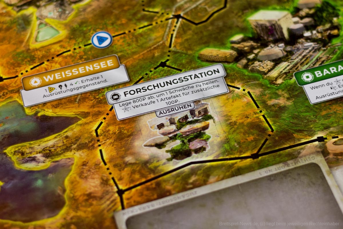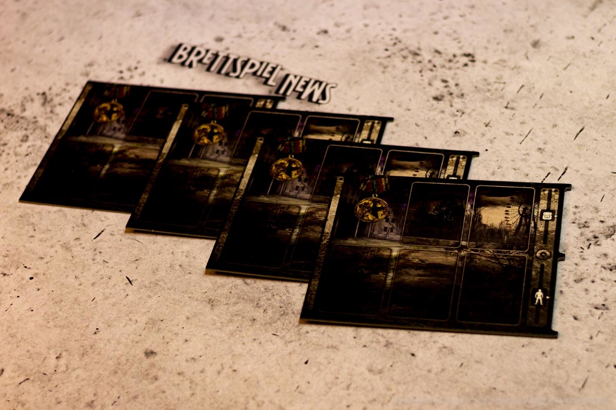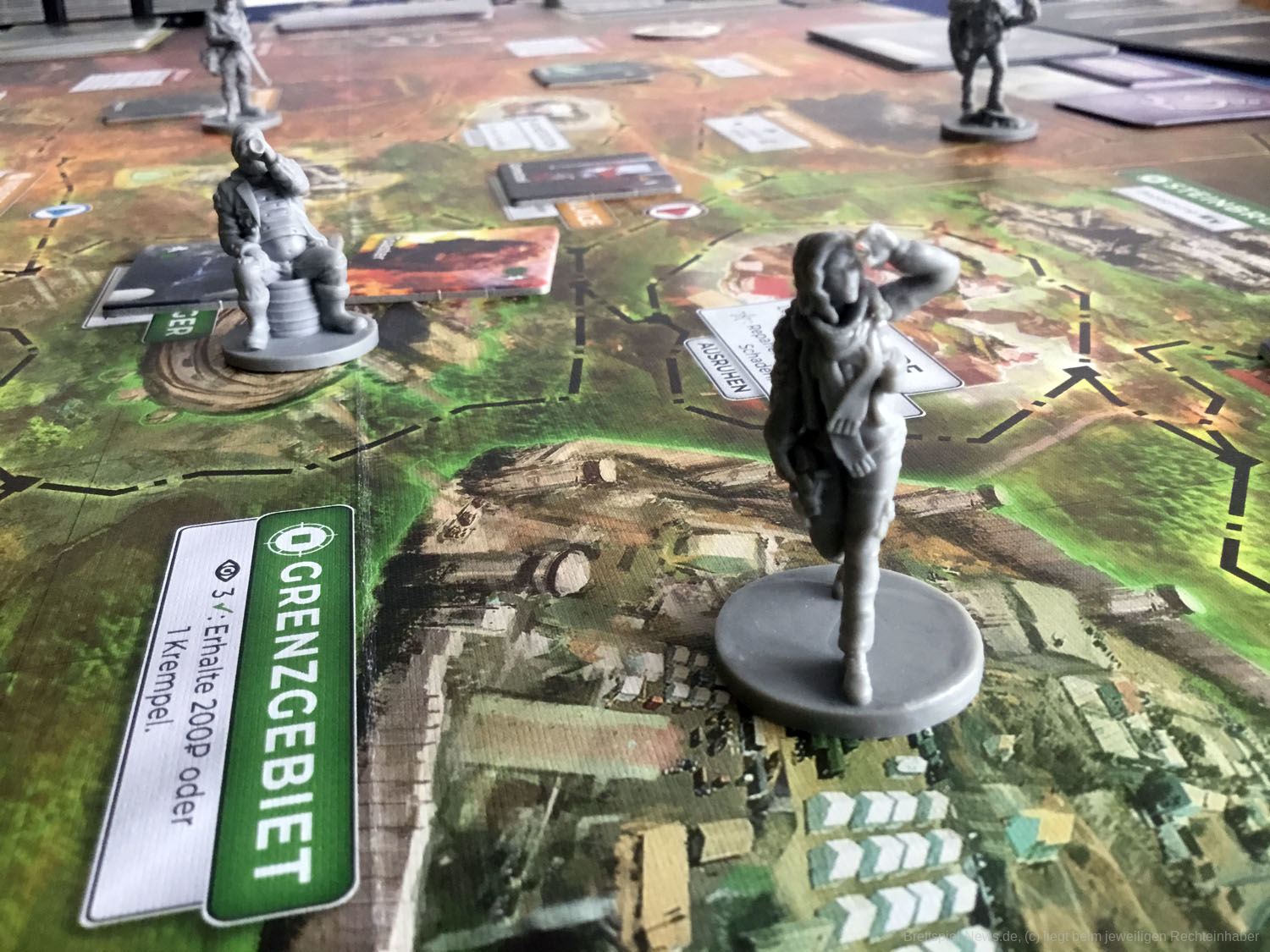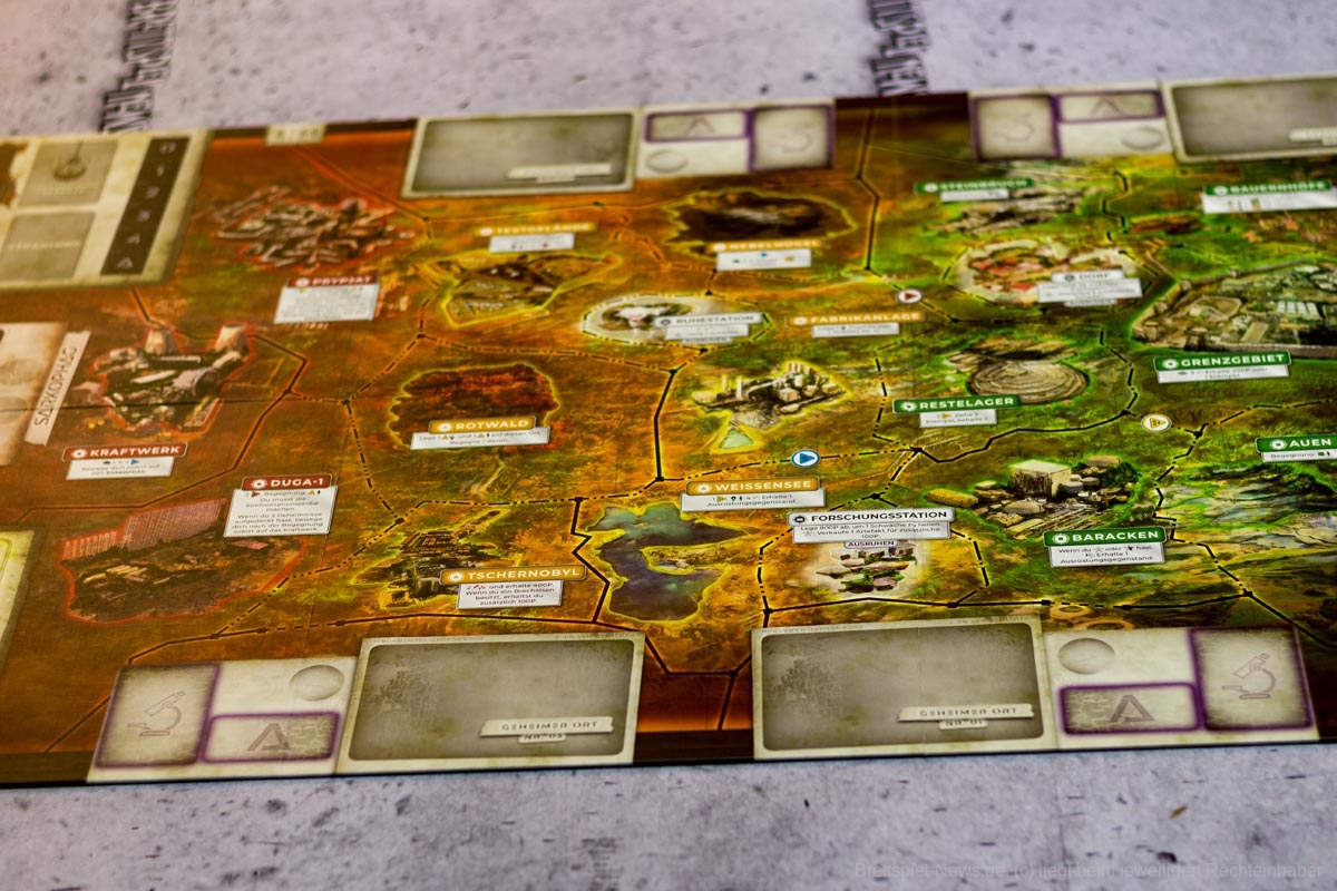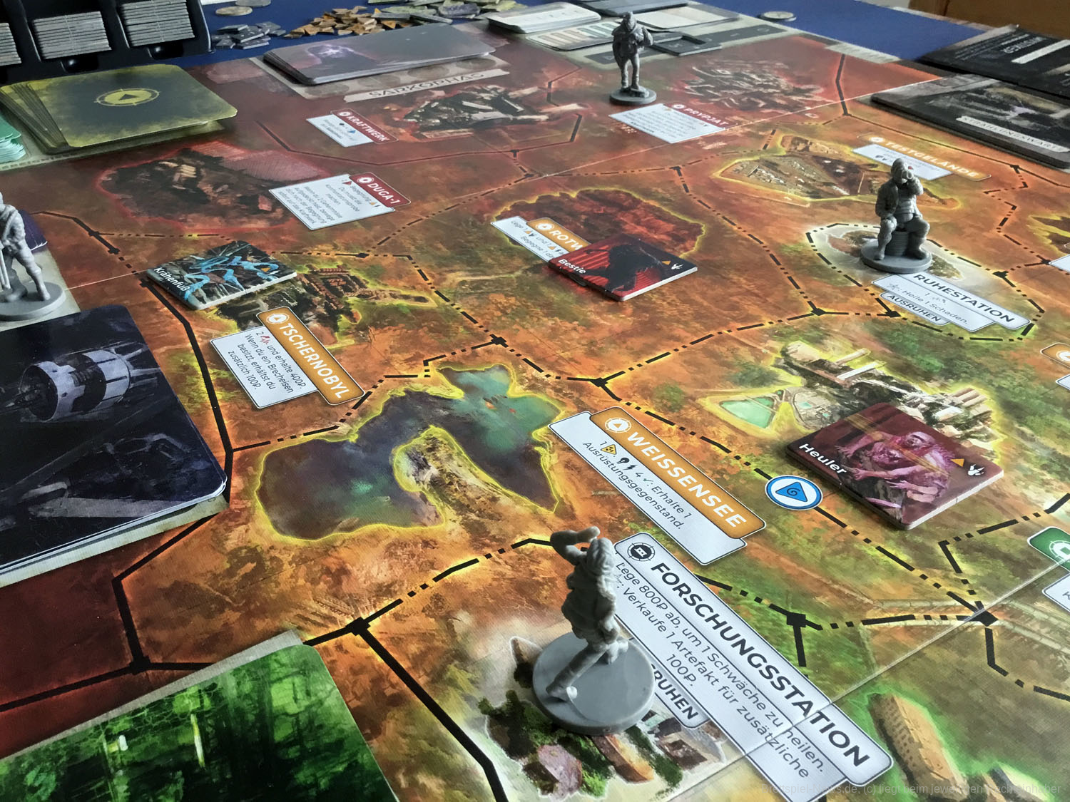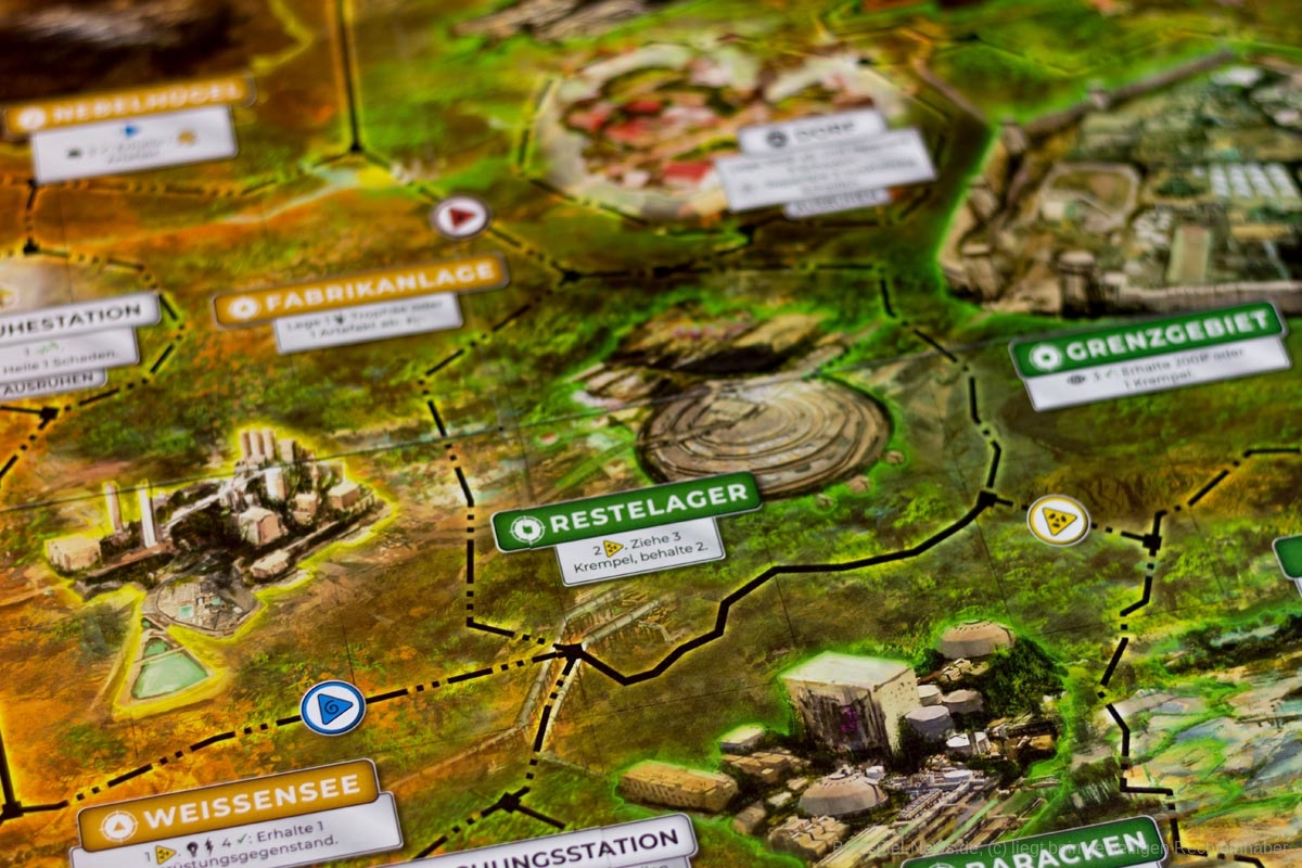 Den Kennern von Arkham und Eldritch Horror dürften die Ähnlichkeiten bereits aufgefallen sein. In ZONA bewegen sich die Spieler von Ort zu Ort, besiegen Mutanten und Anomalien statt Lovecraft’sche Gruselgestalten und sammeln Gegenstände, um sich letztlich aufgerüstet auf den Weg zum Sarkophag zu machen und das Spiel für sich zu gewinnen. Der leichte Wettrenncharakter ist angenehm und hält die Spannung hoch. Immer wieder muss dabei den Strahlungswellen ausgewichen werden und verschiedene Orte müssen angesteuert werden, um genügend „Hinweise“ für die finale Reise zum Reaktor zu sammeln. Immer wieder verbrauchen sich normale und übernatürliche Ausrüstungsgegenstände und die clevere Kombination von Effekten kann über Leben und Tod entscheiden. Die eigene Reputation ist dabei sehr wichtig, entscheidet sie doch über das Warenangebot und den Umfang mancher Ortsaktionen. Auf diese Weise werden die Spieler ebenfalls angenehm im Spielfortschritt behindert.