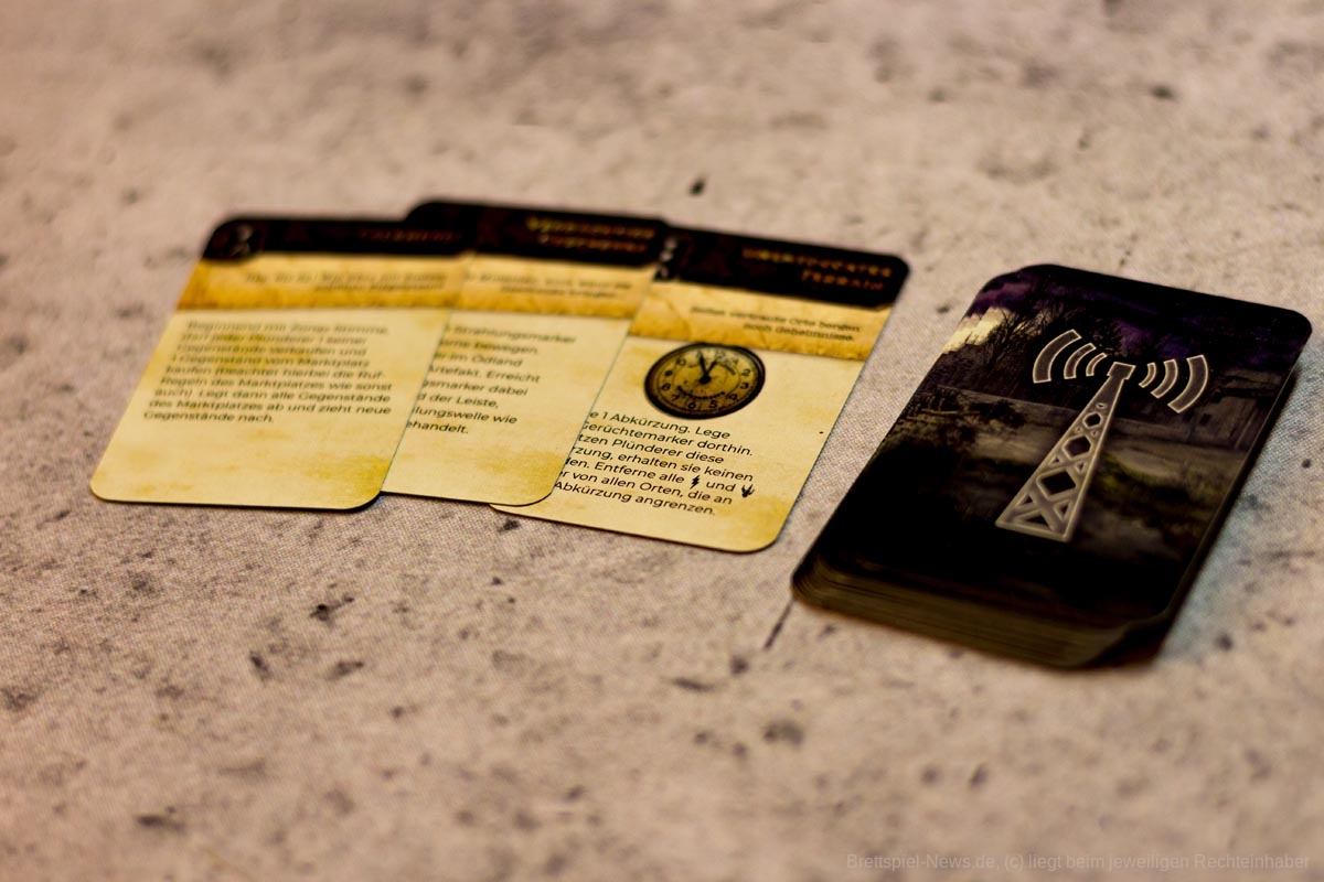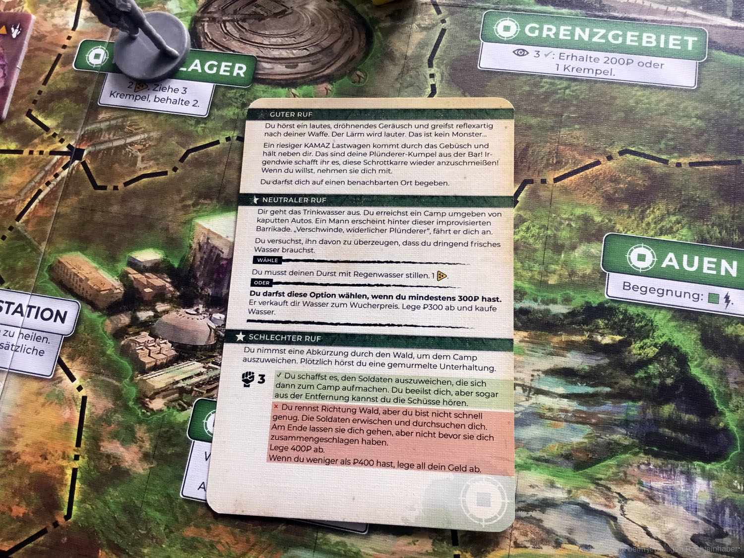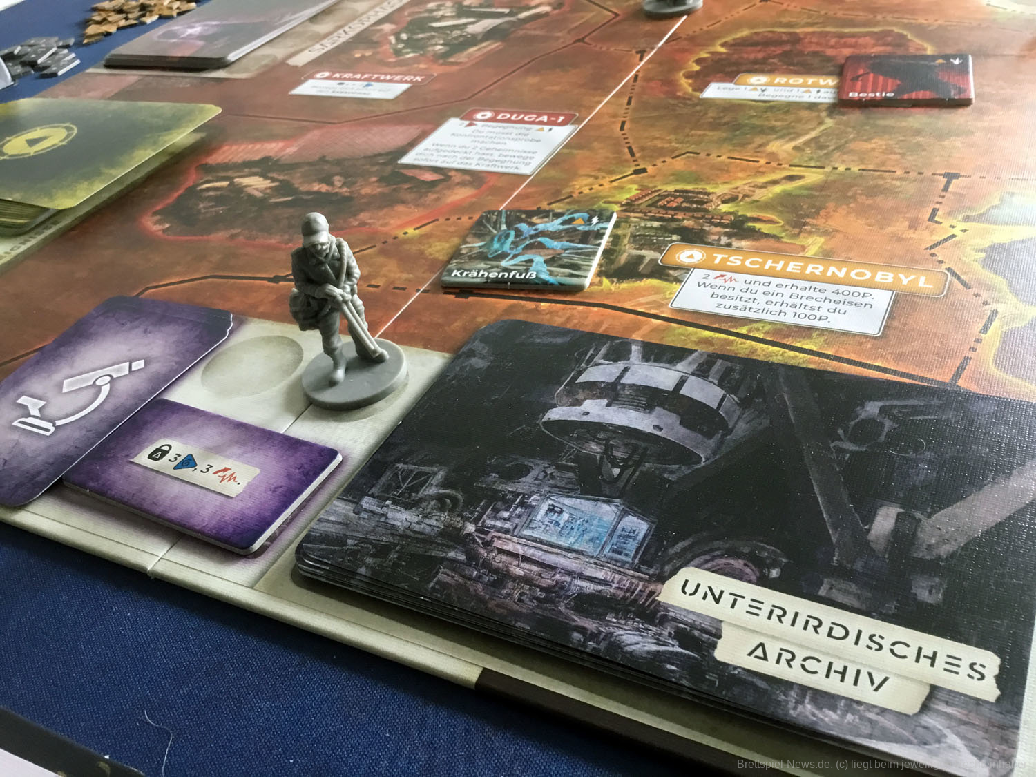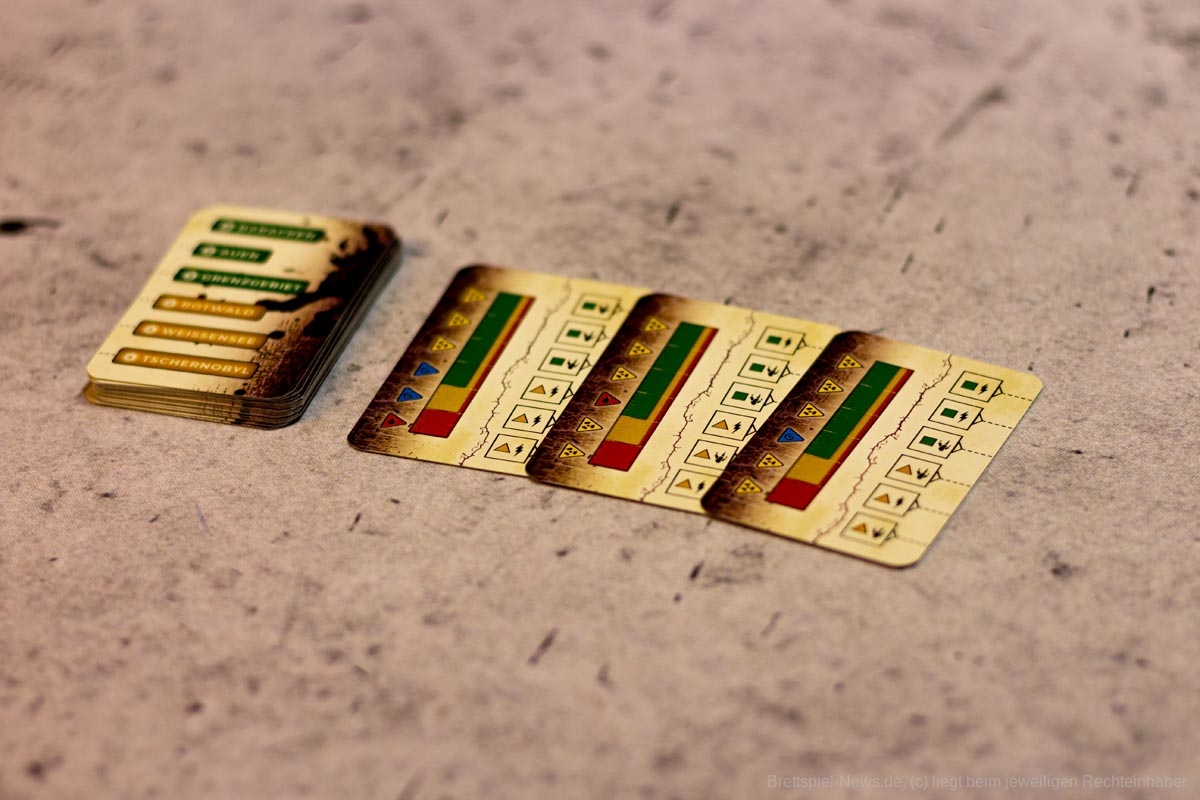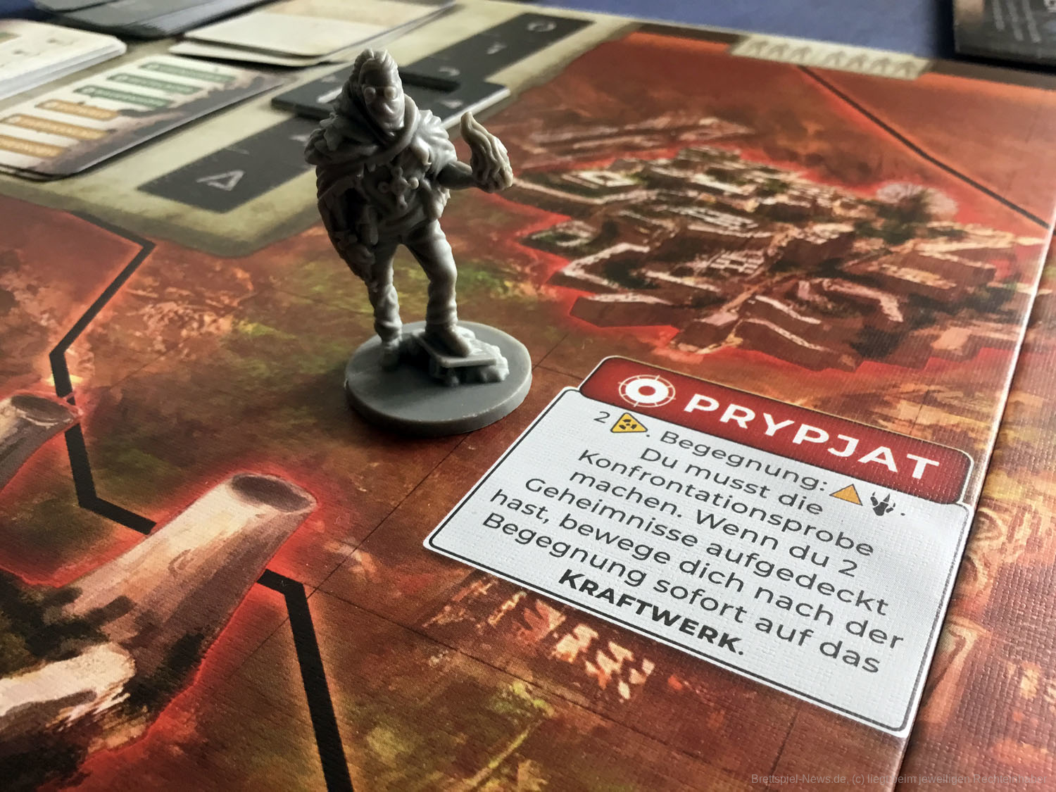 Den Kennern von Arkham und Eldritch Horror dürften die Ähnlichkeiten bereits aufgefallen sein. In ZONA bewegen sich die Spieler von Ort zu Ort, besiegen Mutanten und Anomalien statt Lovecraft’sche Gruselgestalten und sammeln Gegenstände, um sich letztlich aufgerüstet auf den Weg zum Sarkophag zu machen und das Spiel für sich zu gewinnen. Der leichte Wettrenncharakter ist angenehm und hält die Spannung hoch. Immer wieder muss dabei den Strahlungswellen ausgewichen werden und verschiedene Orte müssen angesteuert werden, um genügend „Hinweise“ für die finale Reise zum Reaktor zu sammeln. Immer wieder verbrauchen sich normale und übernatürliche Ausrüstungsgegenstände und die clevere Kombination von Effekten kann über Leben und Tod entscheiden. Die eigene Reputation ist dabei sehr wichtig, entscheidet sie doch über das Warenangebot und den Umfang mancher Ortsaktionen. Auf diese Weise werden die Spieler ebenfalls angenehm im Spielfortschritt behindert.
