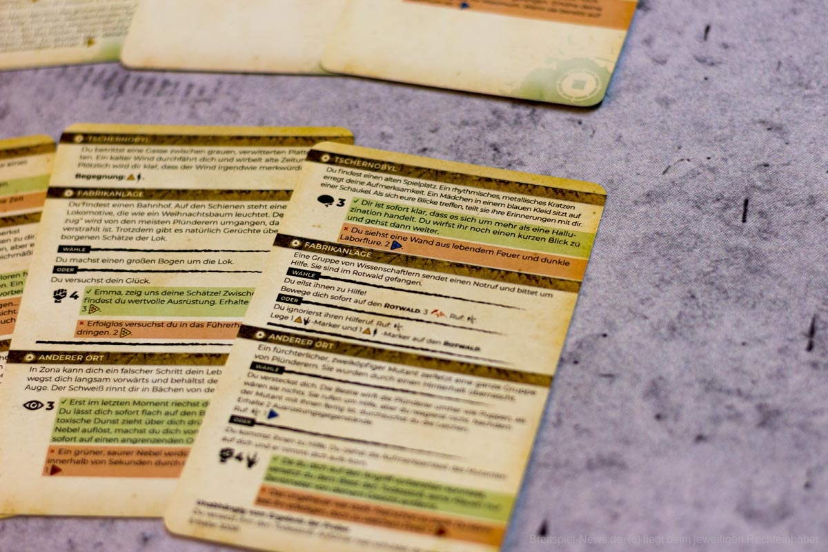 Haben alle Spieler gehandelt, folgt die Ereignisphase. Entsprechend ihrer Position ziehen alle Spieler eine Ereigniskarte vom jeweiligen Stapel und handeln die Ereignisse für ihren Ort ab. Zonas Stimme deckt eine Karte vom Gerüchtestapel auf. Die Strahlung steigt um die darauf angezeigte Menge. Sollte der Marker dadurch auf das letzte Feld der Leiste gelangen, wird eine Strahlungswelle ausgelöst. Dann wird eine Strahlungskarte gezogen und umgedreht auf den Ablageplatz gelegt. Zusammen mit dem Strahlungsstapel ergibt sich der Schaden der Strahlungswelle. Spieler außerhalb von Bunkern erhalten den Schaden entsprechend ihrer Position auf dem Spielbrett, dann werden alle Gefahrenplättchen abgeräumt und entsprechend der Strahlungskarte neue Mutanten und Anomalien verteilt.