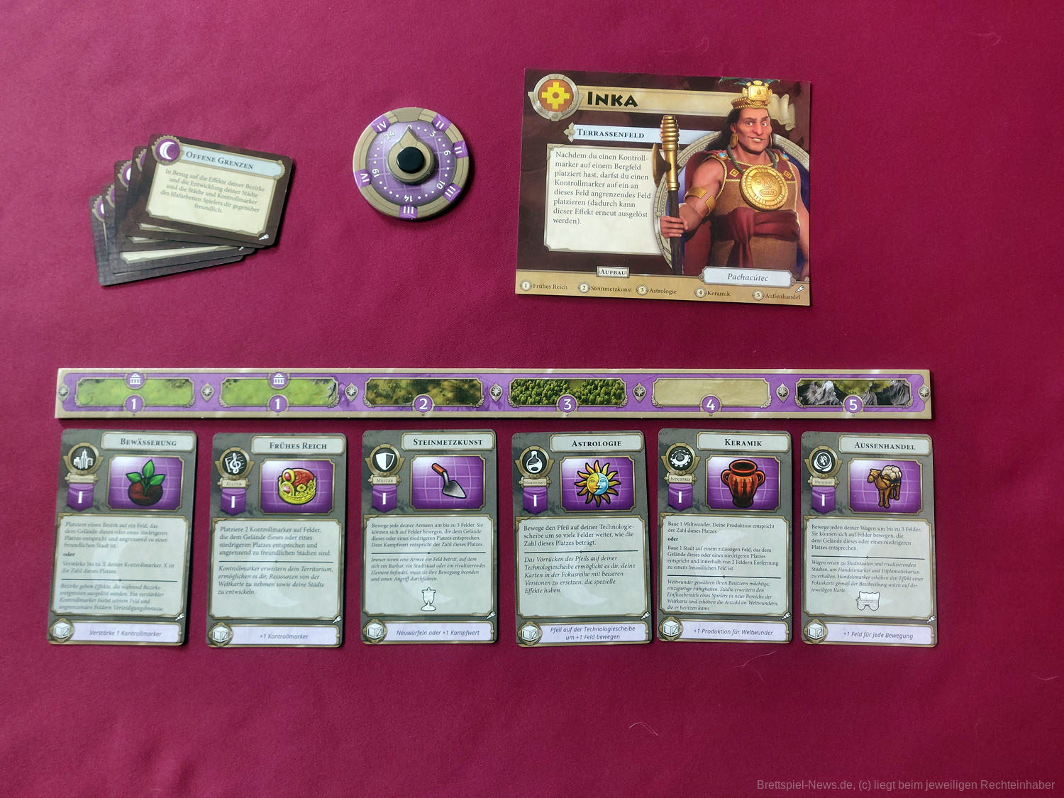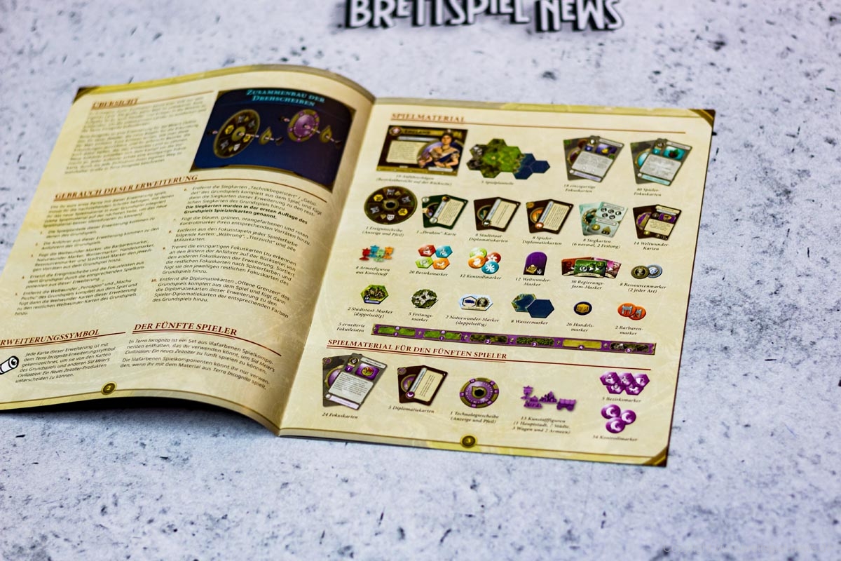 Die vielen Neuerungen und Veränderungen durch die TERRA INCOGNITA Erweiterung bringen eine ganze Fülle an neuem Material mit sich. Neben den bereits erwähnten neuen Siegkarten, Hauptstadt-Spielplanteilen, Festungen, Regierungsform-, Bezirks- und Armeemarkern sowie den neuen Fokuskarten, findet sich noch mehr Neues in der Erweiterungsbox. Es gibt zehn neue Anführerbögen mit einer Bezirksübersicht auf der Rückseite. Außerdem gibt es neben dem Spielmaterial für eine fünfte Person noch mehr von dem, was bereits im Grundspiel vertreten war. Neue Weltwunder, Diplomatiekarten für Spieler und Stadtstaaten, erweiterte Fokusleisten, mehr Ressourcen-, Naturwunder-, Kontroll-, Handels- und Barbarenmarker sowie mehr Wasserfelder und Naturwunder sind vorhanden.
